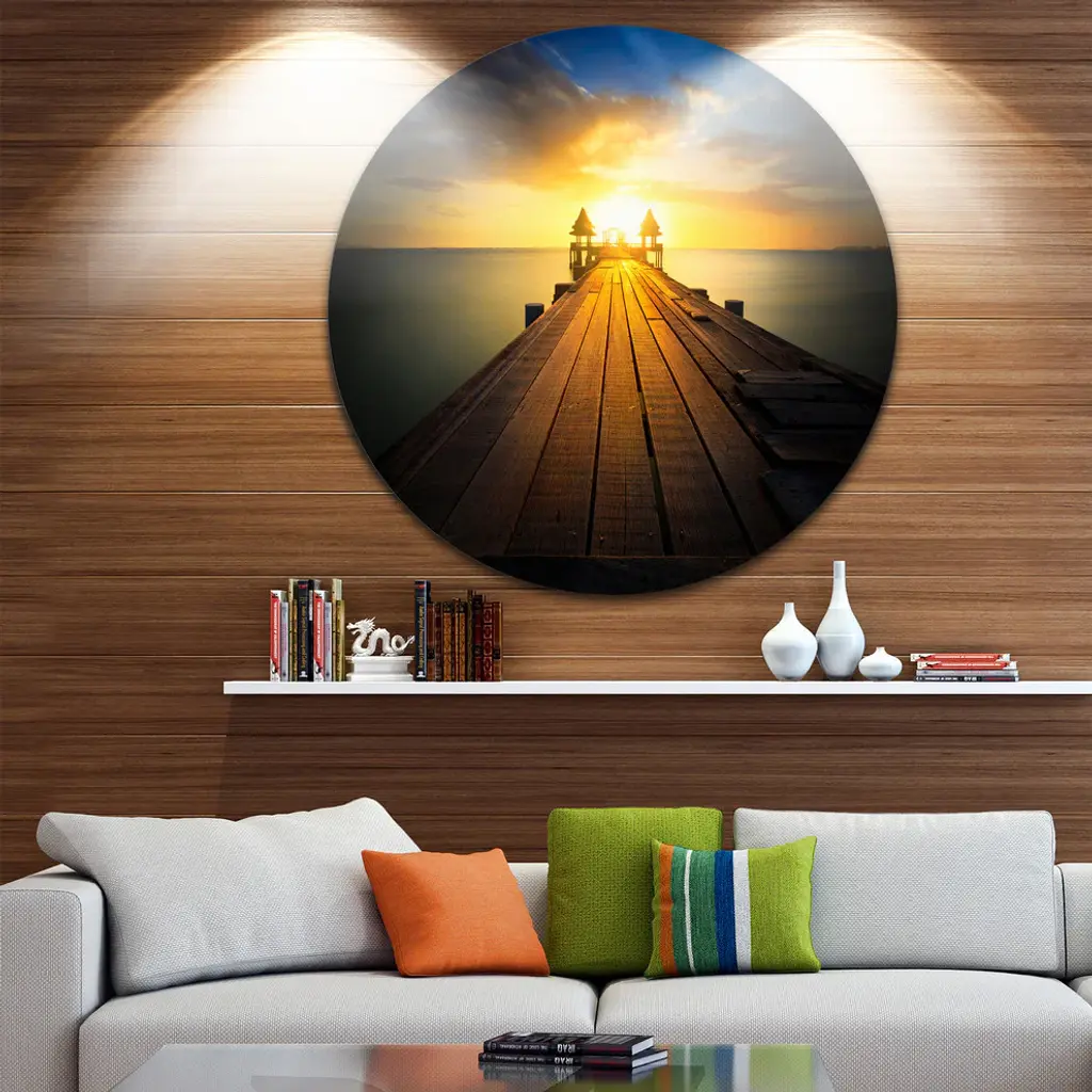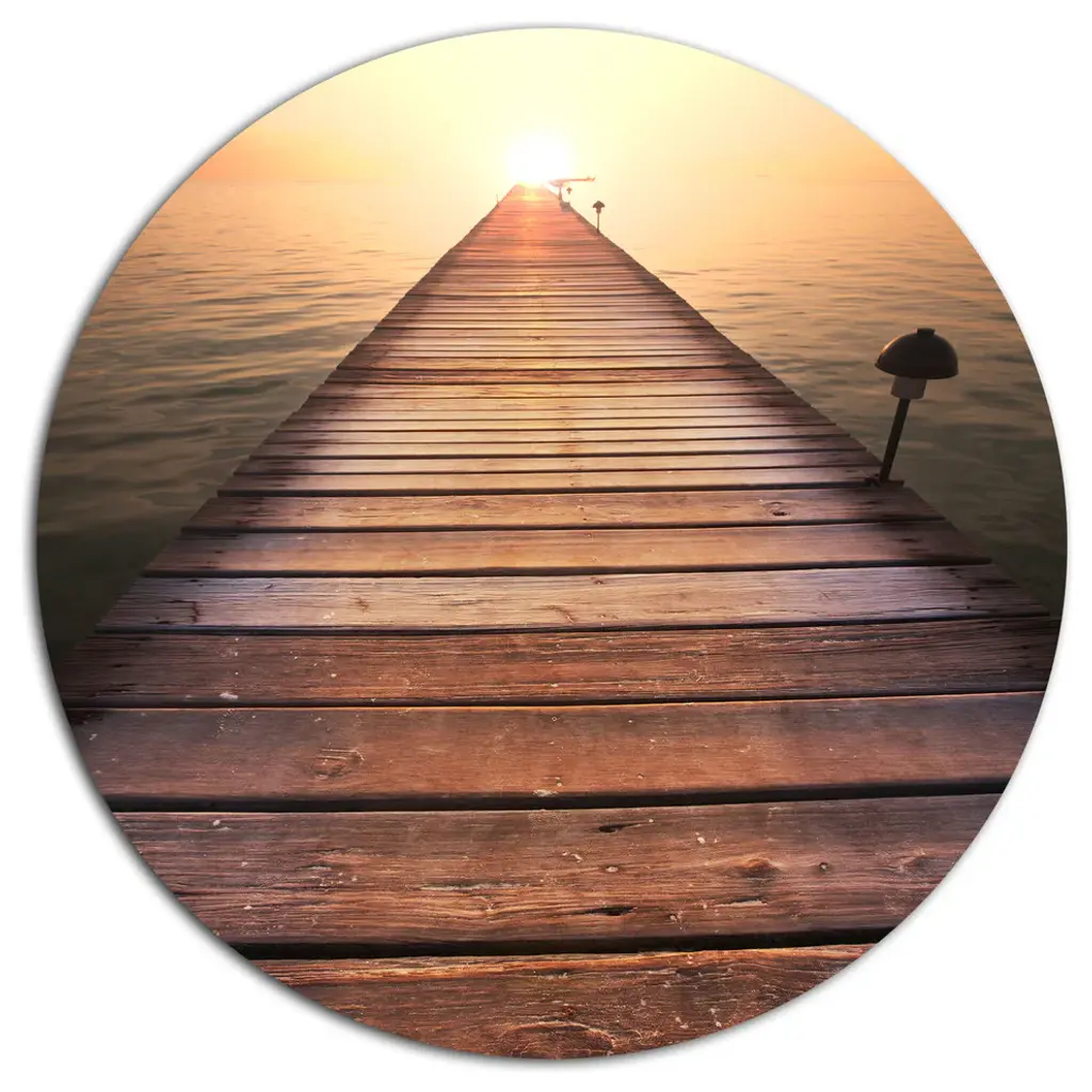 Bring Contemporary Abstraction to your home with this large Circle Metal wall art. This Massive Wood Pier to Sun at Evening Metal Artwork makes it the focal point of any room or office. - White Gloss Coating ensures colors are extra vibrant with light reflection.- Aluminum grade Sheet Metal with 1 inch mounting frame on the back giving the illusion that the artwork is floating on the wall..- Mounting Brackets are included along with instructions.- High Quality Digital images are created directly into a glossy aluminum panel producing a stunning and captivating print into the glossy finish of the metal.- Water, Fire and Scratch resistant HD Aluminum panels.- Looks better than any photo paper and guaranteed to last at least 20 years- Easy to clean with a microfiber cloth. Colors are far superior to regular Canvas Art. - Easy to Hang