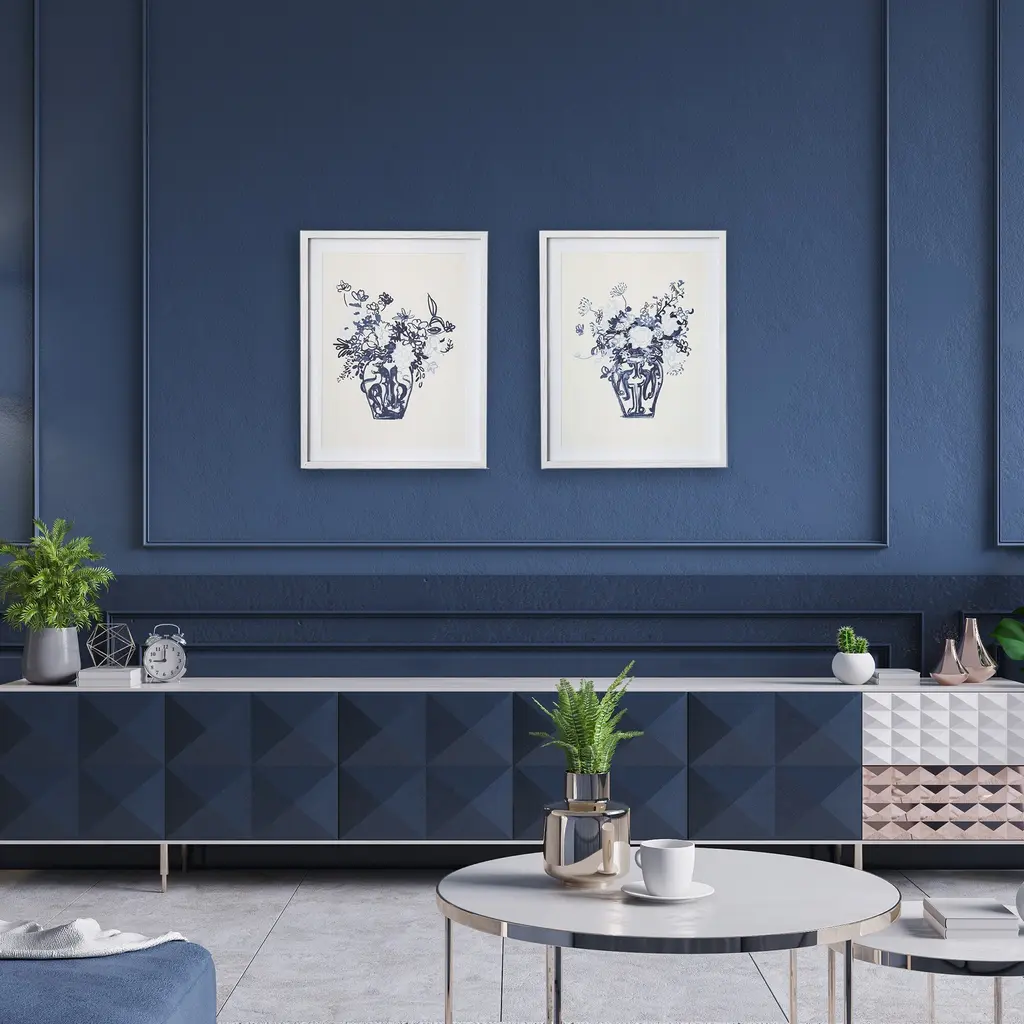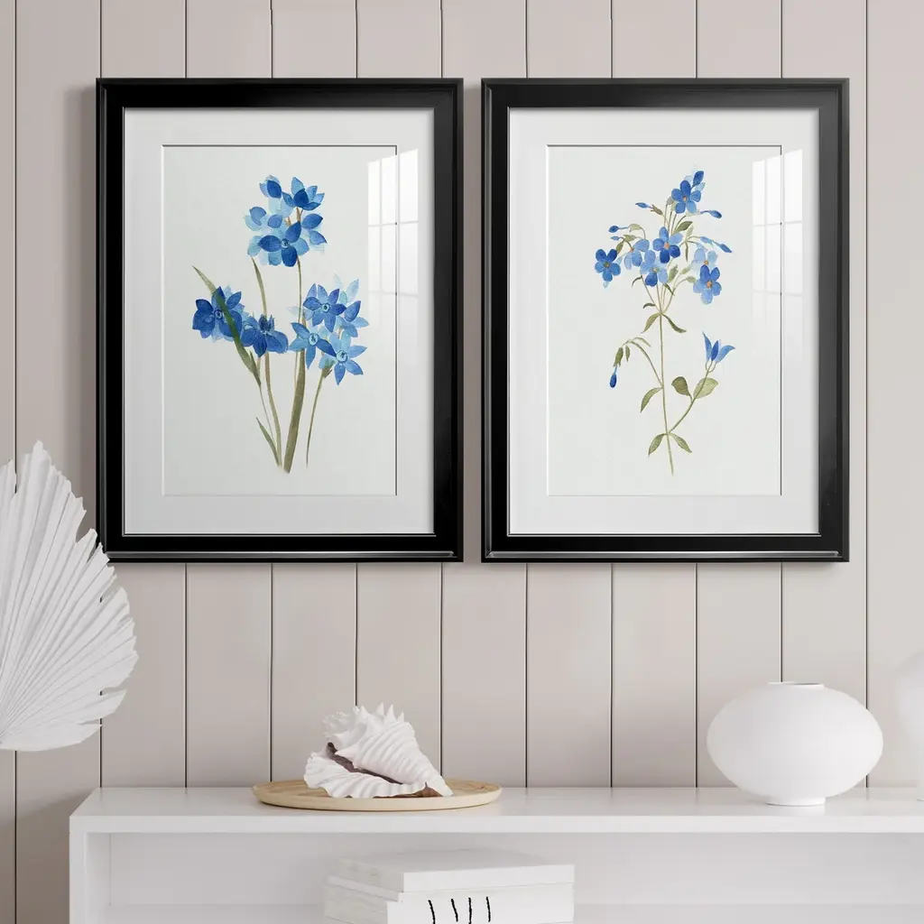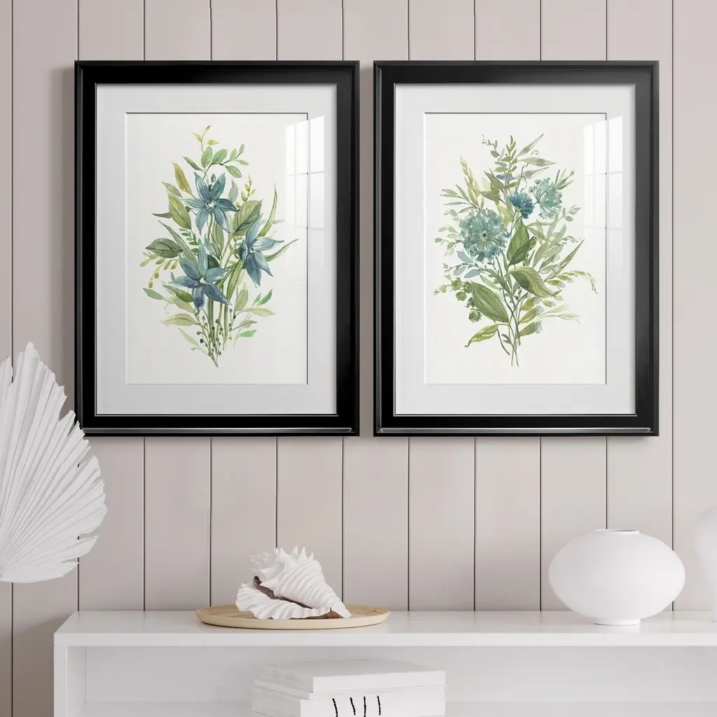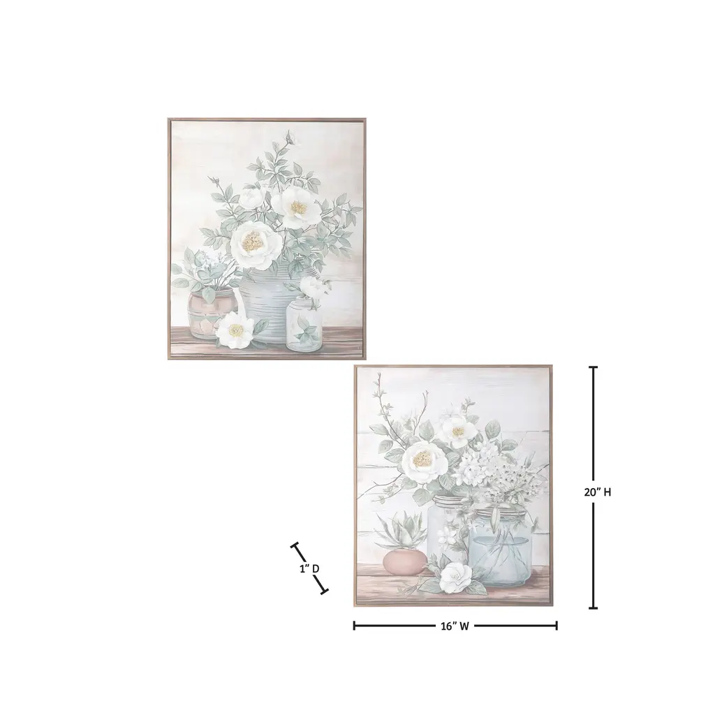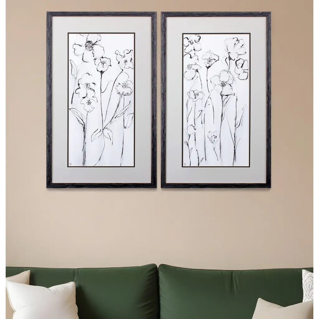 This monochromatic whimsical pair of floral arrangements are a sweet duo. Finished off with a crisp white mat and white pine frames, they are a great choice for bedroom, study or guest bath.