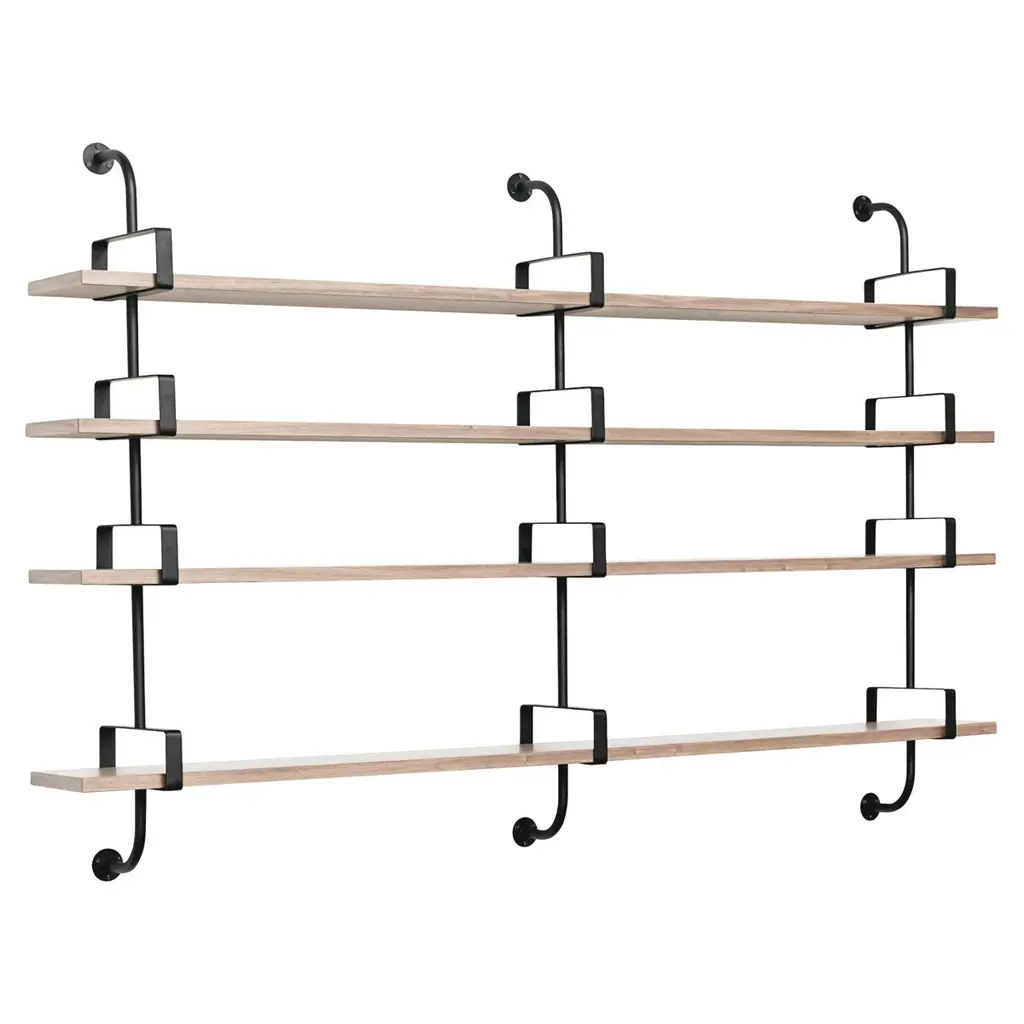 Mathieu Matégot 'Démon' 4-Shelf System for GUBI in Black Stained Ash 215cm shelf length.The Démon Shelf, or the Biblio-Démon in Matégot’s original 1954 sketches, was part of a “plan d’execution de la bibliothèque," or his ideal model of an interior home library and study.This authorized re-edition for GUBI is executed in three wood veneer finishes and powder-coated steel brackets. This modular shelving system can be customized in multiple ways for a wide range of spaces to provide elegant storage and display options. Shelves are available in three different lengths and systems of 1, 3, 4 or 5 shelves to accommodate a wide range of books and objects.A legend of mid-century design, French-Hungarian Mathieu Matégot studied fine arts and design before rising to prominence with his handcrafted furnishings in postwar France. His iconic designs are highly sought after by collectors in the know.Price is per item. The large-sized shelf system (84.6" wide or 215cm) is supported by 3 metal brackets, while the medium (61" wide) and small sized (37.4" wide) versions come equipped with 2 brackets. Please specify size when ordering. Prices vary. This listing price is for the 215cm longest variant with four shelves and three brackets.In-stock lead-time 6-8 weeks. Out of stock lead time or lead time for other variations can take several weeks more. Please note in-stock availability can change at any time. Please contact us for current lead time prior to placing time-sensitive orders.Made to order.