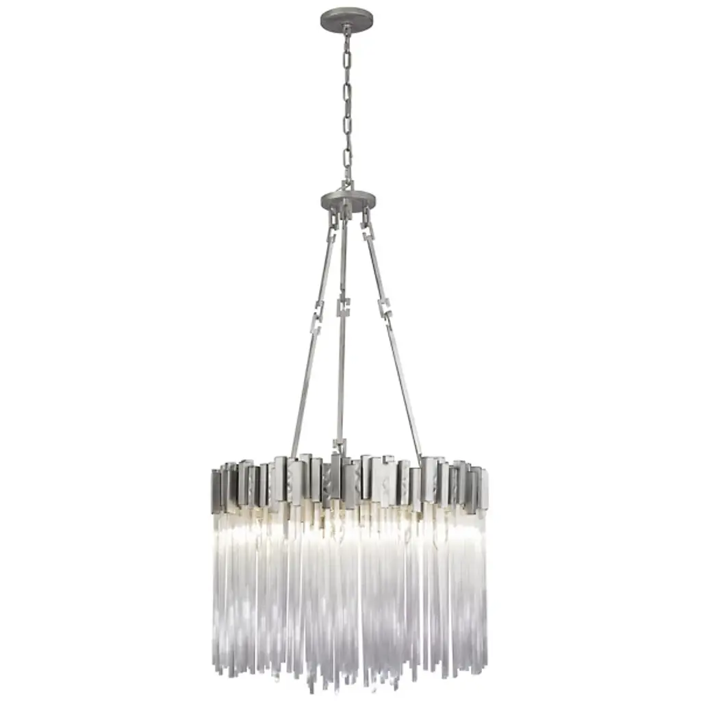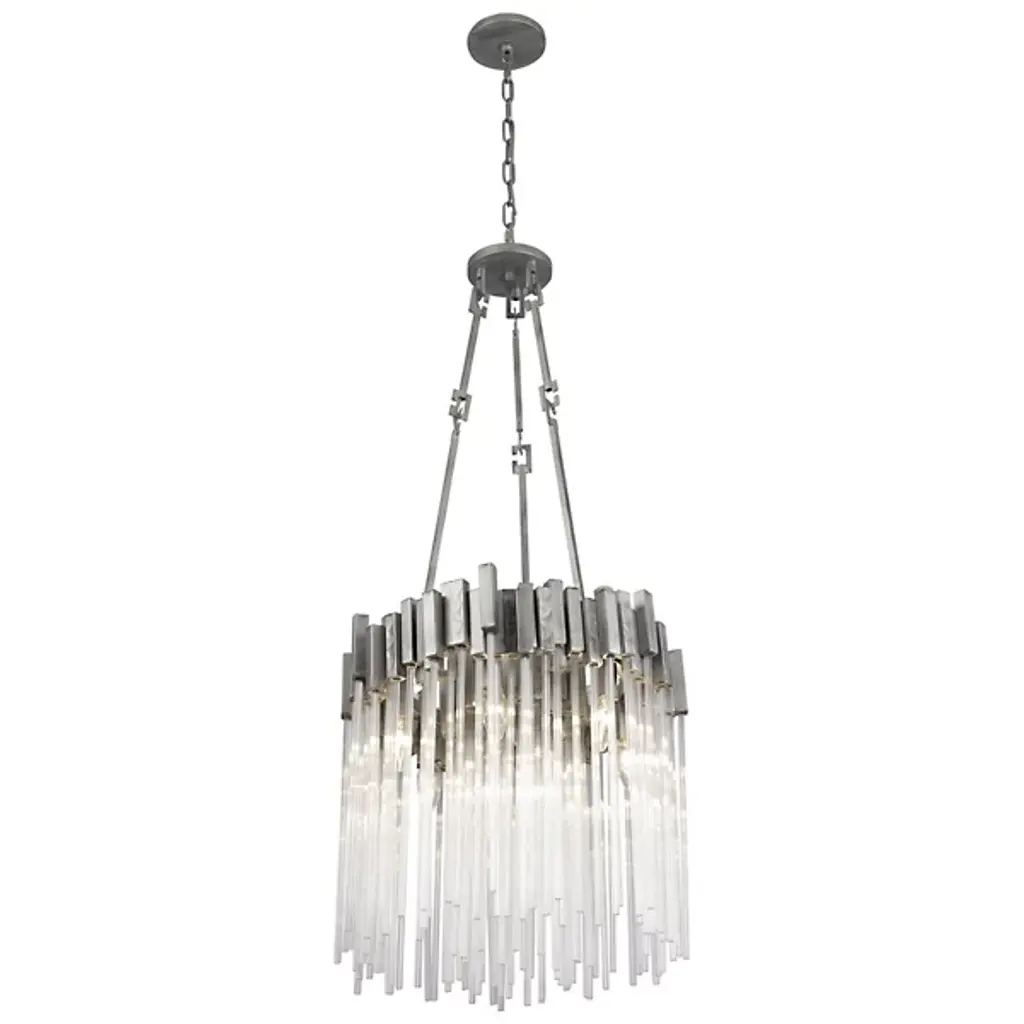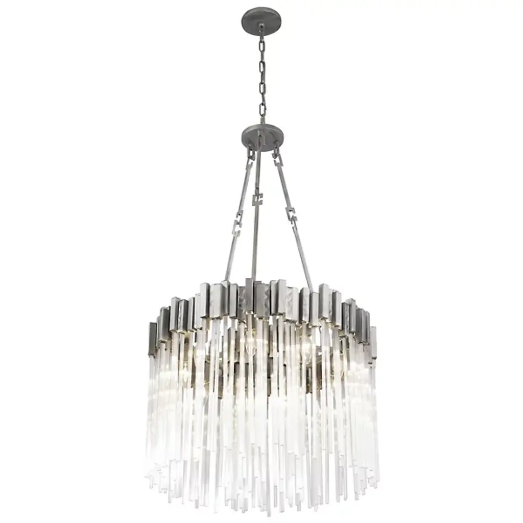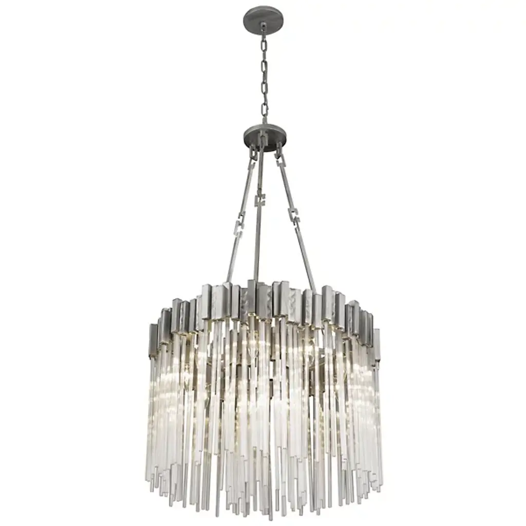 The Varaluz Matrix Pendant brings eclectic elegance to a modern dining room, bedroom or living room. Like a one-of-a-kind artwork, this high drama design showcases a unique cityscape sculpture in hammered and smooth Steel with a cascade of clear Glass rods bringing an extra warm glow to the inner circle of lights.