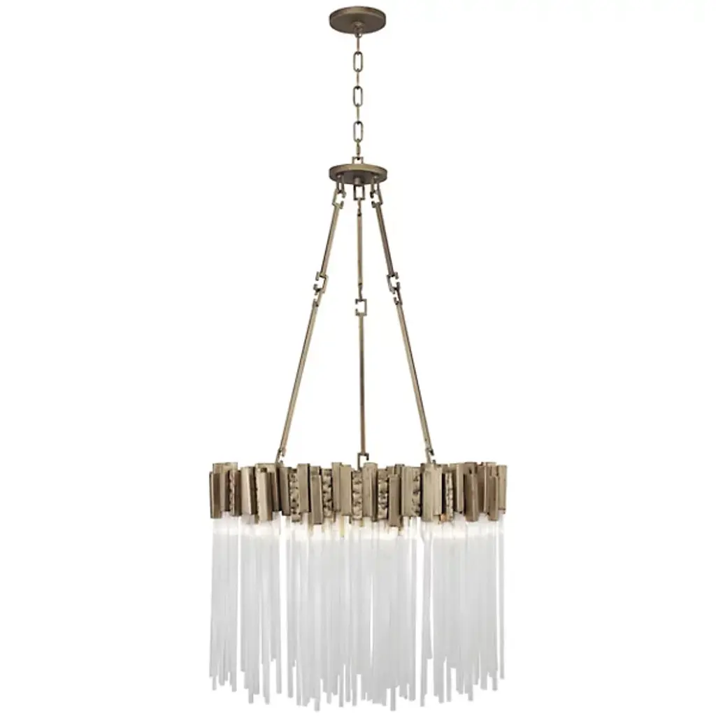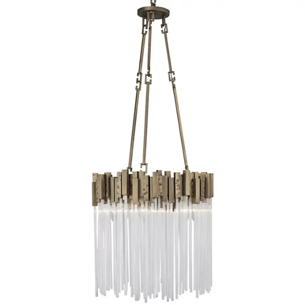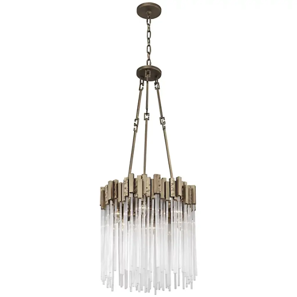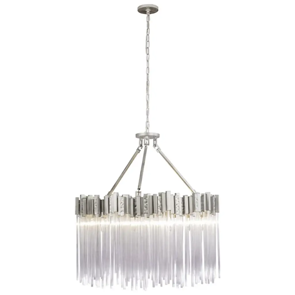 The Varaluz Matrix Pendant brings eclectic elegance to a modern dining room, bedroom or living room. Like a one-of-a-kind artwork, this high drama design showcases a unique cityscape sculpture in hammered and smooth Steel with a cascade of clear Glass rods bringing an extra warm glow to the inner circle of lights.