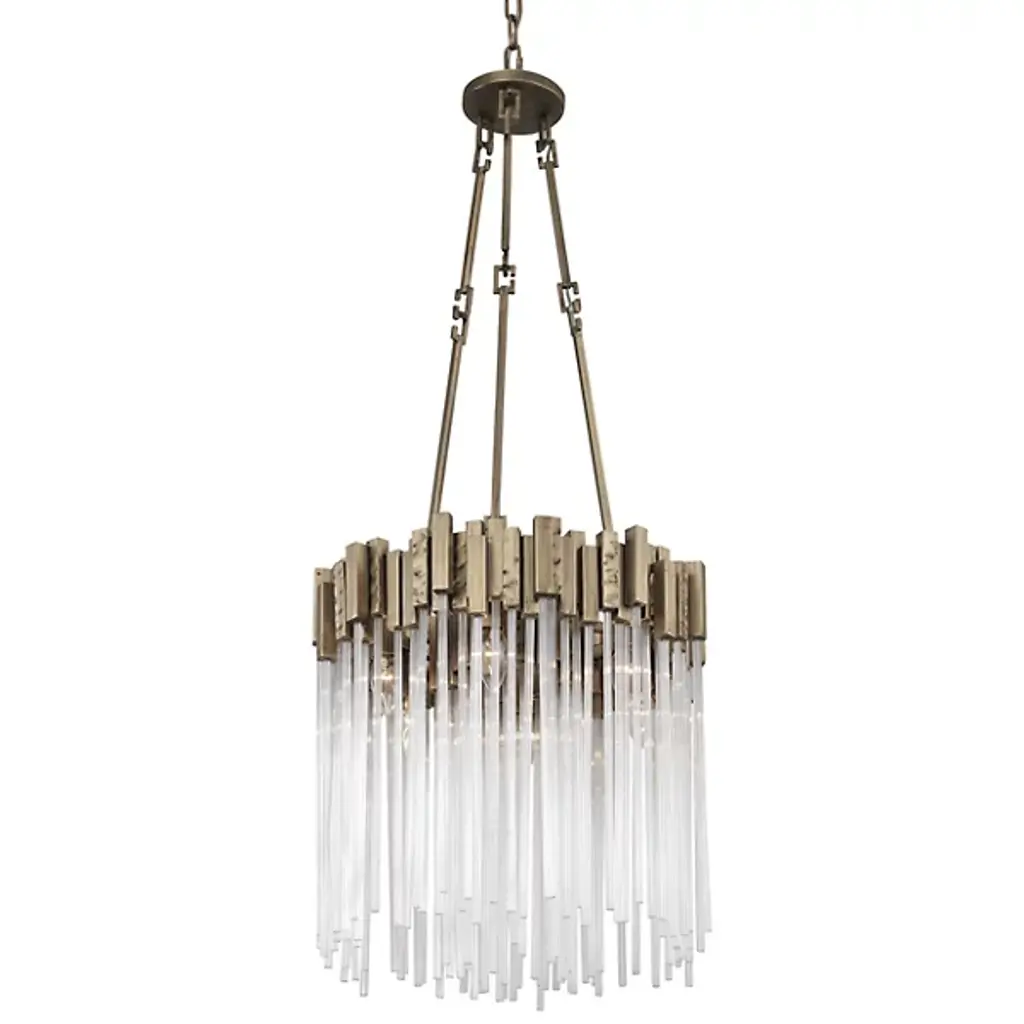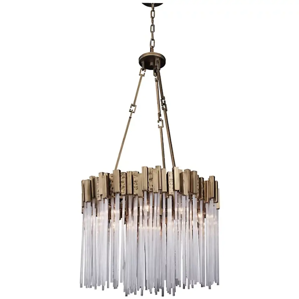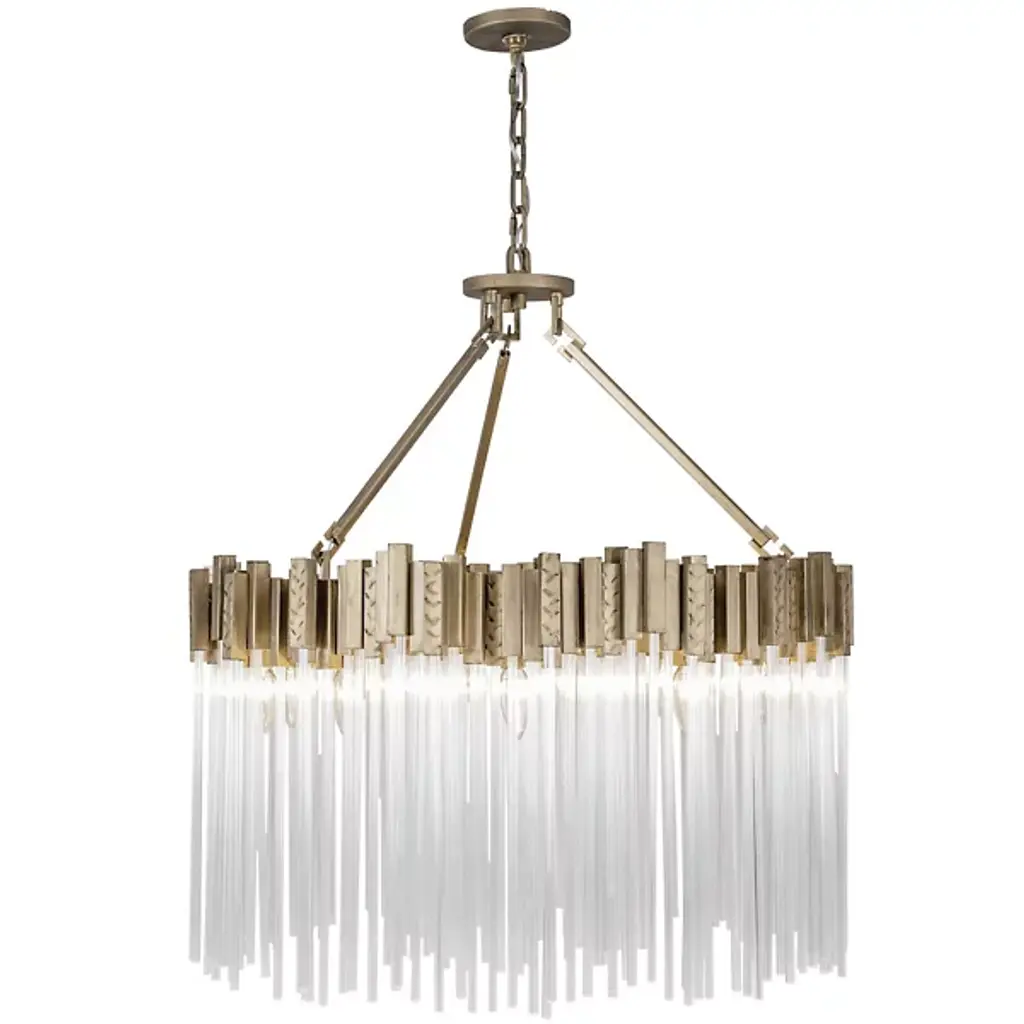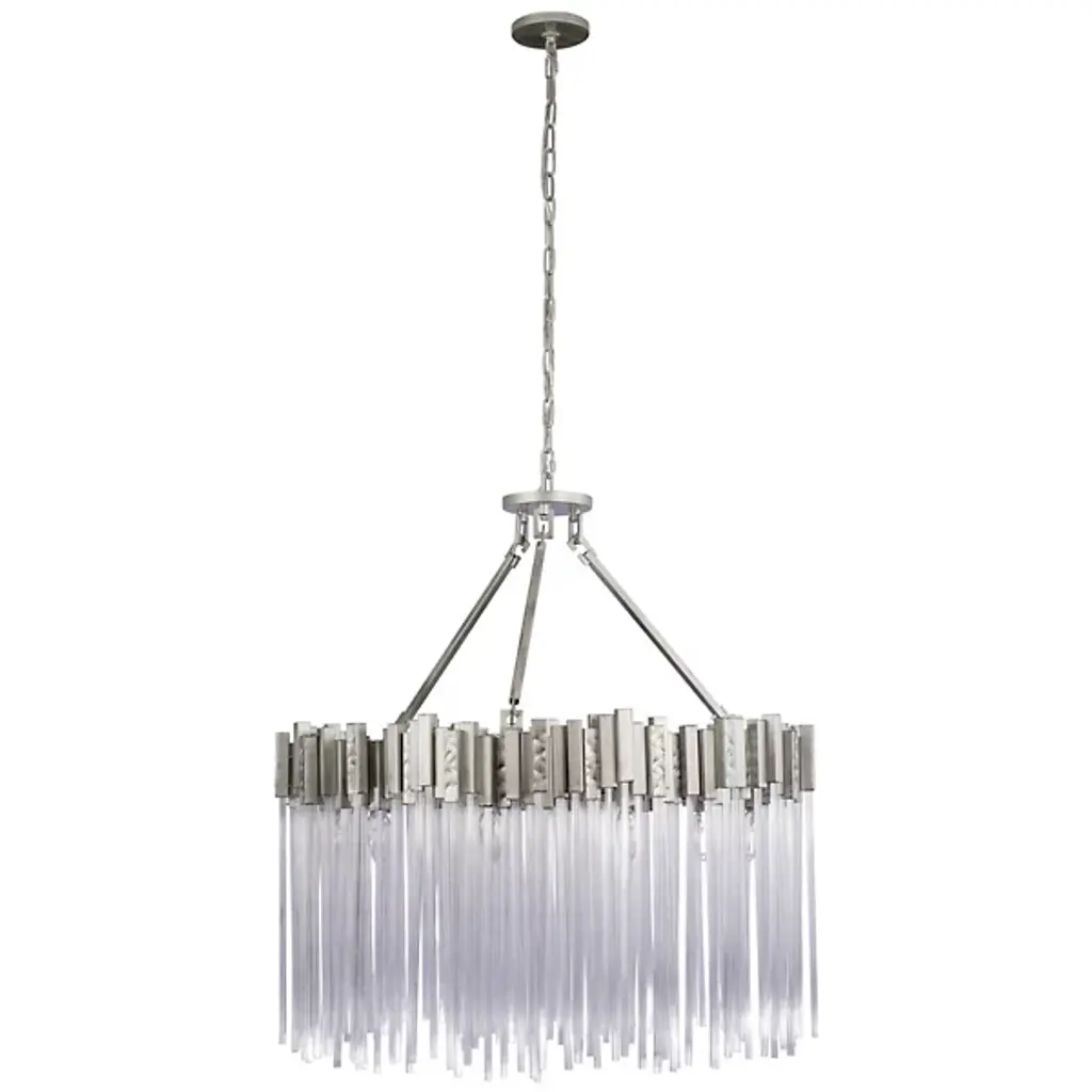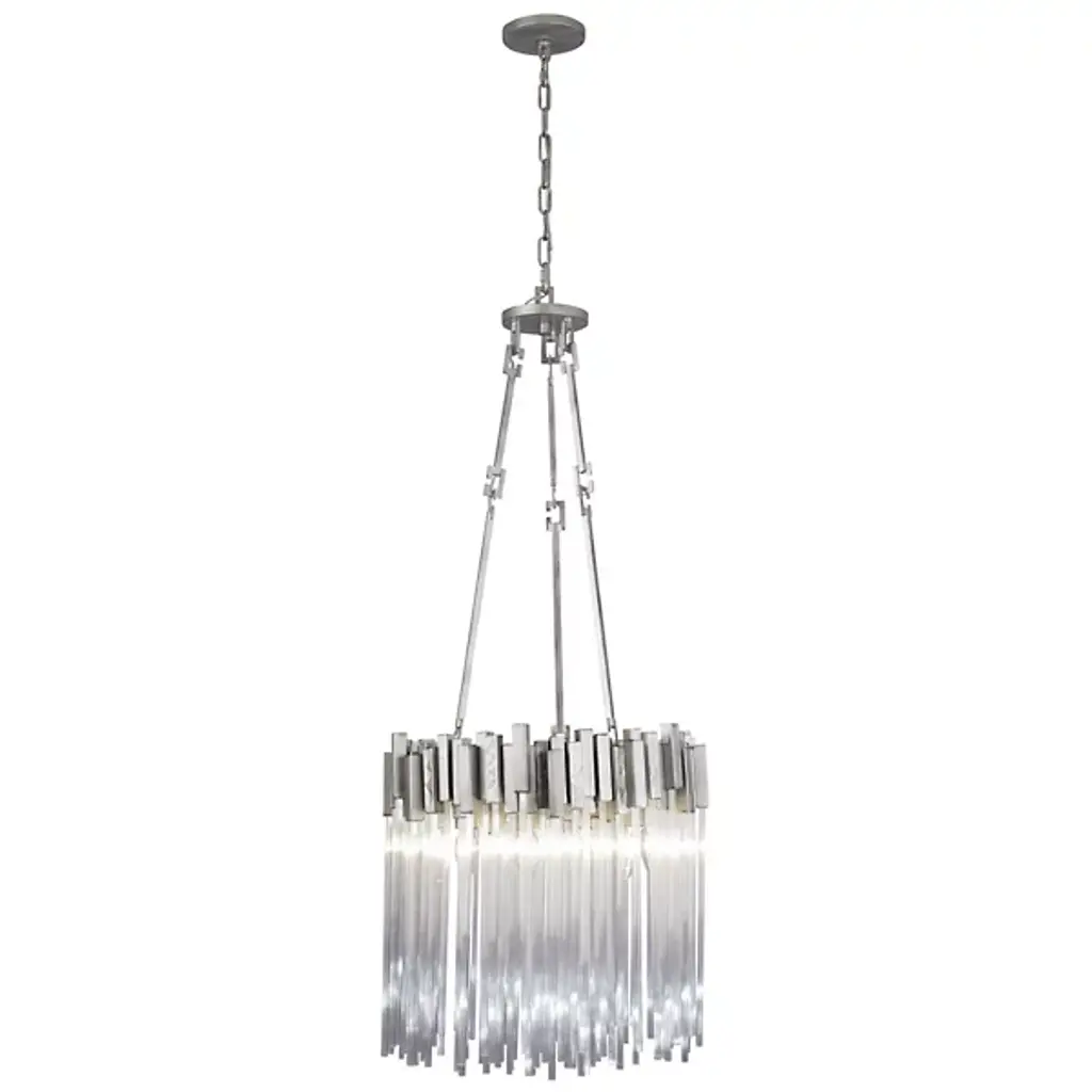 The Varaluz Matrix Pendant brings eclectic elegance to a modern dining room, bedroom or living room. Like a one-of-a-kind artwork, this high drama design showcases a unique cityscape sculpture in hammered and smooth Steel with a cascade of clear Glass rods bringing an extra warm glow to the inner circle of lights.