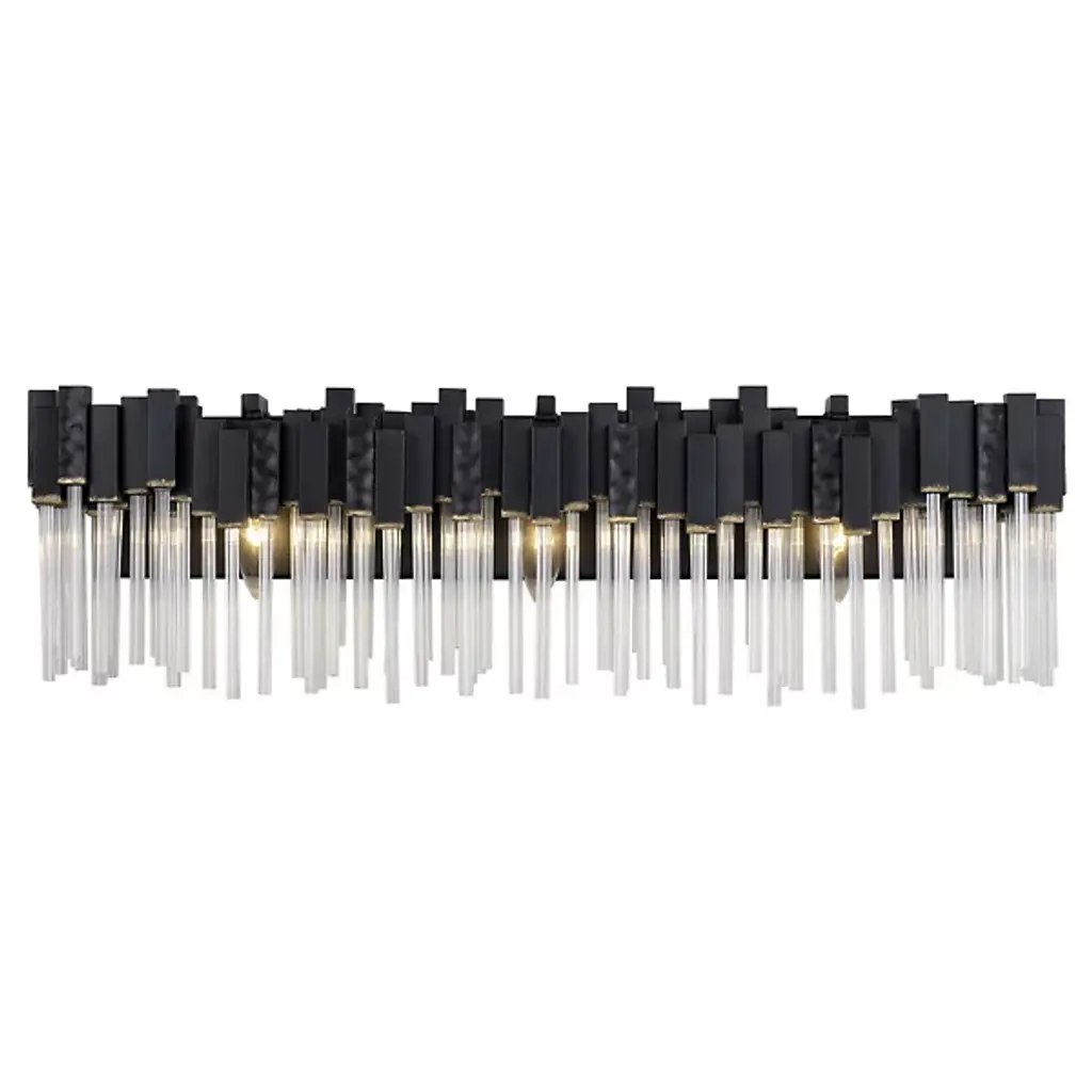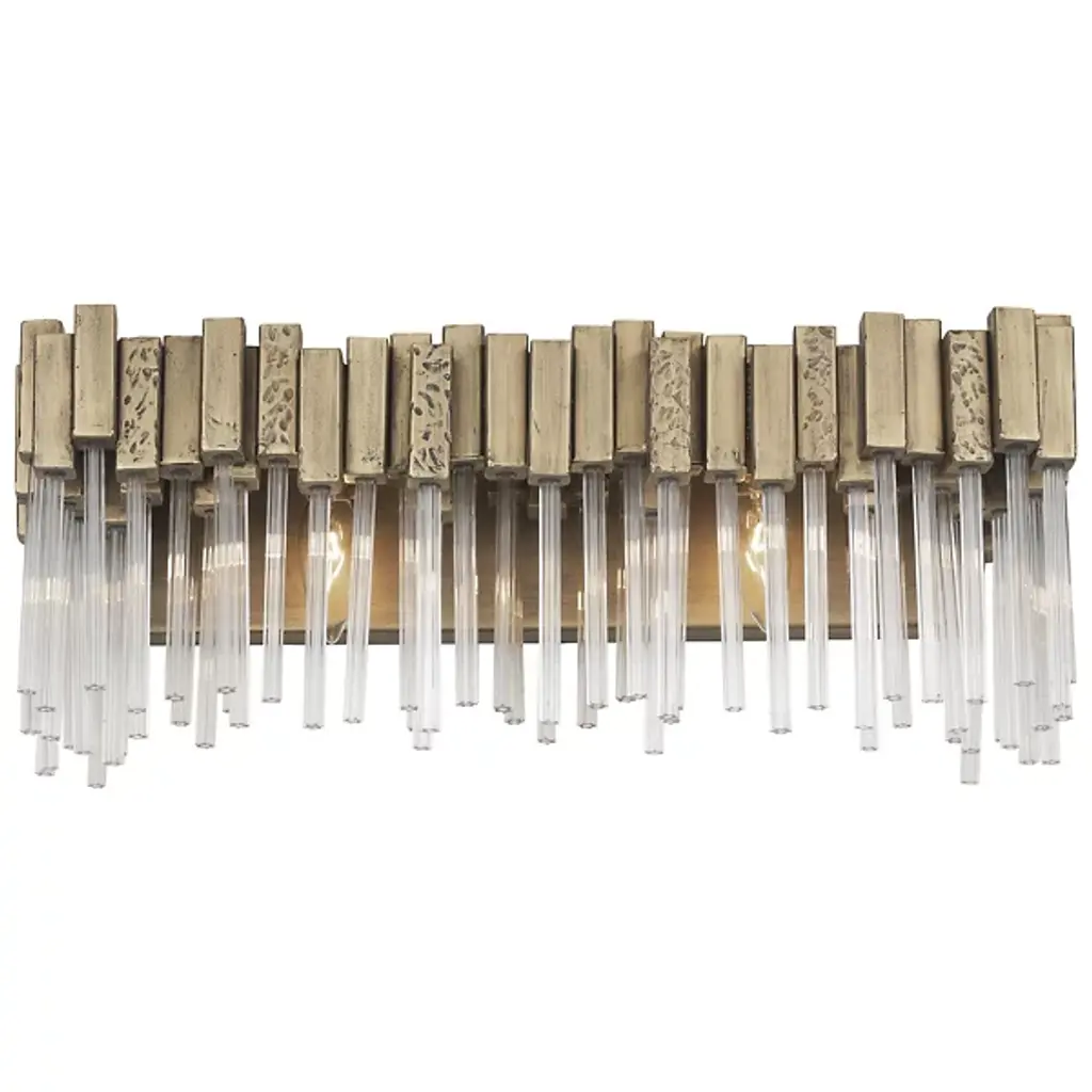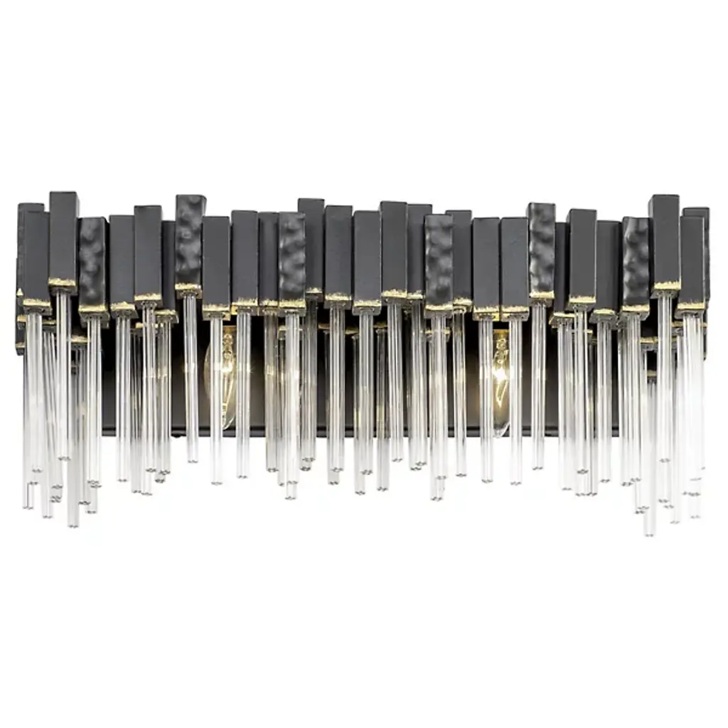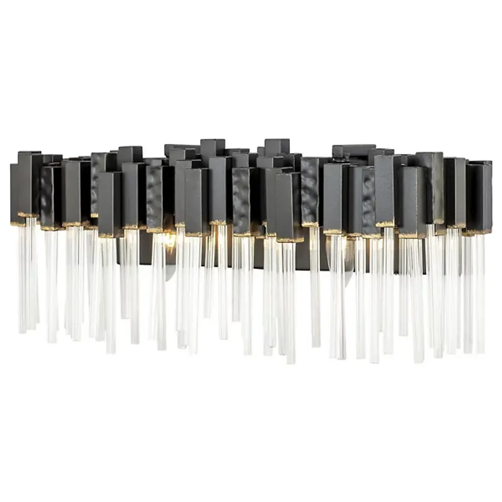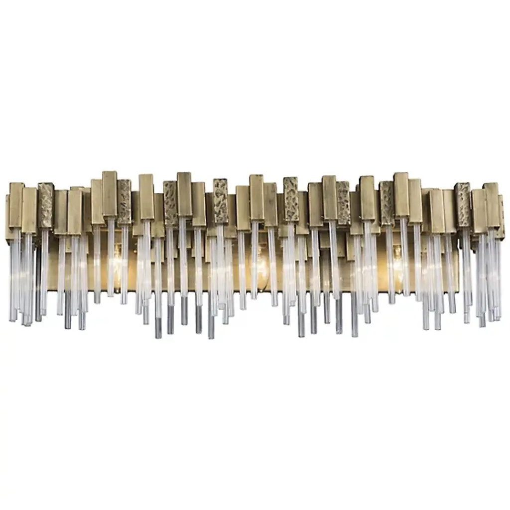 The Matrix Vanity Light by Varaluz becomes the main attraction in a powder room or master bath. Crafted from Recycled Steel, with randomly placed hammered accents, it showcases a dramatic cityscape sculpture in Havana Gold with fluted 70's-inspired clear glass rods. This candelabra light fixture packs retro-modern personality into your vanity lighting.