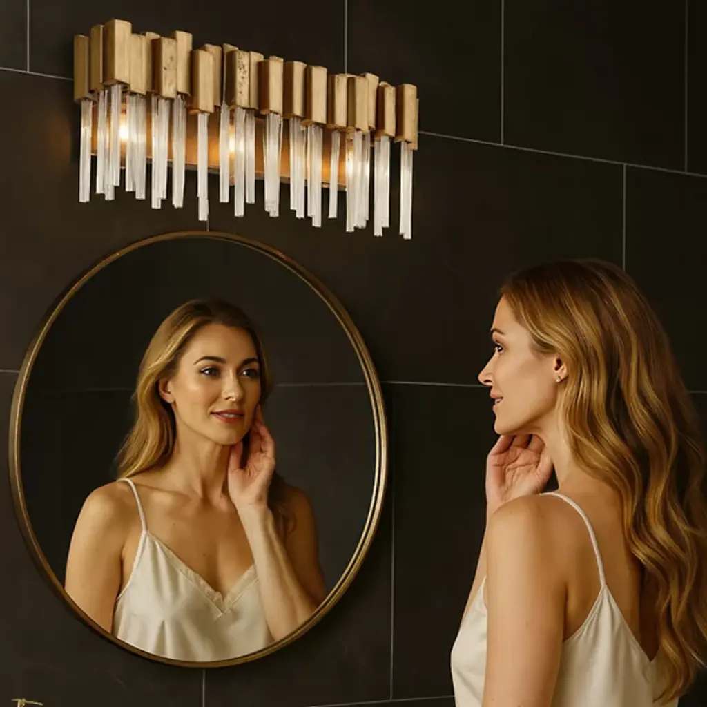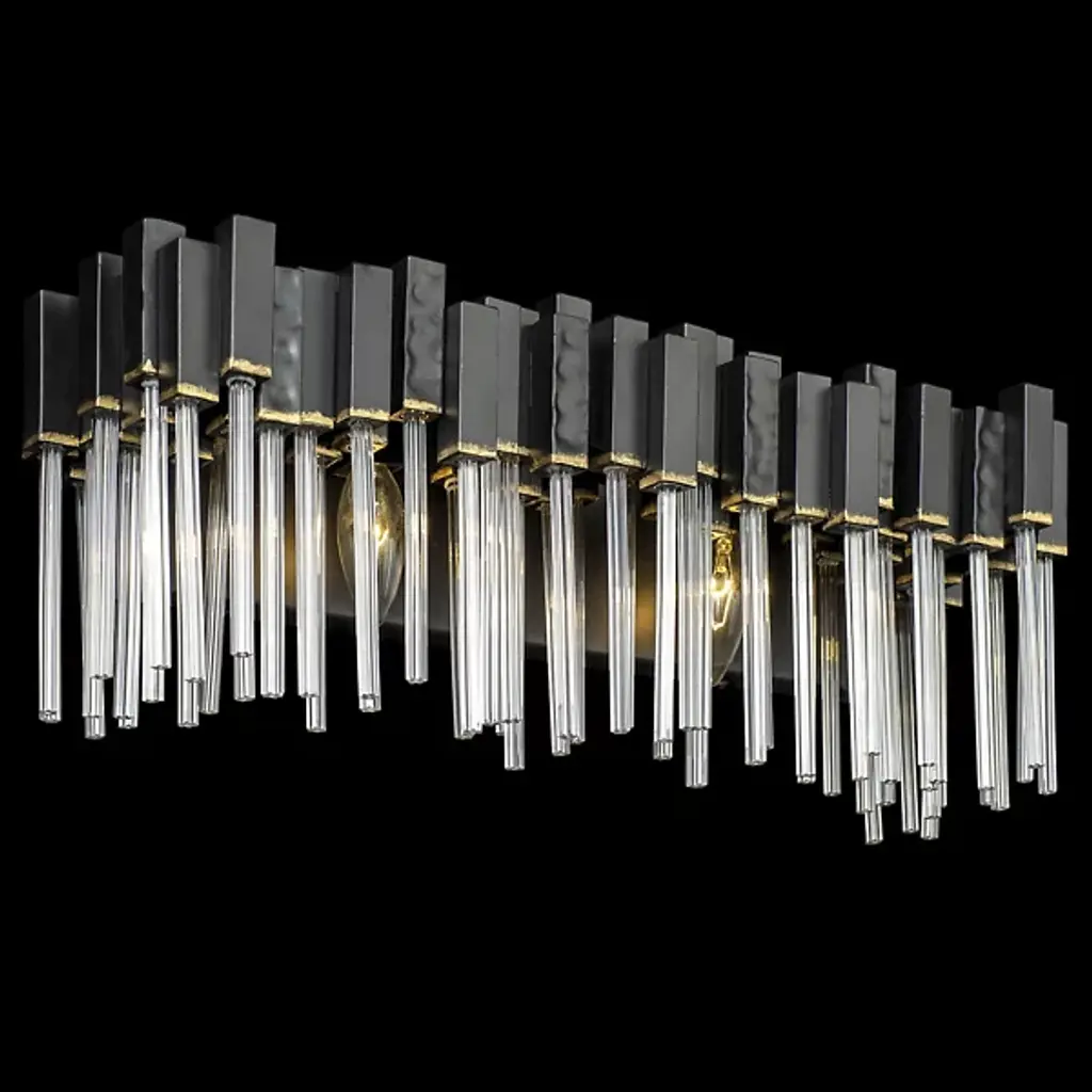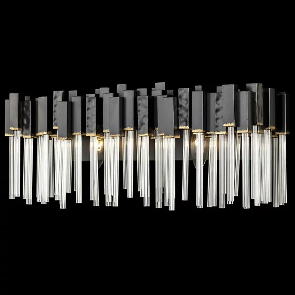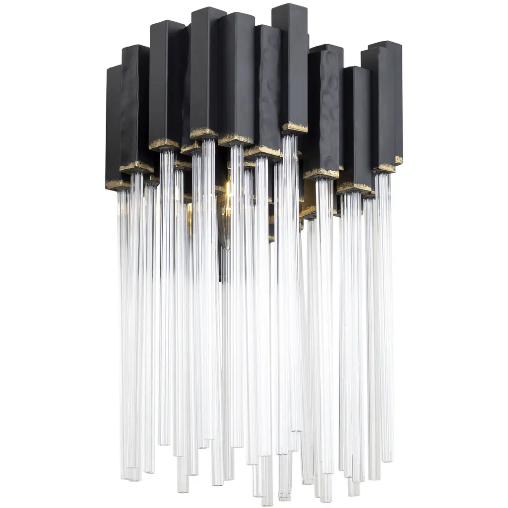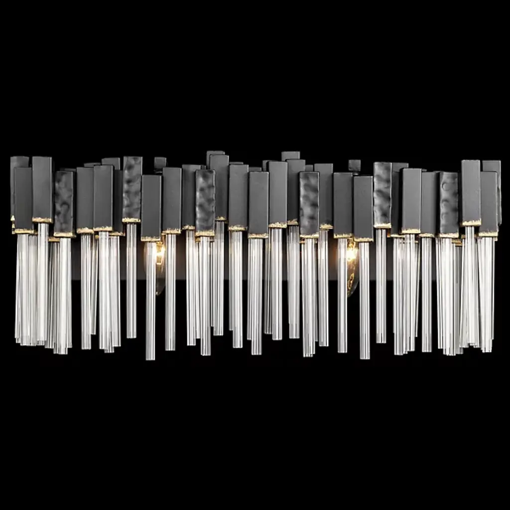 The Matrix Vanity Light by Varaluz becomes the main attraction in a powder room or master bath. Crafted from Recycled Steel, with randomly placed hammered accents, it showcases a dramatic cityscape sculpture in Havana Gold with fluted 70's-inspired clear glass rods. This candelabra light fixture packs retro-modern personality into your vanity lighting.