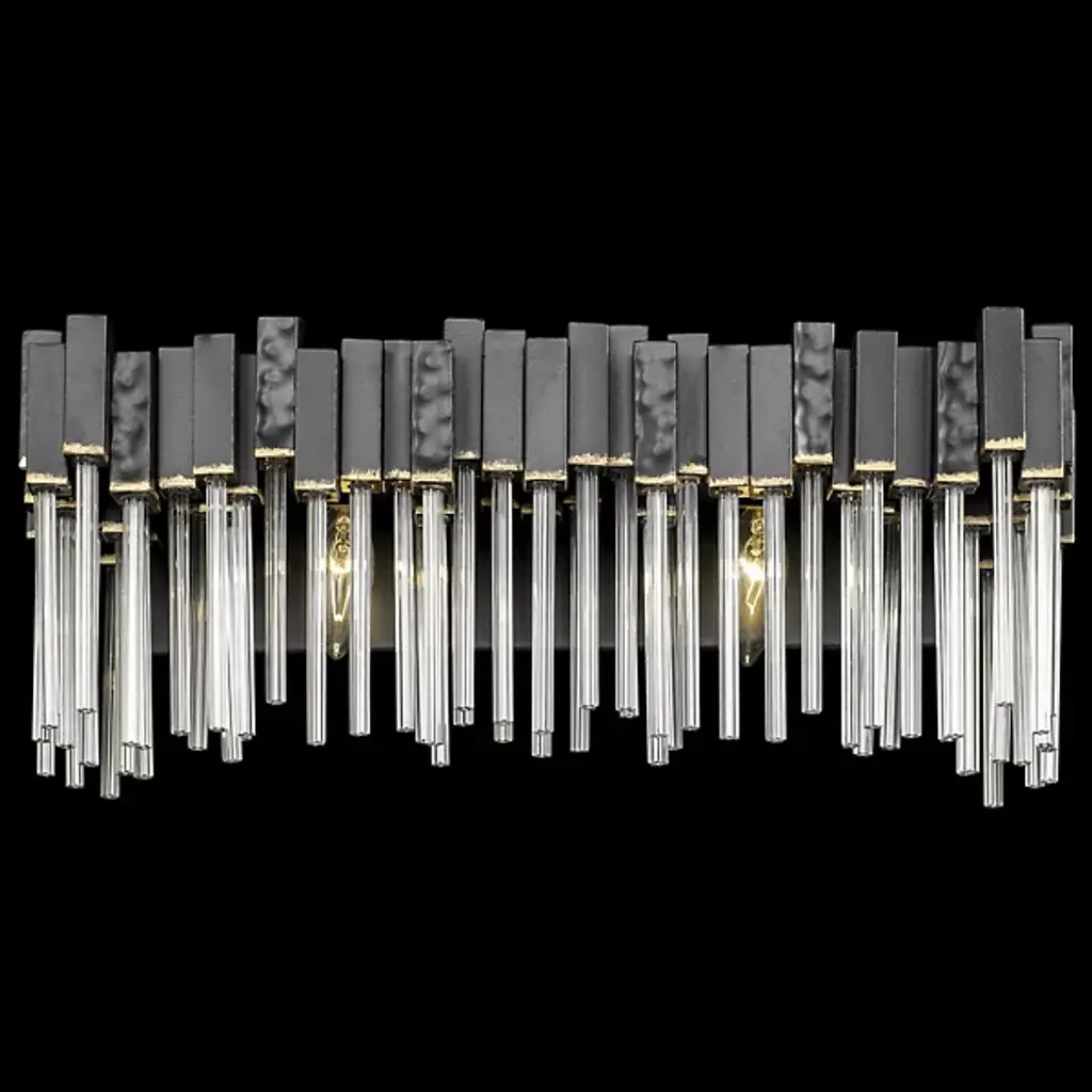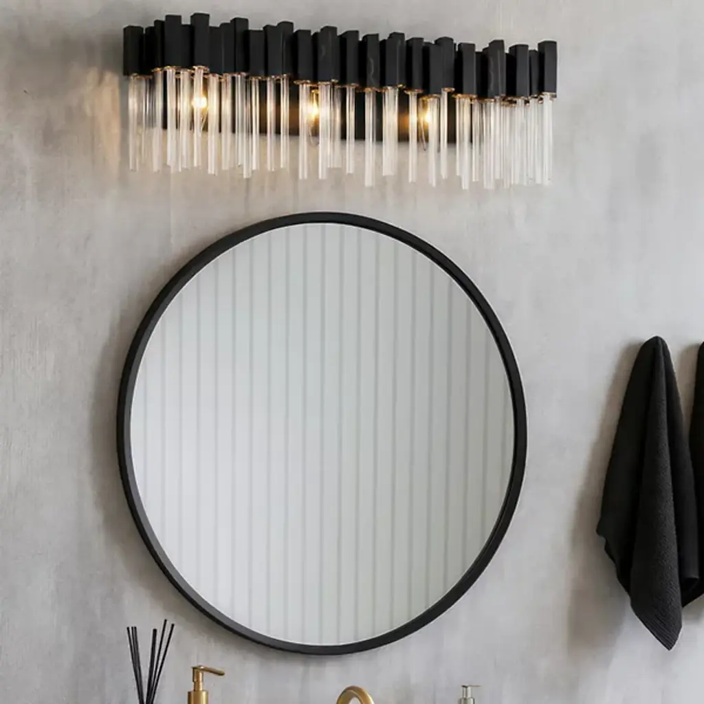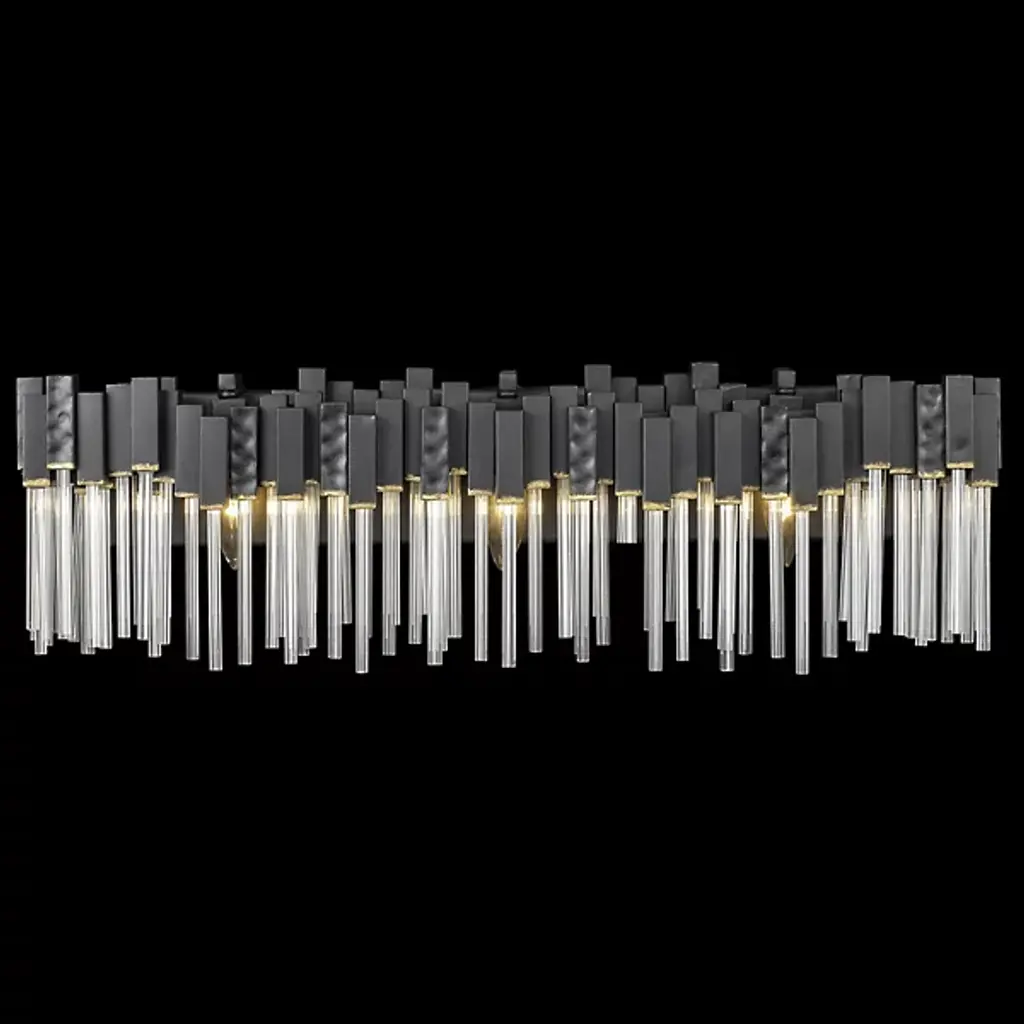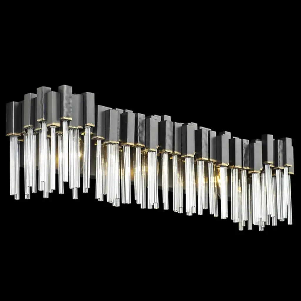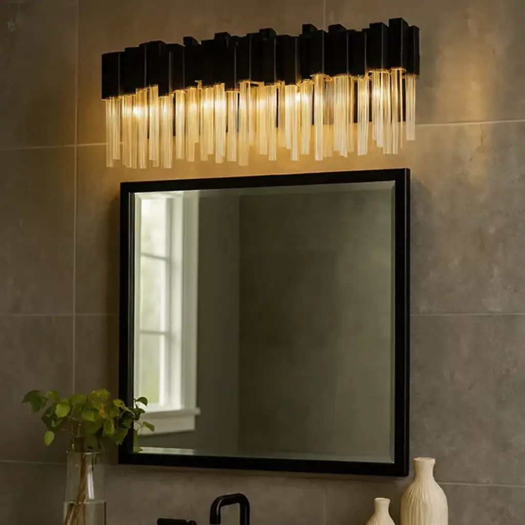 The Matrix Vanity Light by Varaluz becomes the main attraction in a powder room or master bath. Crafted from Recycled Steel, with randomly placed hammered accents, it showcases a dramatic cityscape sculpture in Havana Gold with fluted 70's-inspired clear glass rods. This candelabra light fixture packs retro-modern personality into your vanity lighting.