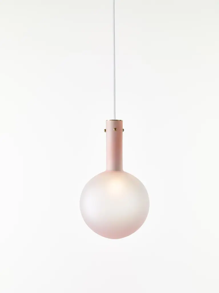 Matte pink Sphaerae pendant light by Dechem studioDimensions: D 20 x H 180 cmMaterials: brass, metal and glass.Also available: Different finishes and colors available.Only one homogenous piece of hand-blown glass creates the main body of Sphaerae light fixture whose medium-sized sphere is connected with the cylinder in its upper part. While the sphere is largely illuminated, the cylinder is not, creating a beautiful contrast of forms and various color qualities. The model, available in various bright colors, also features a delicate detail of three brass balls on the fixture itself.Glass, just like people or trees, is perfectly capable of being shaped and formed. One can imprint just about anything into it, give it a form, capture a passing moment, breath a new life into it. Later it stiffens and freezes like a petrified fossil, like magma, like a witness. No one can move it. It is solid as a rock and if you urge it, it rather shatters into pieces than to surrender.We are DECHEM.We are Michaela and Jakub, designers and storytellers in Bohemian glass. Our work is based on contemporary design combined with a mastery of production and a healthy respect for old Central European Craft and traditions.We design, produce and sell our collections of lights and decorative glass products. We produce unique light fixtures made from a combination of mouth-blown glass and handcrafted brass. Our glamorous chandeliers light up any space with a playful yet elegant appearance.A significant component of our work is blowing glass into a color gradient. The wide range of fresh gradient colors is a distinctive feature of the Bandaska vase from our collection. It draws inspiration from traditional milk containers, well-known in Czech village households and their elegant lines are now coming into modern homes in the form of our glass vases and lights.In addition to our normal production, we love to devise bespoke luminous objects for interiors. They arise from experimenting with unconventional materials and unusual combinations.Along with our own work, we like to be part of special collaborations and exhibitions. We have collaborated with renowned galleries and institutions, and curated and exhibited projects in Milano, London, Frankfurt, Istanbul and several other cities around the world.All of our creations are manufactured with care in Czech workshops using unique methods, including hand-blowing, snapping, cutting, grinding, firing, engraving and glass painting.We founded DECHEM studio in Prague in 2012 as partners in both work and life after years of studying glass Craft and design, and we have grown it into a renowned and award-winning design studio.