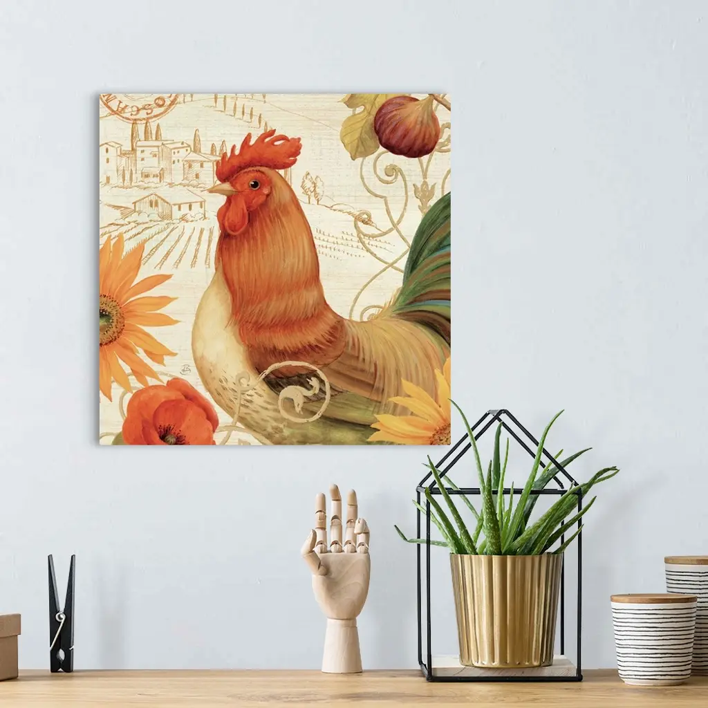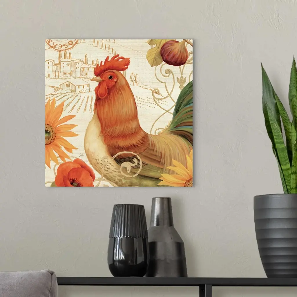 Contemporary artwork of a rooster surrounded by flowers, against a background of idyllic scenery.