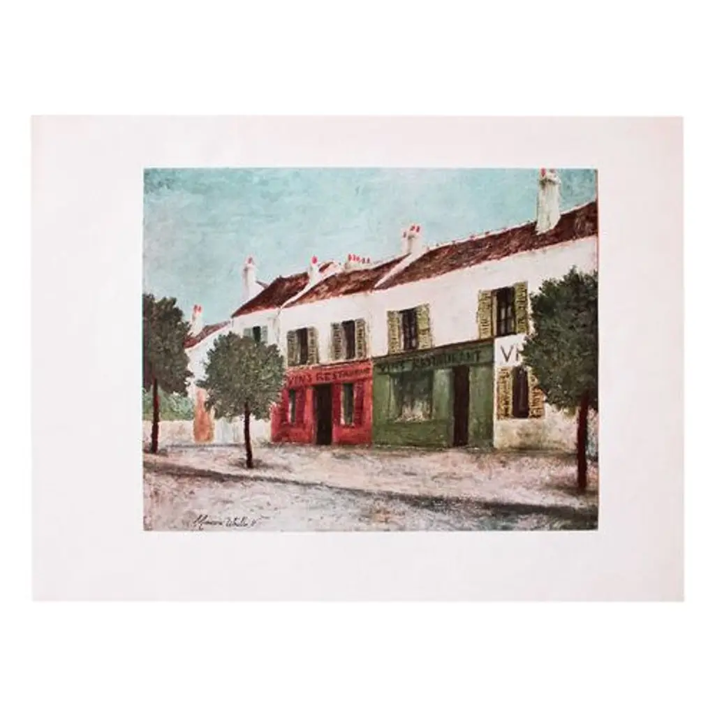 Original period offset lithograph print of "Bistros in a Suburb" (circa 1910) by French artist Maurice Utrillo (1883-1955). Signed in the print: "Maurice Utrillo, V." Information about the original artwork will be found by lifting the plate. Attached to a heavy sheet of wove paper. Comes from a First American edition folio published in the early 1950s. Minor age wear on the wove paper, never used. Image, 9.75"L x 8"H.