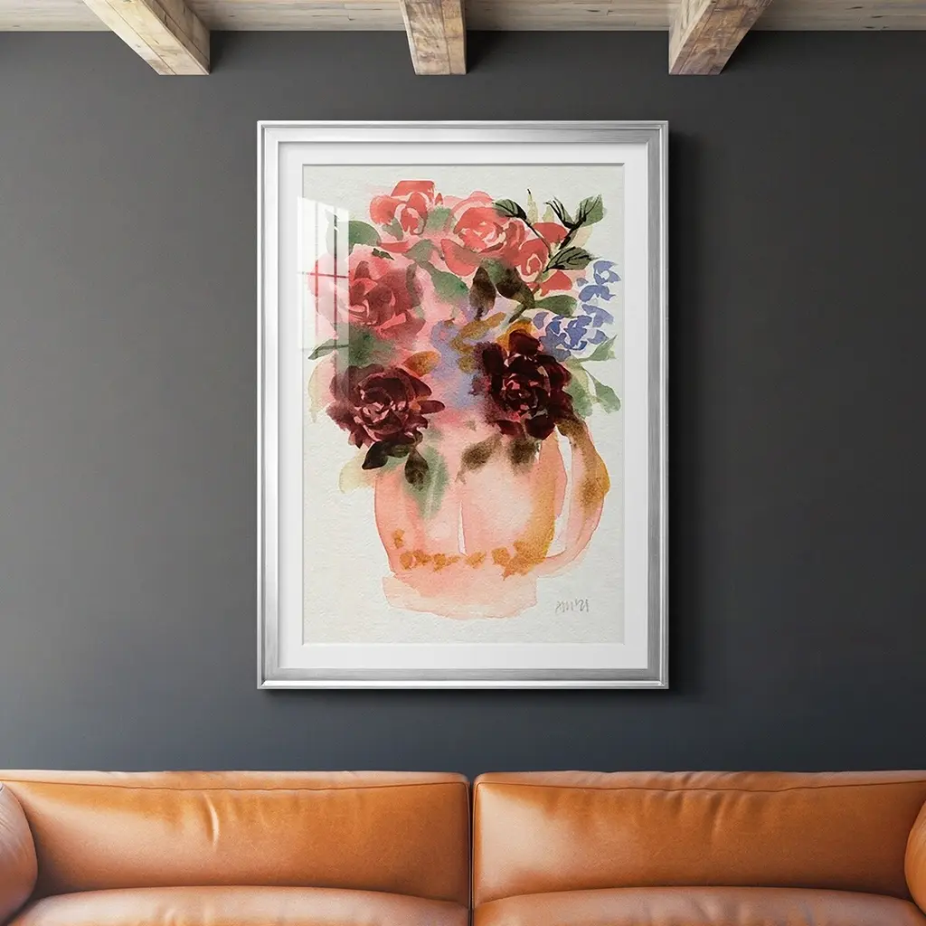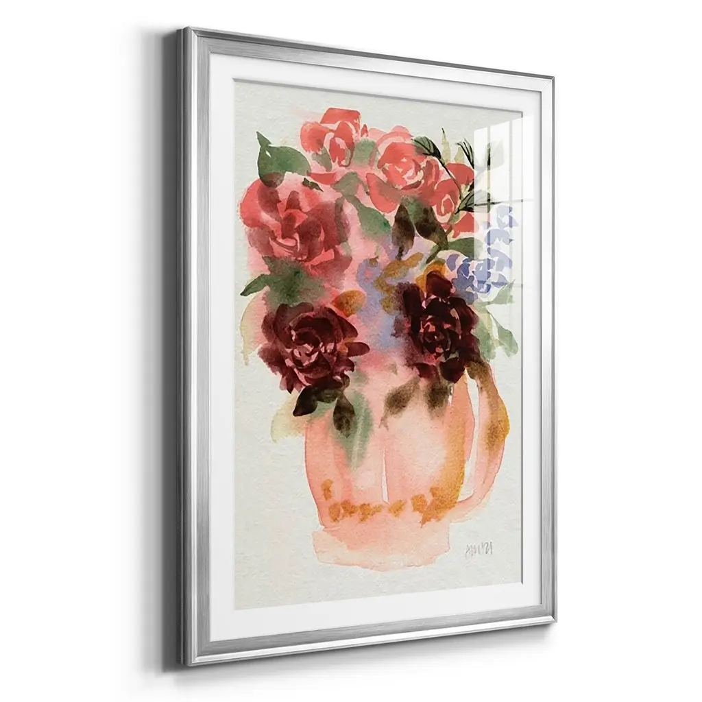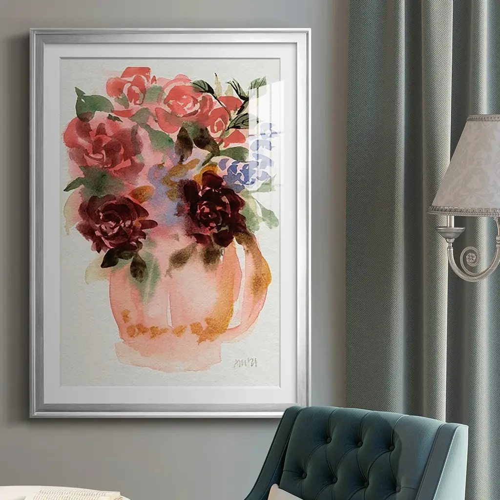 Mauve Bouquet in Teapot I Premium Framed Print - Ready to Hang A Premium Framed Print created to last. Framed in distressed wood and available in an array of sizes and colors Featuring a beveled a solid wood stretcher bar, each piece comes ready to hand 4 SIZES AVAILABLE 30.5''X42.5'' - Overall Size 26.5'X36.5'' - Overall Size 22.5''x30.5'' - Overall Size 18.5''x24.5'' - Overall Size Each piece is made to order. Each piece comes with hanging hardware. Made in the USA Ready to Hang Giclee Paper Print Acrylic Glass Beveled Matt Board