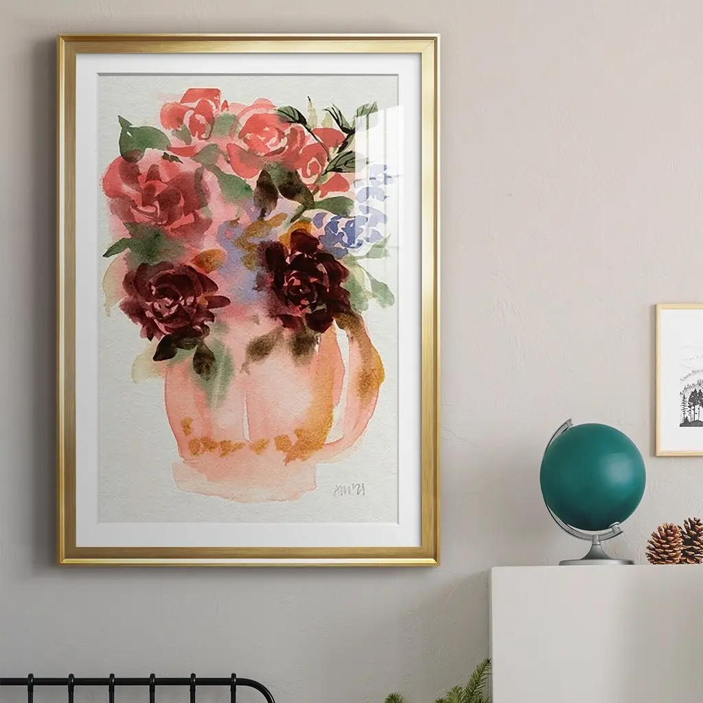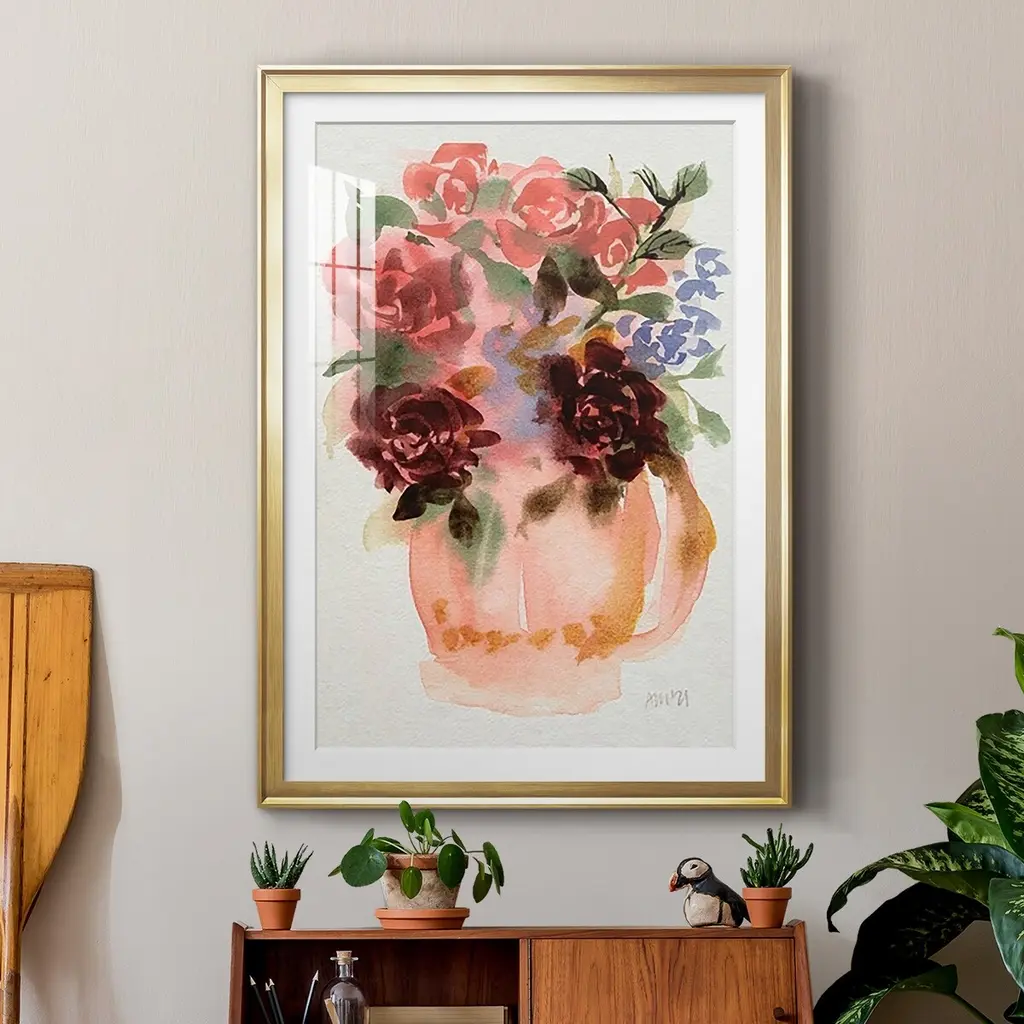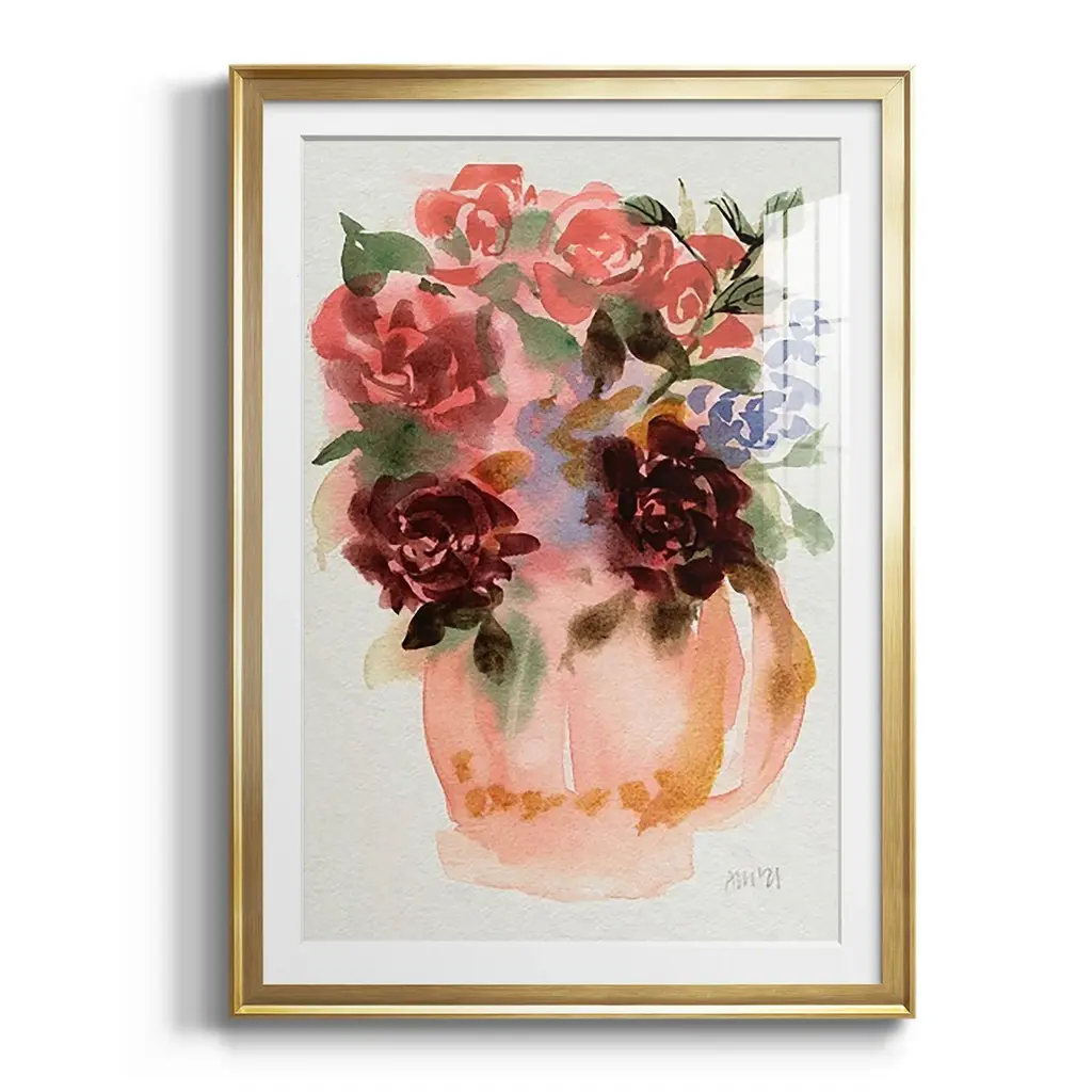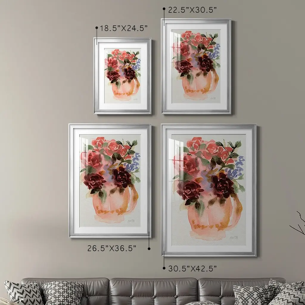 Mauve Bouquet in Teapot I Premium Framed Print - Ready to Hang A Premium Framed Print created to last. Framed in distressed wood and available in an array of sizes and colors Featuring a beveled a solid wood stretcher bar, each piece comes ready to hand 4 SIZES AVAILABLE 30.5''X42.5'' - Overall Size 26.5'X36.5'' - Overall Size 22.5''x30.5'' - Overall Size 18.5''x24.5'' - Overall Size Each piece is made to order. Each piece comes with hanging hardware. Made in the USA Ready to Hang Giclee Paper Print Acrylic Glass Beveled Matt Board