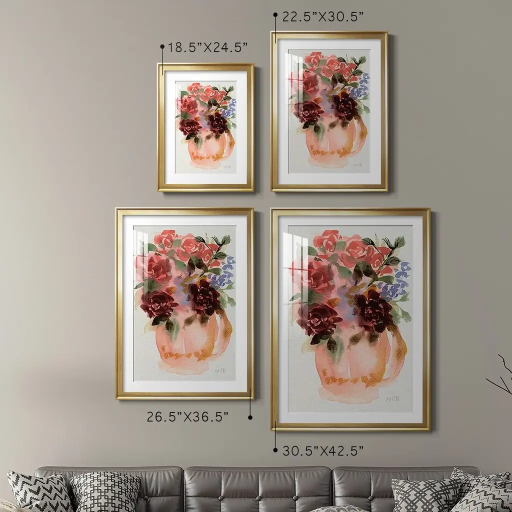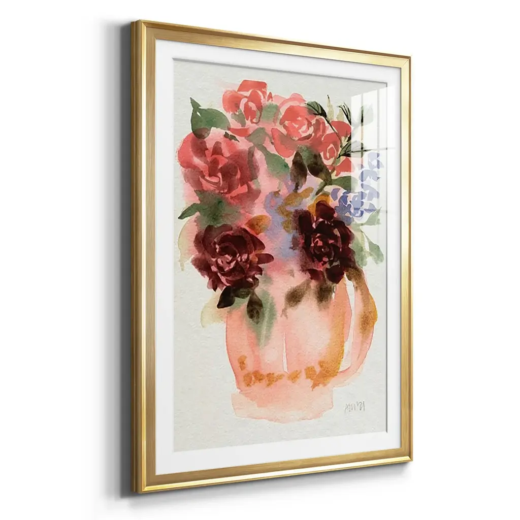 Mauve Bouquet in Teapot I Premium Framed Print - Ready to Hang A Premium Framed Print created to last. Framed in distressed wood and available in an array of sizes and colors Featuring a beveled a solid wood stretcher bar, each piece comes ready to hand 4 SIZES AVAILABLE 30.5''X42.5'' - Overall Size 26.5'X36.5'' - Overall Size 22.5''x30.5'' - Overall Size 18.5''x24.5'' - Overall Size Each piece is made to order. Each piece comes with hanging hardware. Made in the USA Ready to Hang Giclee Paper Print Acrylic Glass Beveled Matt Board