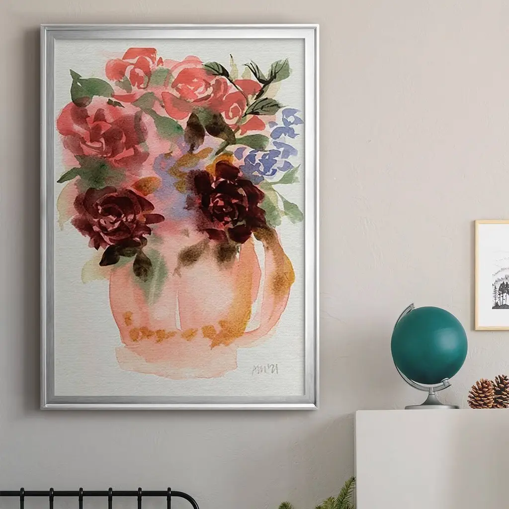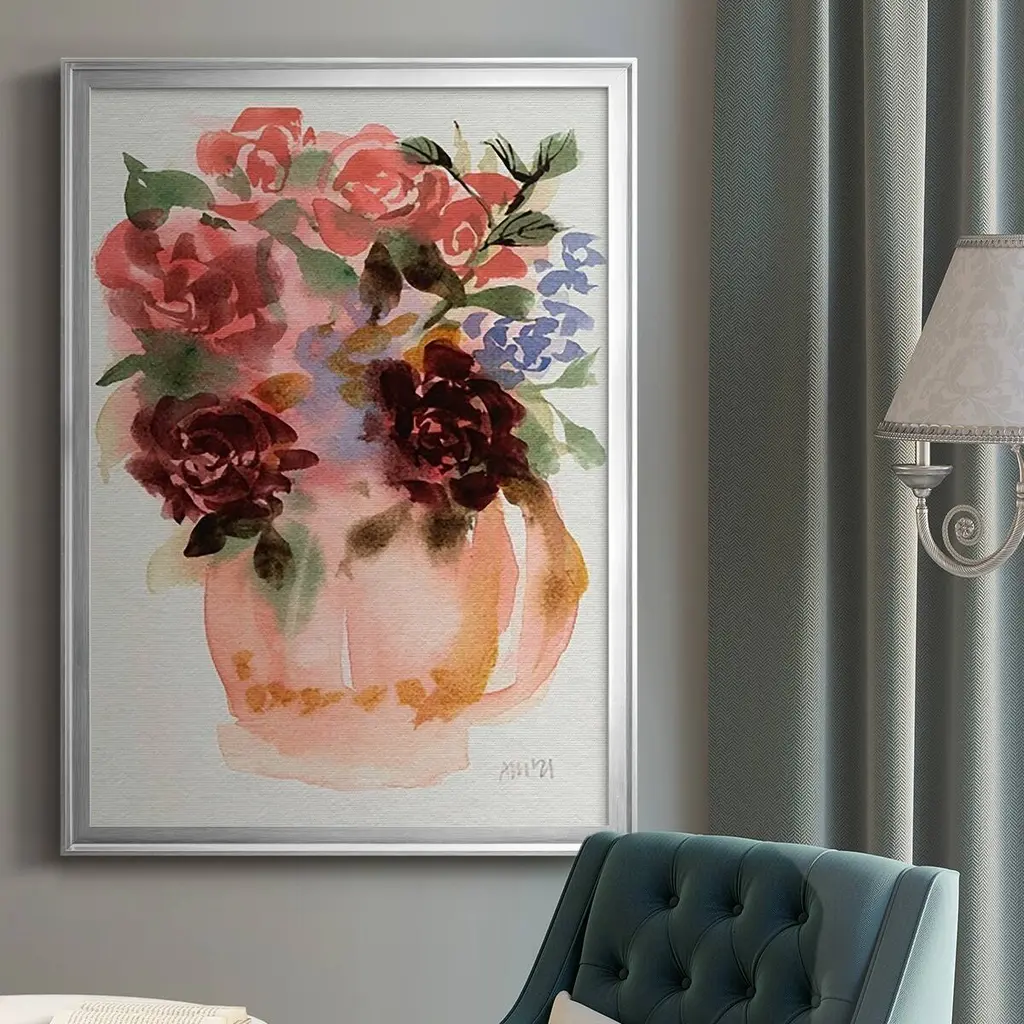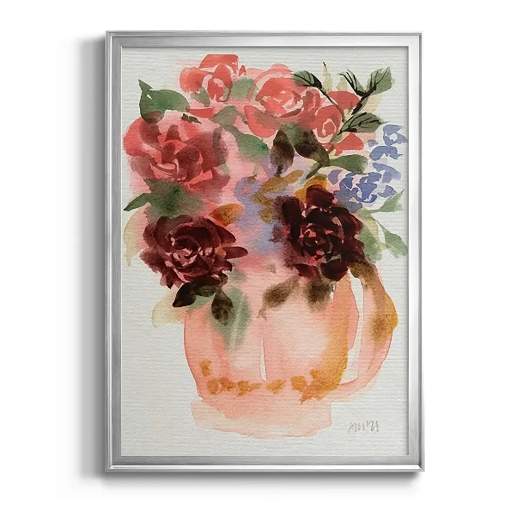 Mauve Bouquet in Teapot I Premium Framed Print - Ready to Hang A Premium Framed Print created to last. Framed in distressed wood and available in an array of sizes and colors Featuring a beveled a solid wood stretcher bar, each piece comes ready to hand 4 SIZES AVAILABLE 30.5''X42.5'' - Overall Size 26.5'X36.5'' - Overall Size 22.5''x30.5'' - Overall Size 18.5''x24.5'' - Overall Size Each piece is made to order. Each piece comes with hanging hardware. Made in the USA Ready to Hang