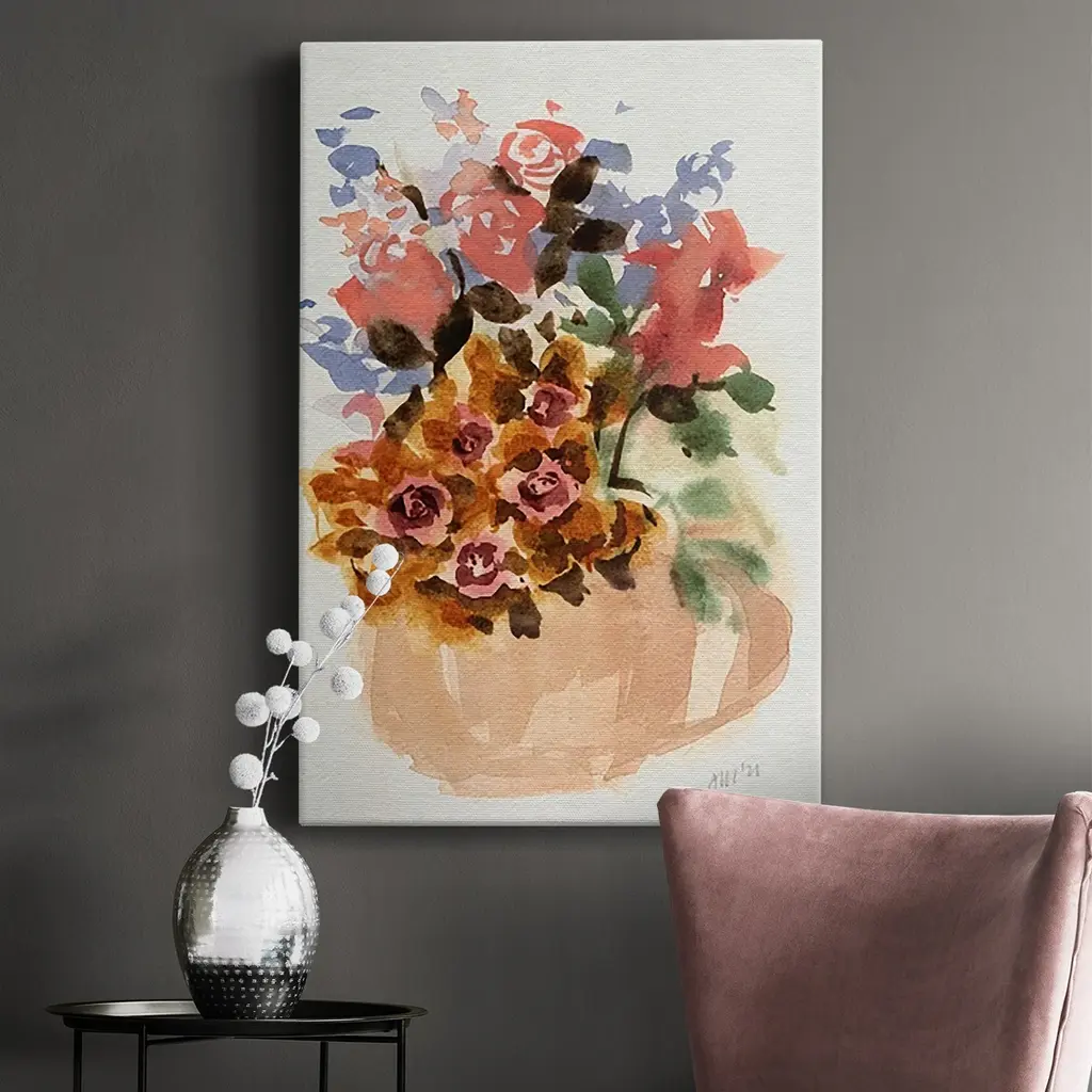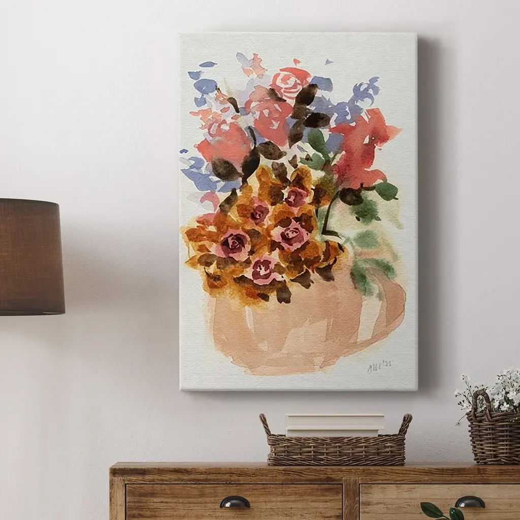 Mauve Bouquet in Teapot II Premium Gallery Wrapped Canvas - Ready to Hang A premium hand stretched gallery wrapped canvas print created to last. Featuring a beveled a solid wood stretcher bar, each piece comes ready to hand 6 SIZES AVAILABLE 8''X12'' - Overall Size 12''X18'' - Overall Size 18''X27'' - Overall Size 24''x36'' - Overall Size 32''x48'' - Overall Size 40''x60'' - Overall Size Each piece is made to order. Built to Last Each piece comes ready to hang Solid wood stretcher Fade and Water resistant Made domestically