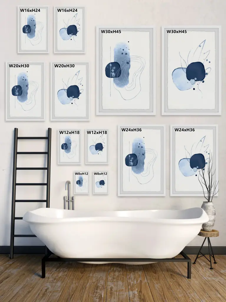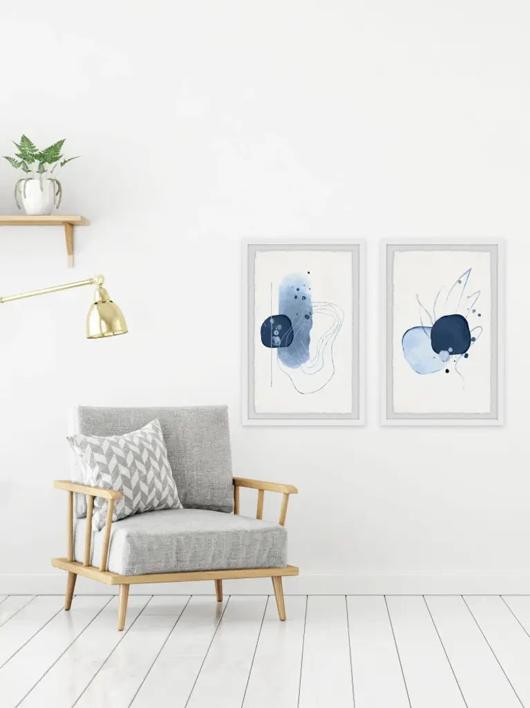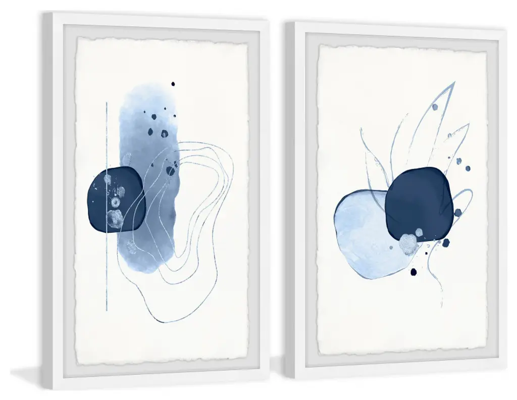 These two watercolor painting prints complement each other wonderfully, each featuring a unique abstract design made up of blue shapes, spots, and lines. Proudly printed in the USA, this piece is printed on high quality archive paper and professionally hand-framed. With wall-mounting hooks included, this artful accent is ready to hang up as soon as it reaches your front door.- (2) panels of 8x12- Top quality Giclee print on high resolution Archive Paper- Hand cut deckled edges- High quality durable non-warping frame- Finished under shatter resistant plexiglass- Arrives ready to hang- Includes a certificate of authenticity- Printed in the USA