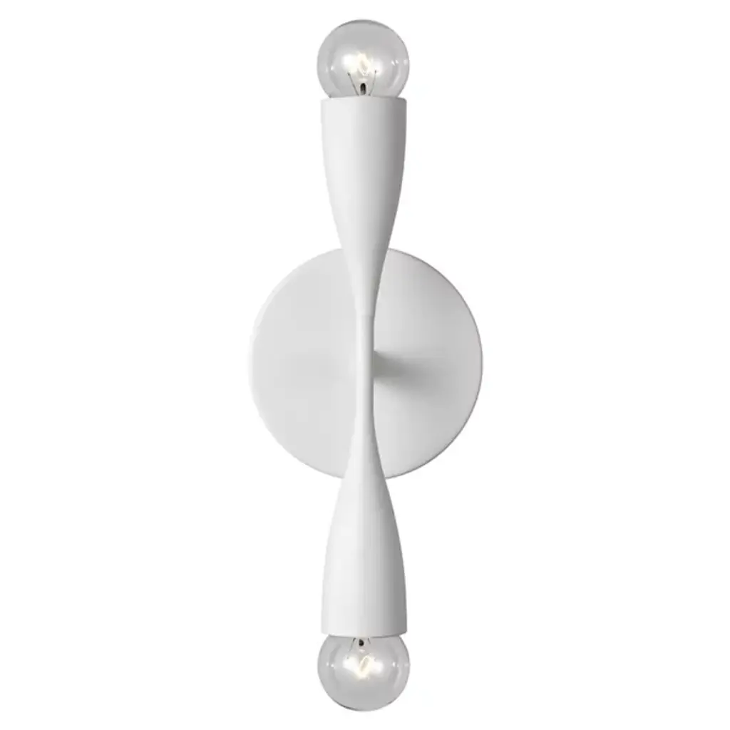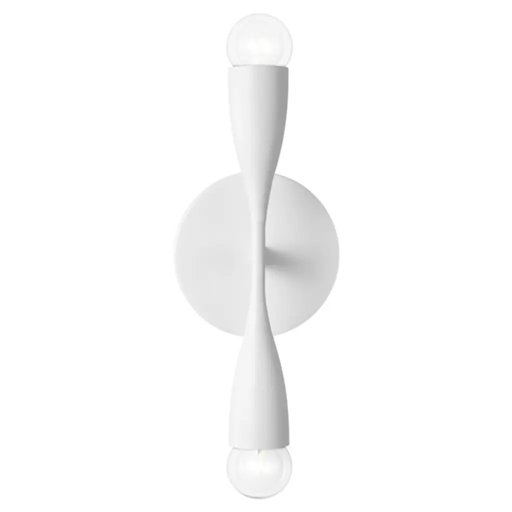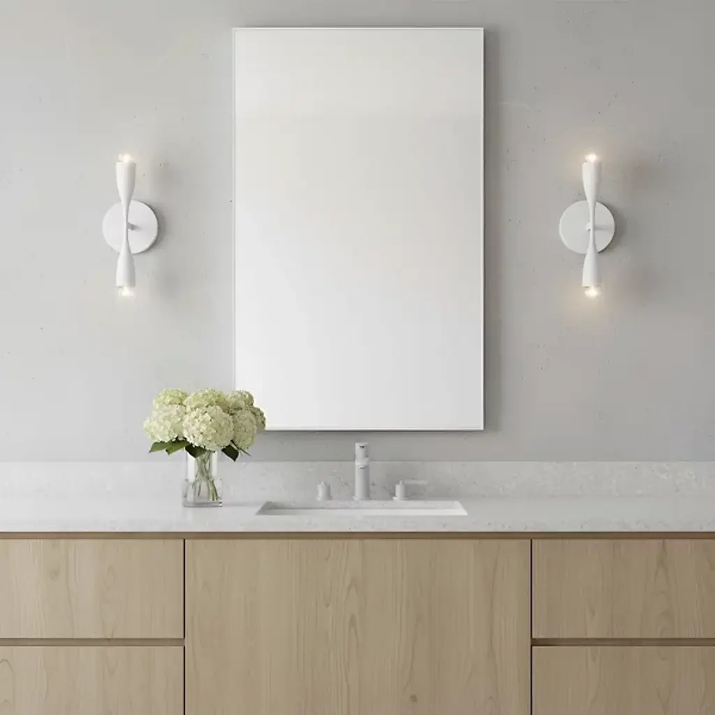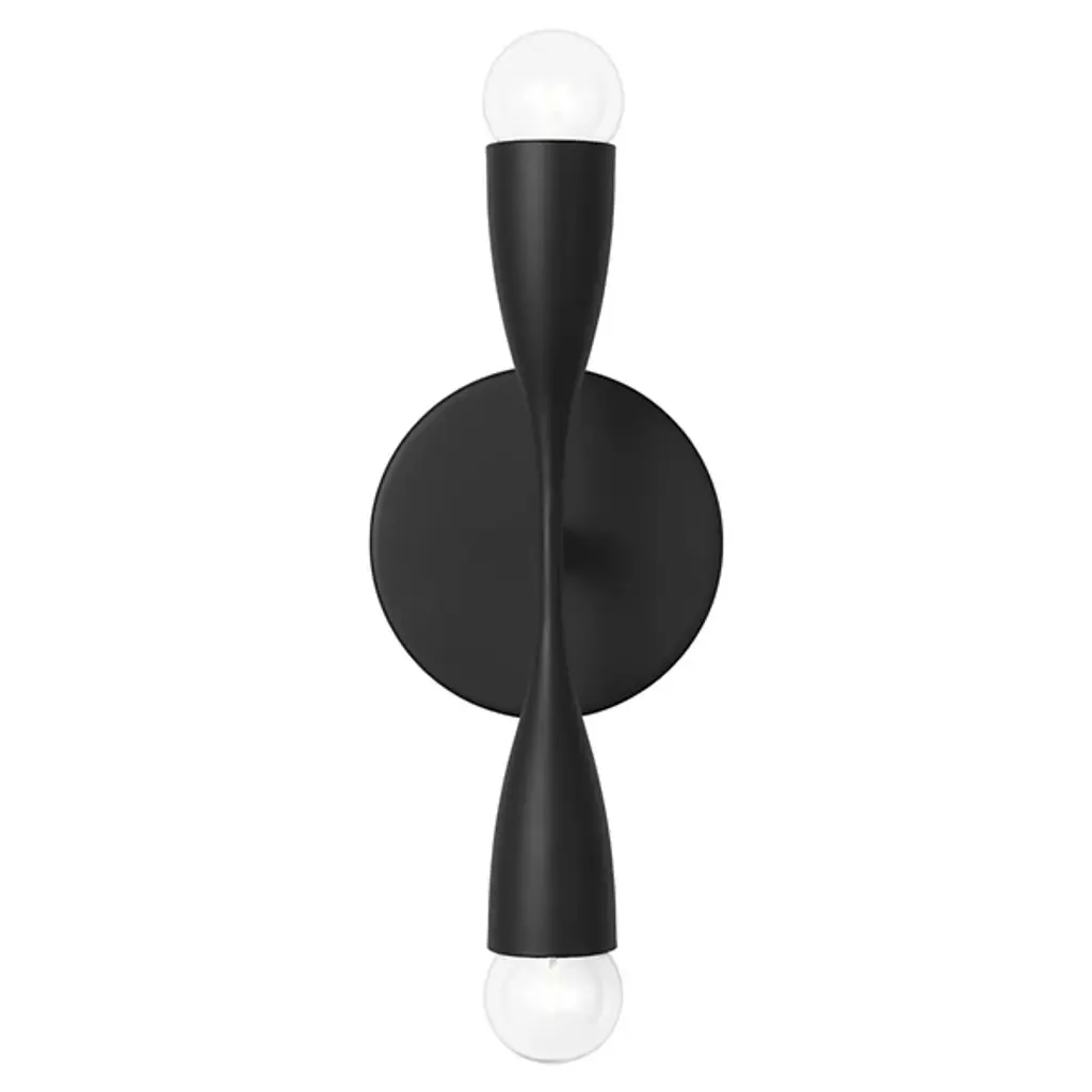 The Maya Vanity Light from Generation Lighting integrates metal shades directly into the fixture's framework, where curved elements cradle exposed bulbs rather than concealing them. This organic approach creates a fluid connection between structure and function, allowing the metal framework to flow around each light source. The fixture can be mounted either horizontally or vertically to accommodate different spatial requirements. The exposed bulb design allows for lamp selection to be an aesthetic choice, and the fixture features dimming capability for atmospheric control.
