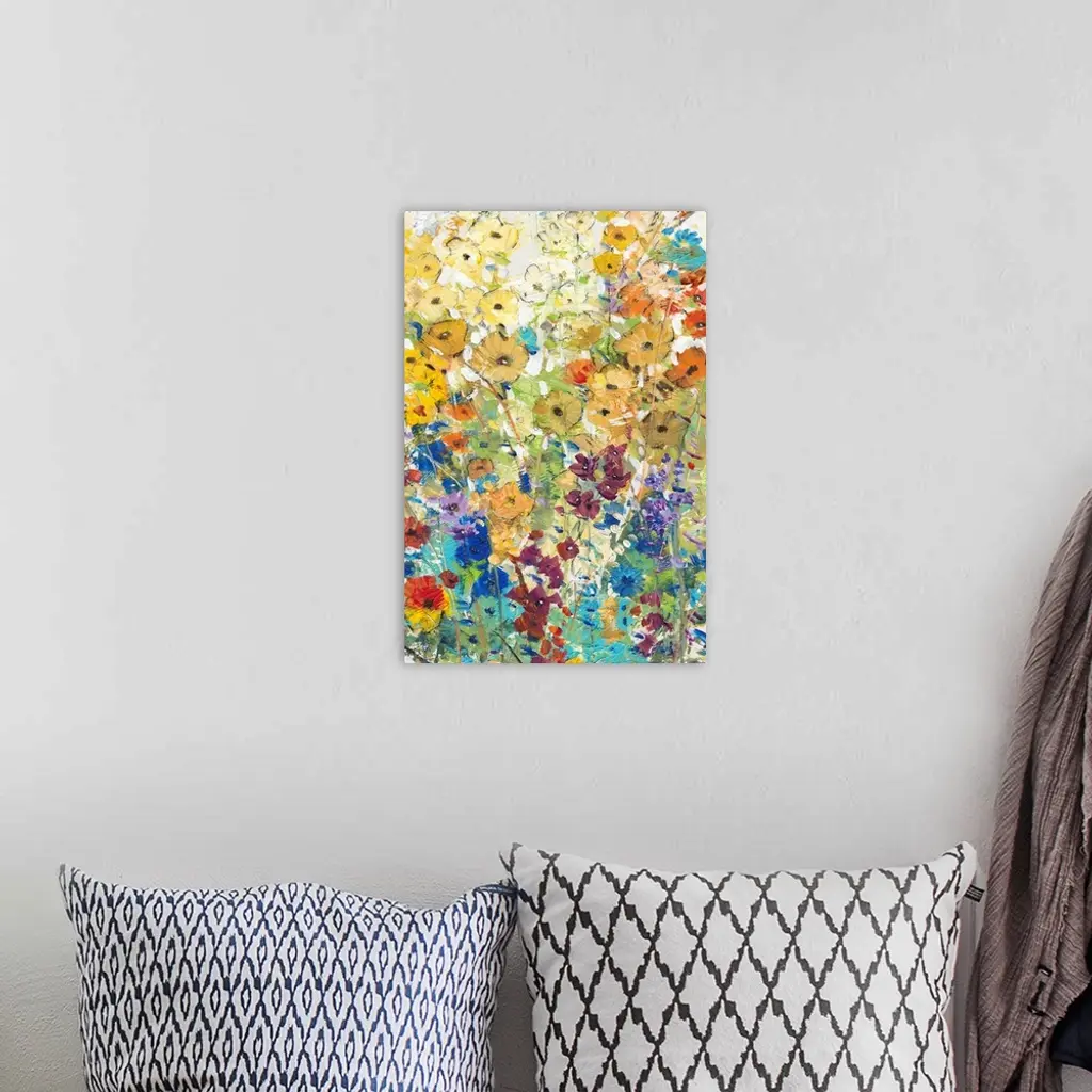 Contemporary artwork of a cheerful field of rainbow colored flowers in full bloom.