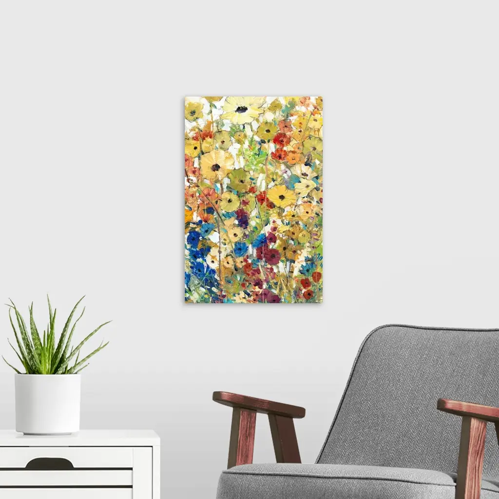 Contemporary artwork of a cheerful field of rainbow colored flowers in full bloom.