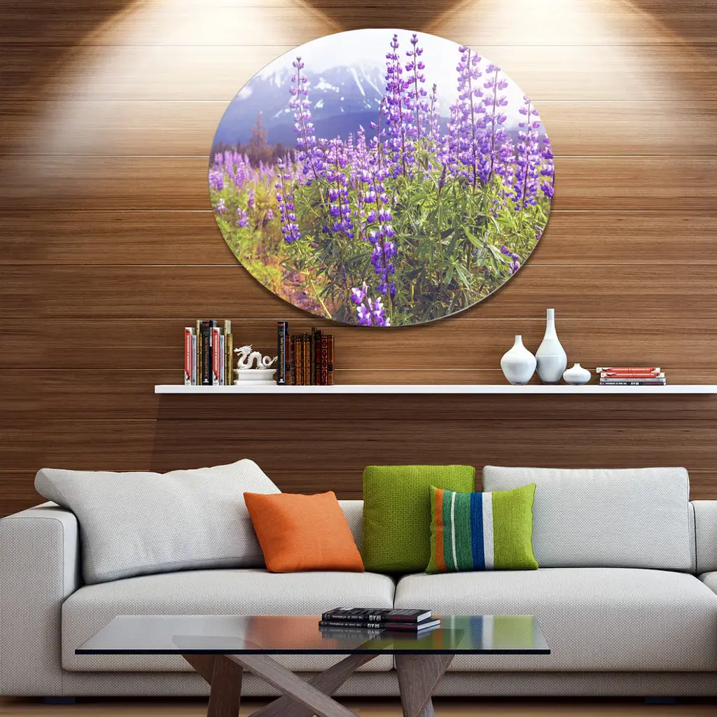 Bring Contemporary Abstraction to your home with this large Circle Metal wall art. This Meadow in Alaska with Purple Flowers Metal Artwork makes it the focal point of any room or office. - White Gloss Coating ensures colors are extra vibrant with light reflection.- Aluminum grade Sheet Metal with 1 inch mounting frame on the back giving the illusion that the artwork is floating on the wall..- Mounting Brackets are included along with instructions.- High Quality Digital images are created directly into a glossy aluminum panel producing a stunning and captivating print into the glossy finish of the metal.- Water, Fire and Scratch resistant HD Aluminum panels.- Looks better than any photo paper and guaranteed to last at least 20 years- Easy to clean with a microfiber cloth. Colors are far superior to regular Canvas Art. - Easy to Hang