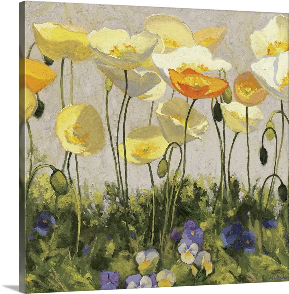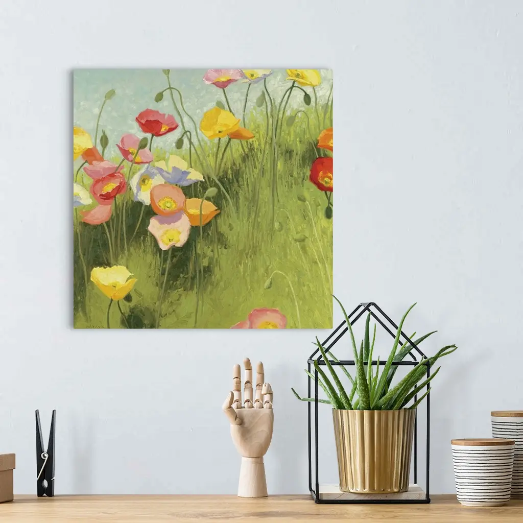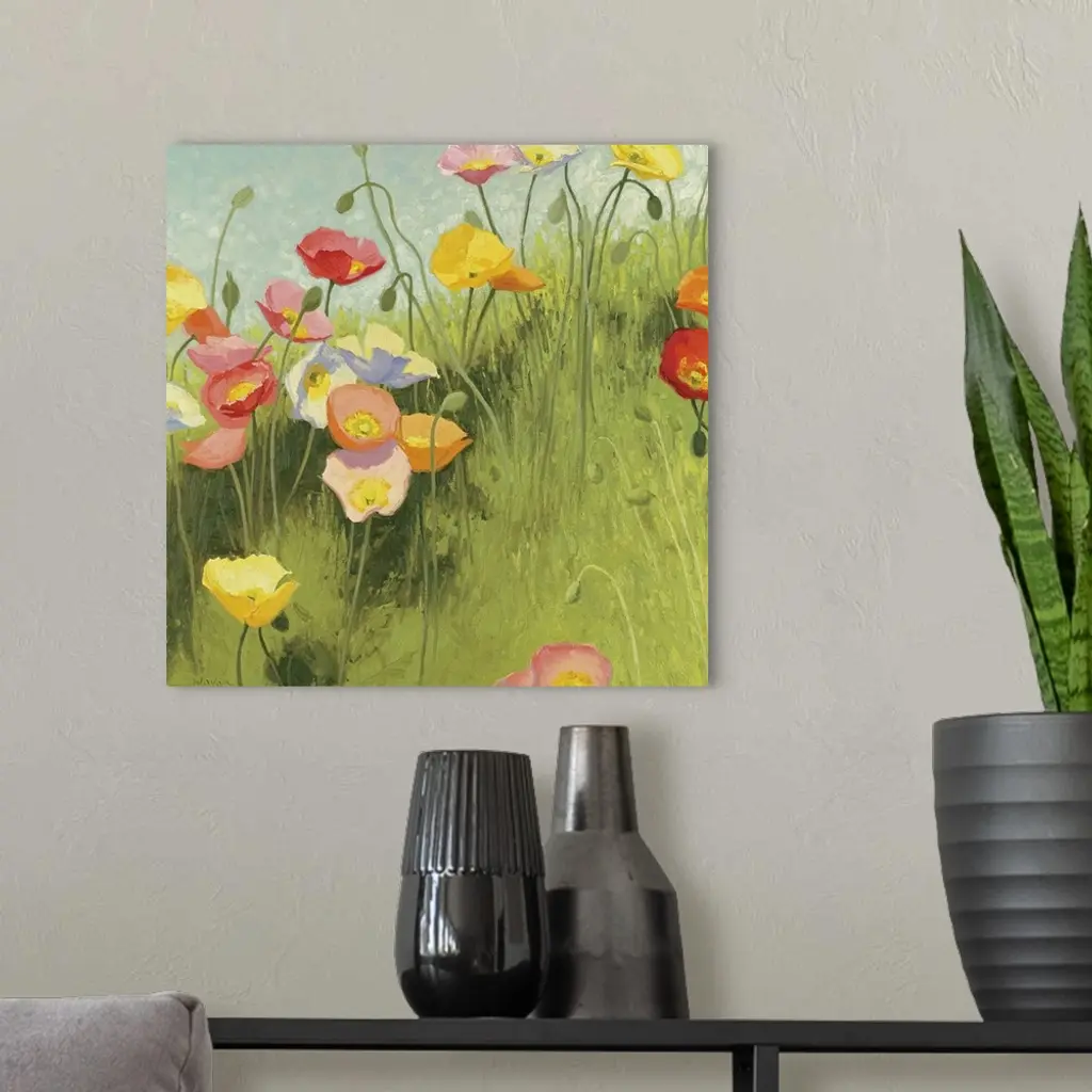 This square piece is a contemporary painting of delicate flowers that are growing on a grassy hill. Some are still budding and others have fully bloomed.