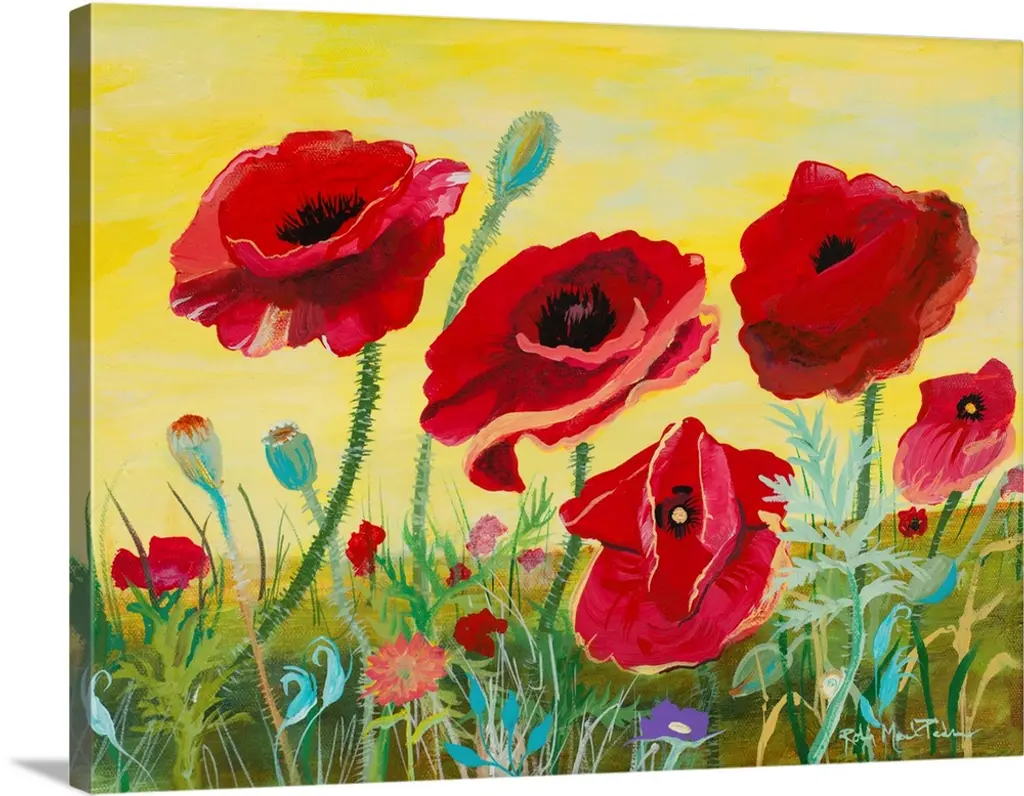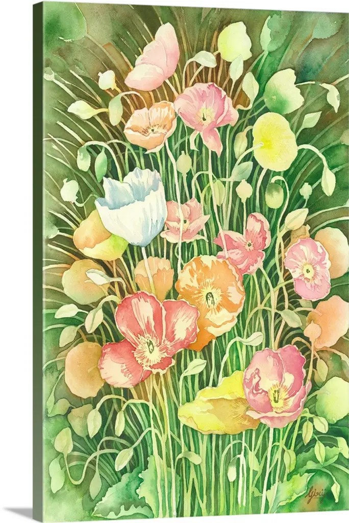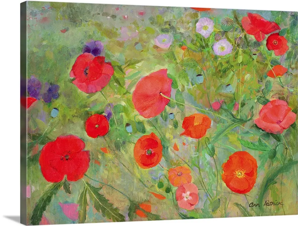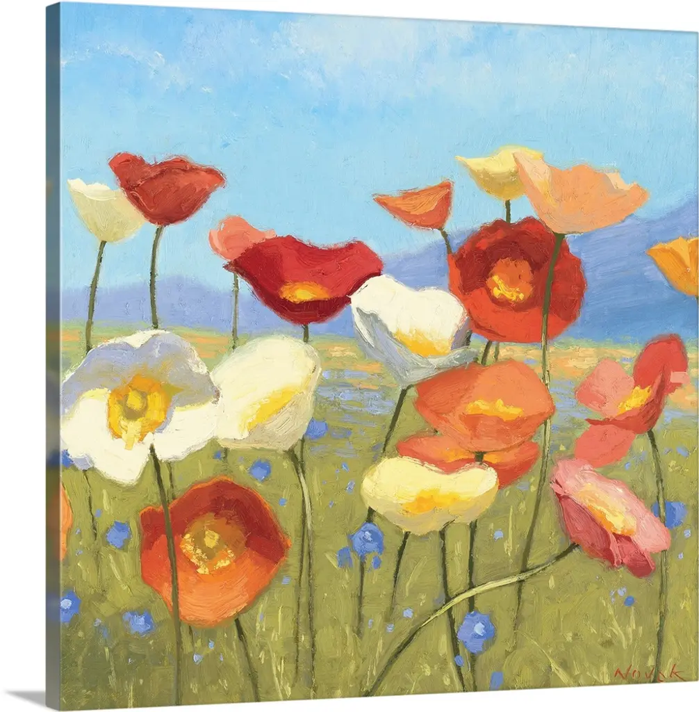 This square piece is a contemporary painting of delicate flowers that are growing on a grassy hill. Some are still budding and others have fully bloomed.