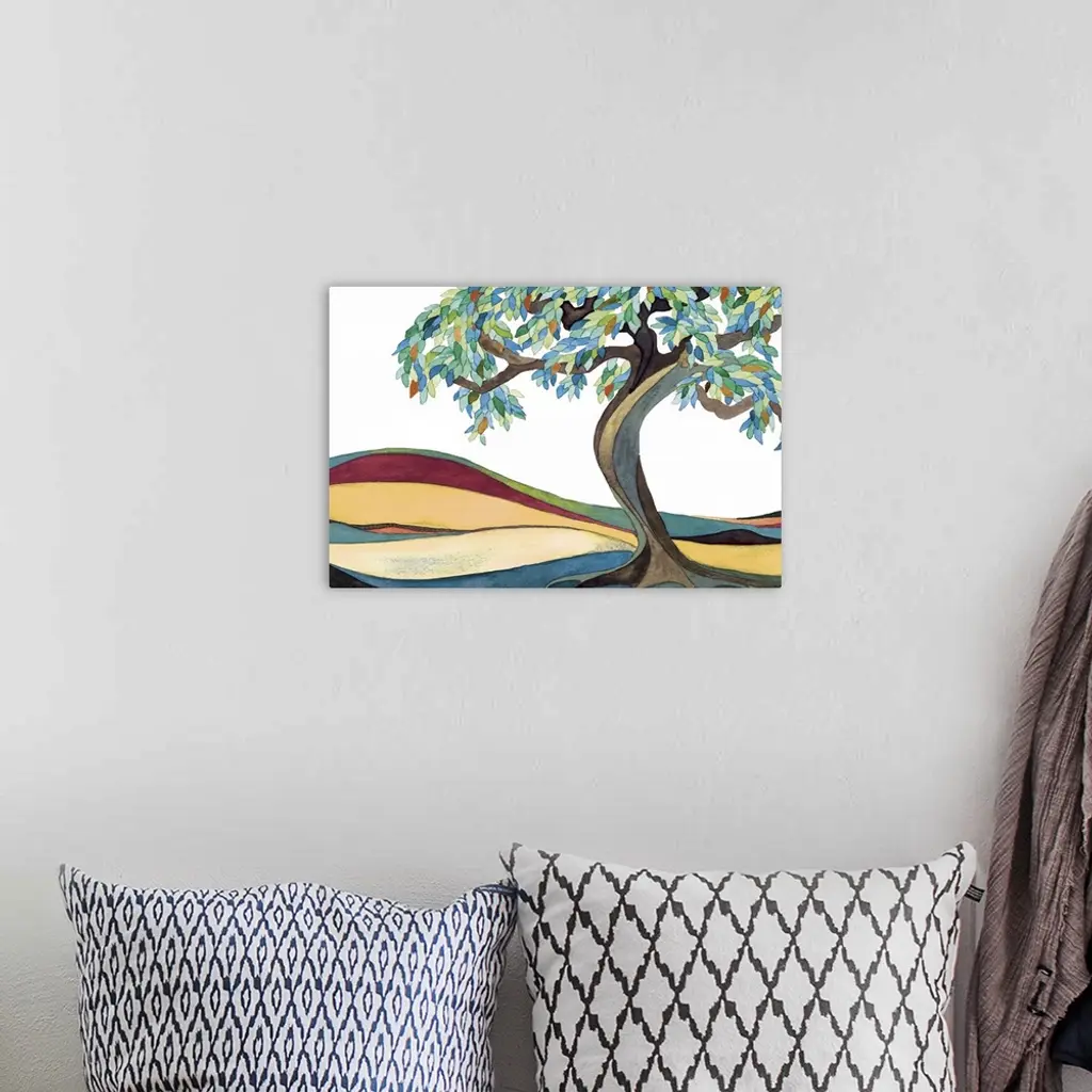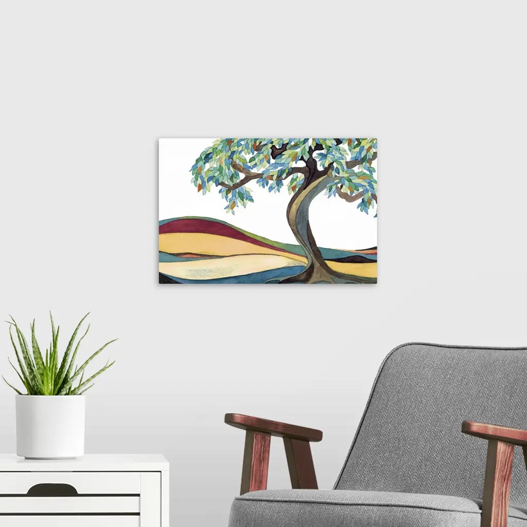 Watercolor painting of a tree with a curved trunk and leafy branches in a field.