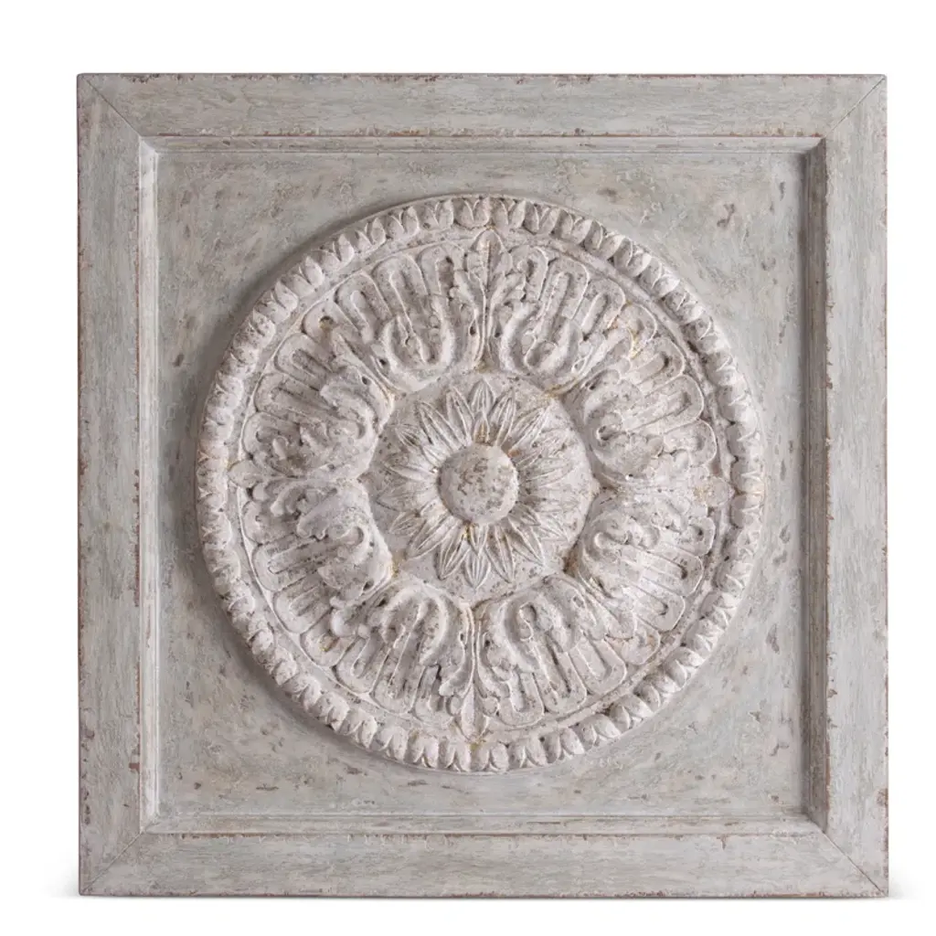 Rustic embossed architectural wood panel with "weathered" antiqued white painted finish giving the appearance of a "found" vintage item.Features:Listing is only for 1 medallion, must order desired quantityHanging hardware includedFor over a century, Bassett Mirror has been synonymous with style and quality, transforming homes with its sophisticated and timeless designs. With a wide-ranging collection of furniture, lighting, mirrors, and art, Bassett Mirror seamlessly blends modern style with classic appeal. From rustic modern to luxe glam, each piece is thoughtfully crafted to inspire and elevate any space. Committed to exceptional value and customer care, Bassett Mirror makes it easy for homeowners to create beautiful, personalized interiors with confidence.