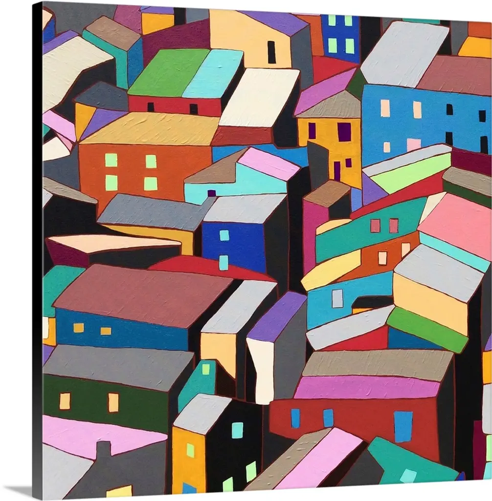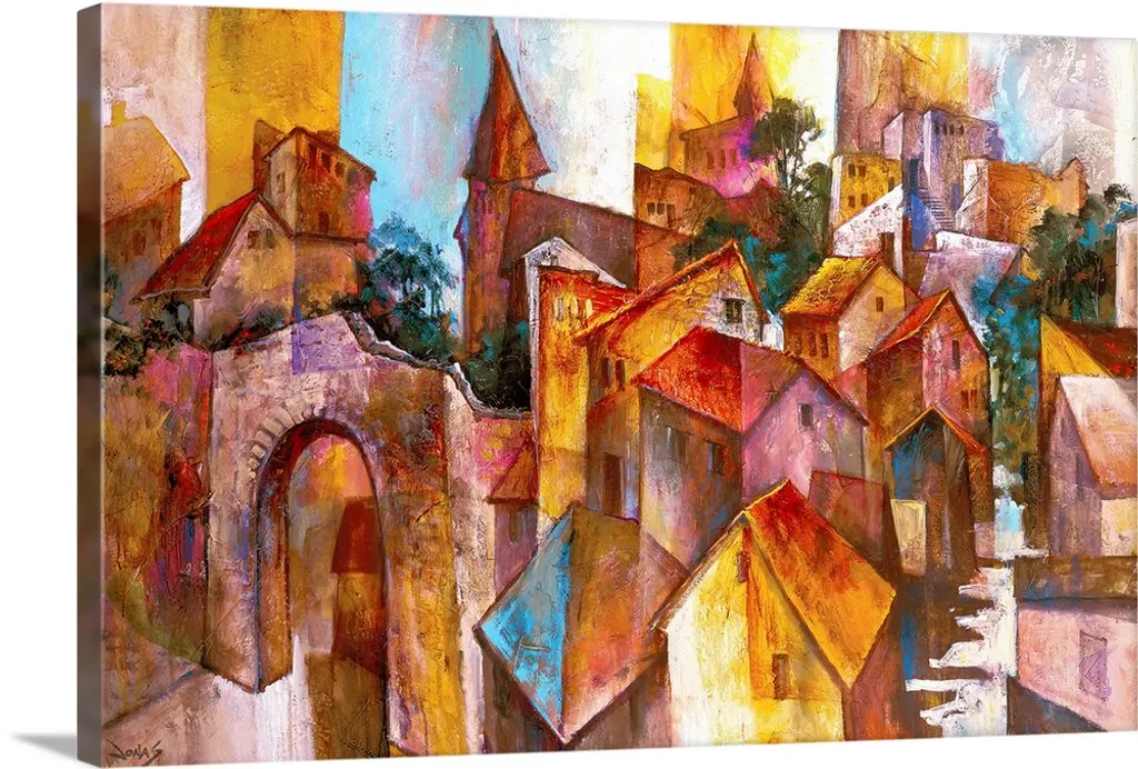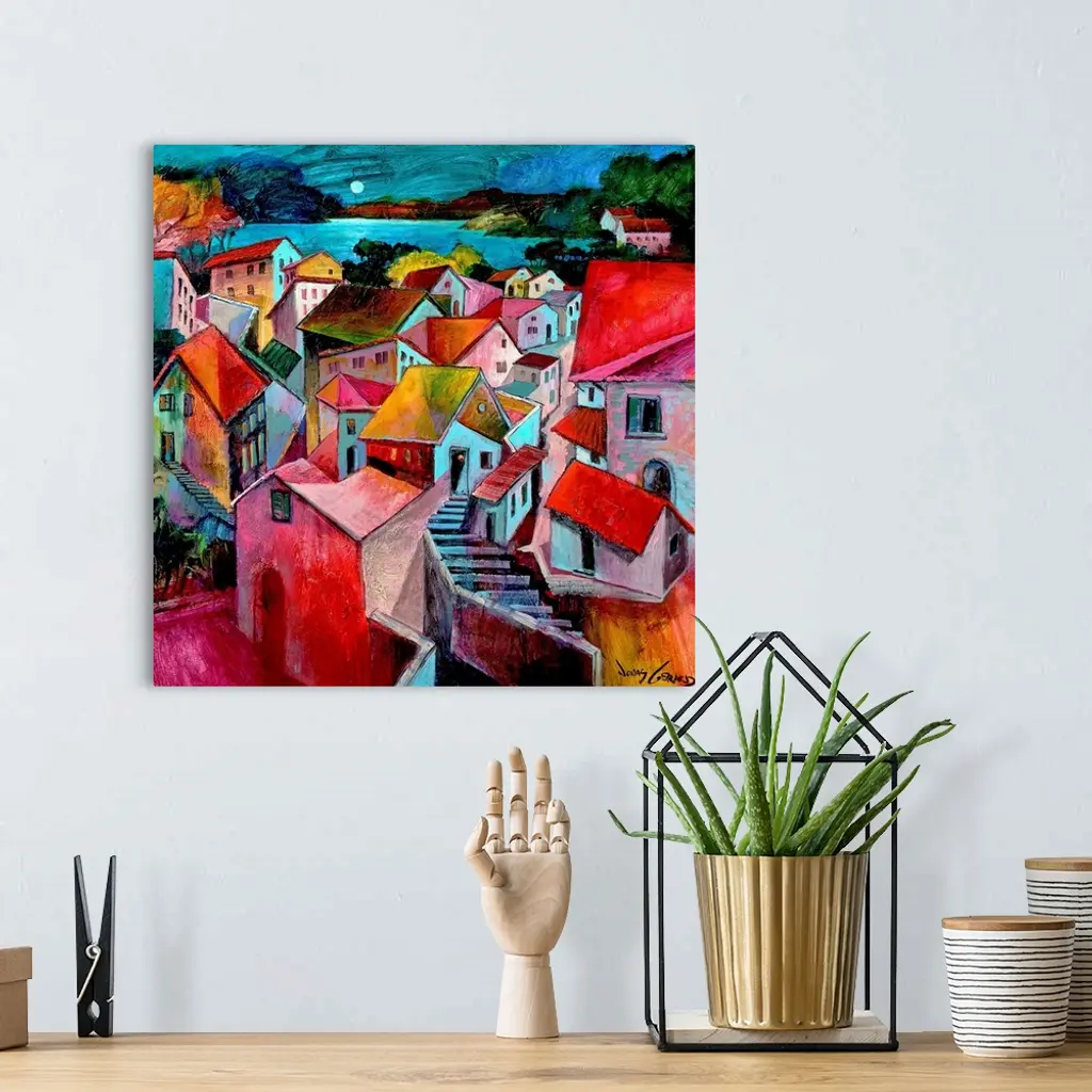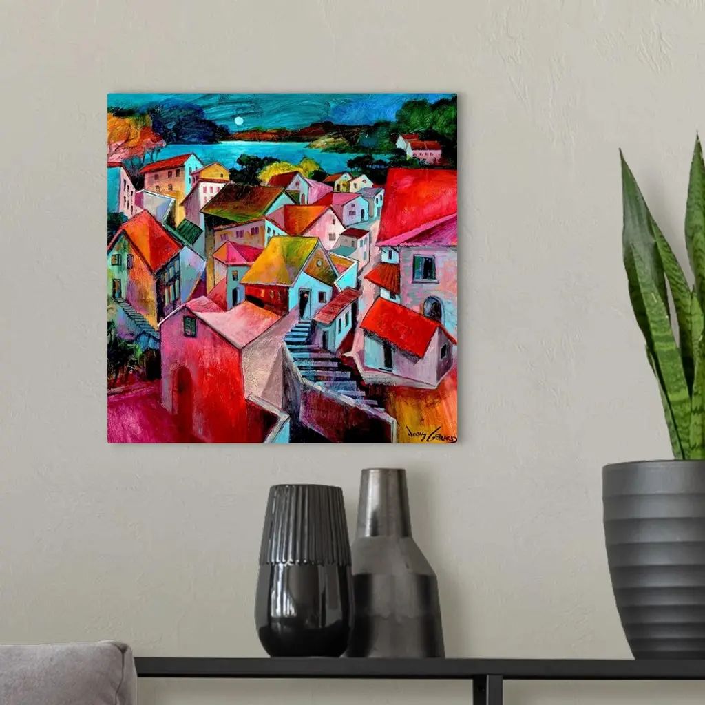 Large painting of an European village lit up at night with the moon rising in the distance.