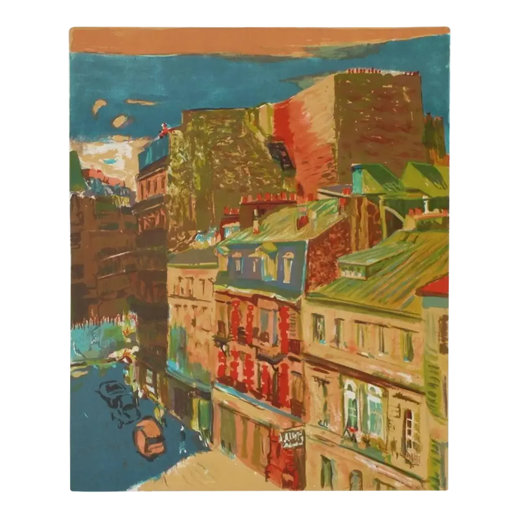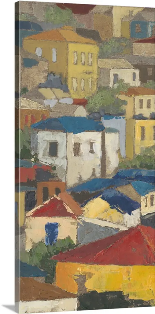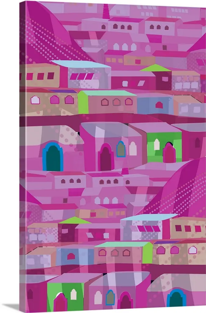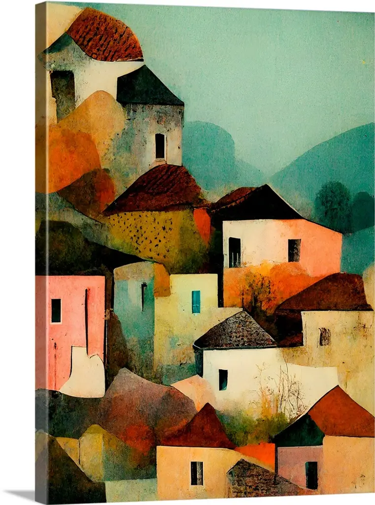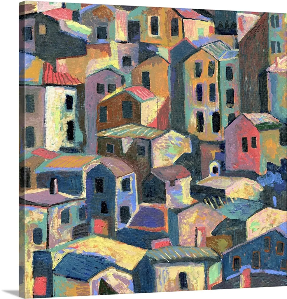 Large painting of an European village lit up at night with the moon rising in the distance.