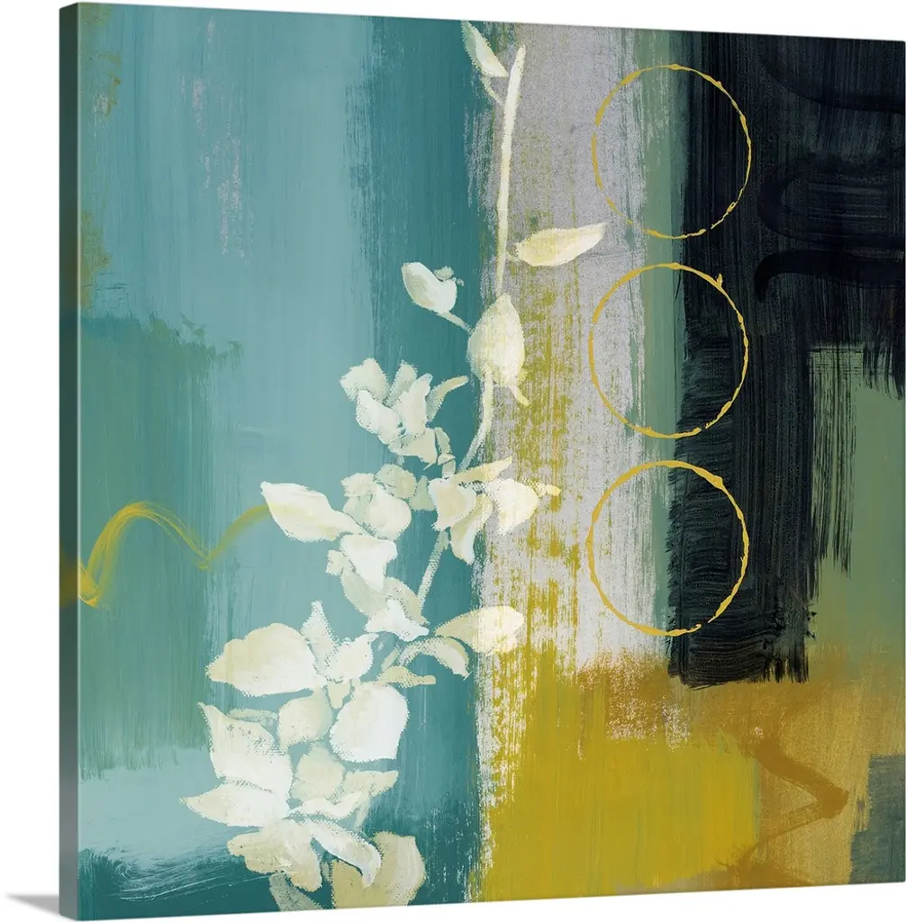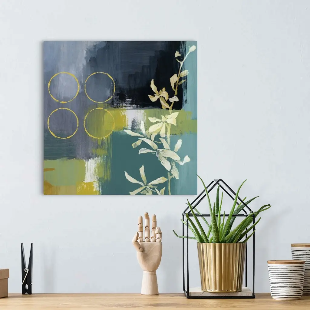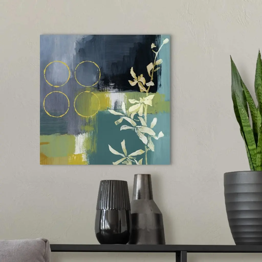 Square, oversized contemporary painting of a single floral branch on a background of various patchy cool and neutral tones, four rings placed next to each other form the shape od a square on one side.