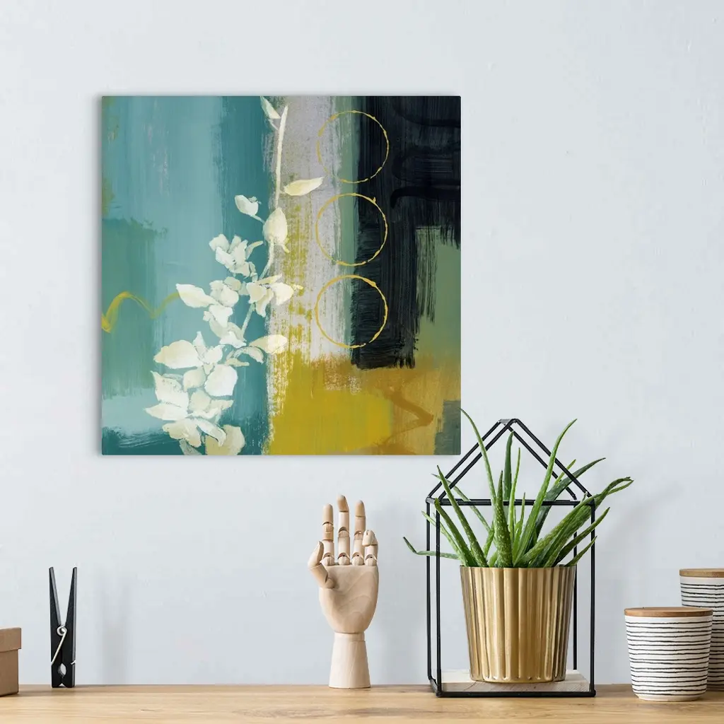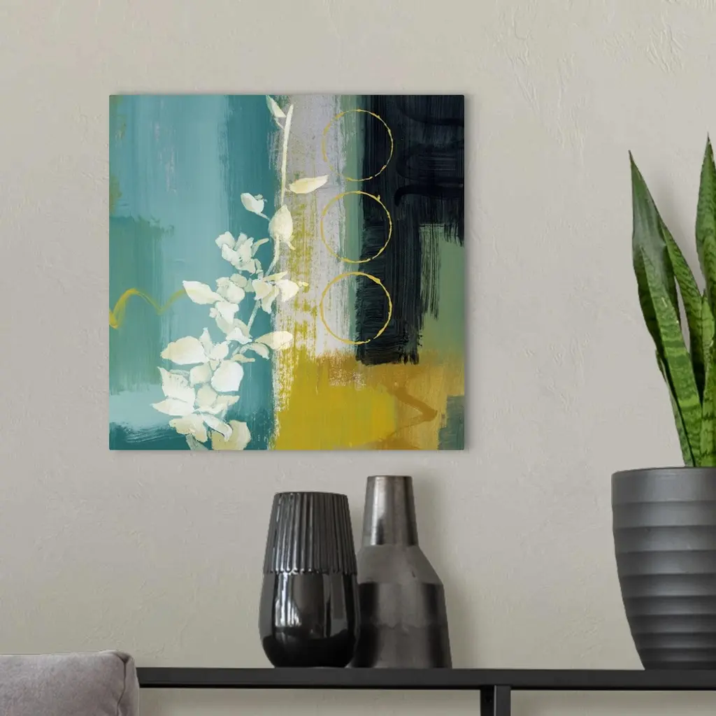 Contemporary painting of flower filled branch with abstract background and three circle outlines.