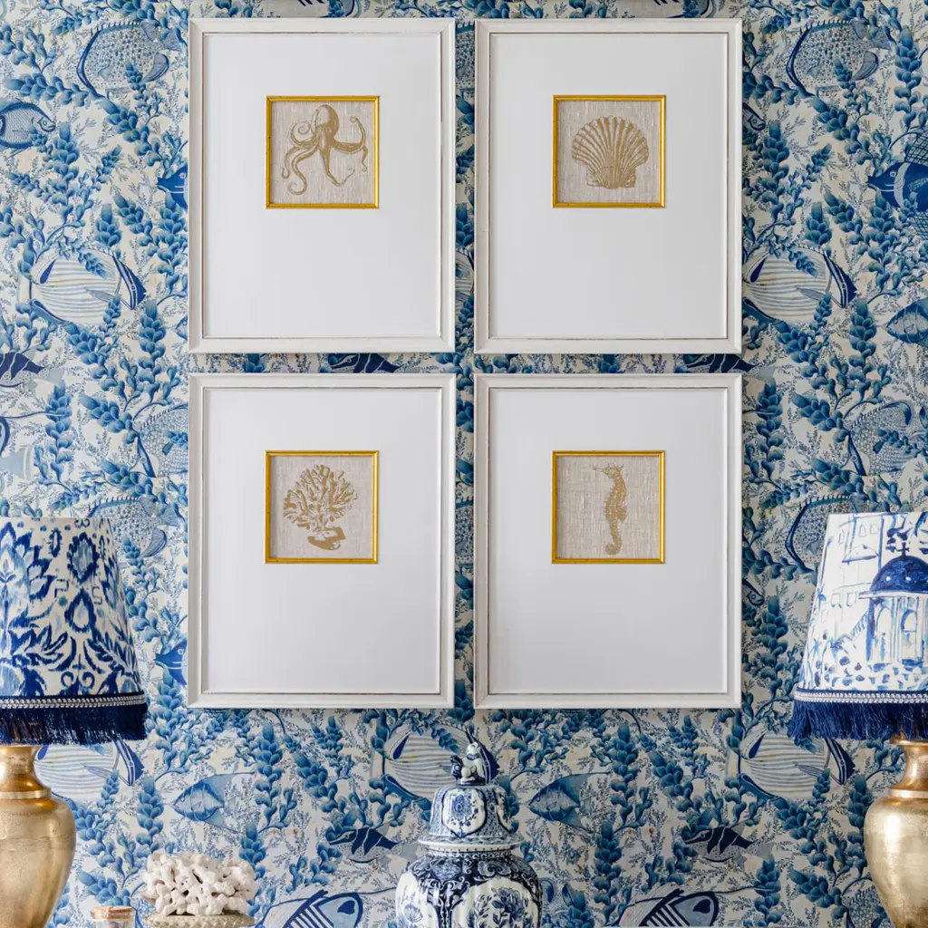 Framed Art is our luxury range for wall decorations. Fine art prints made on premium quality papers are enhanced with mountboards and high quality wood mouldings. We use Italian and English premium mouldings so we can offer a high end range of artworks. Precious corals and sea creatures founded in the Mediterranean Sea are artistically reproduced using the gold foil print on linen technique in this series of meticulously crafted artworks. Epitome for sophisticated simplicity, each of this stylish embellished prints is finished with golden inner frames, ivory mats and double framed with vintage washed grey mouldings. To be sold individually or as a set of six.