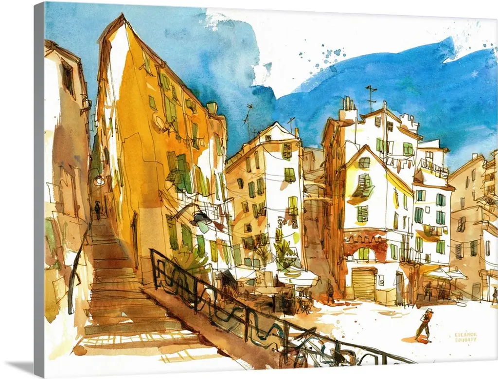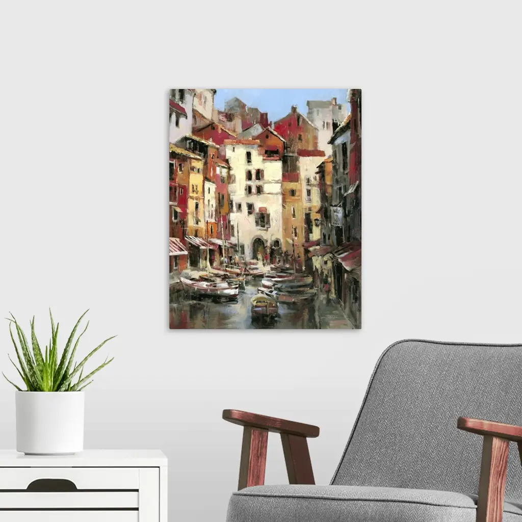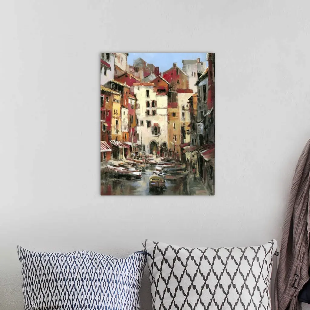 Contemporary painting of a village corridor harbor with docked boats.