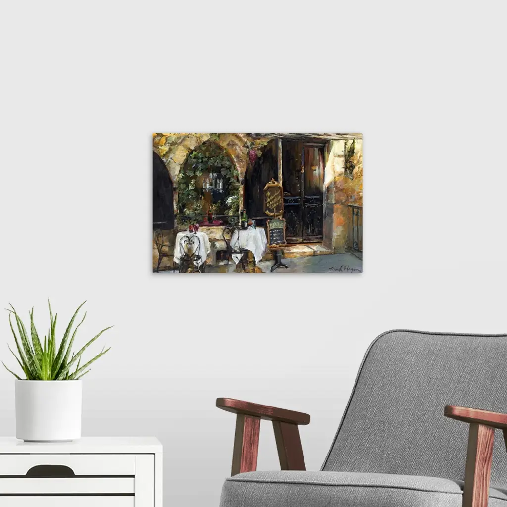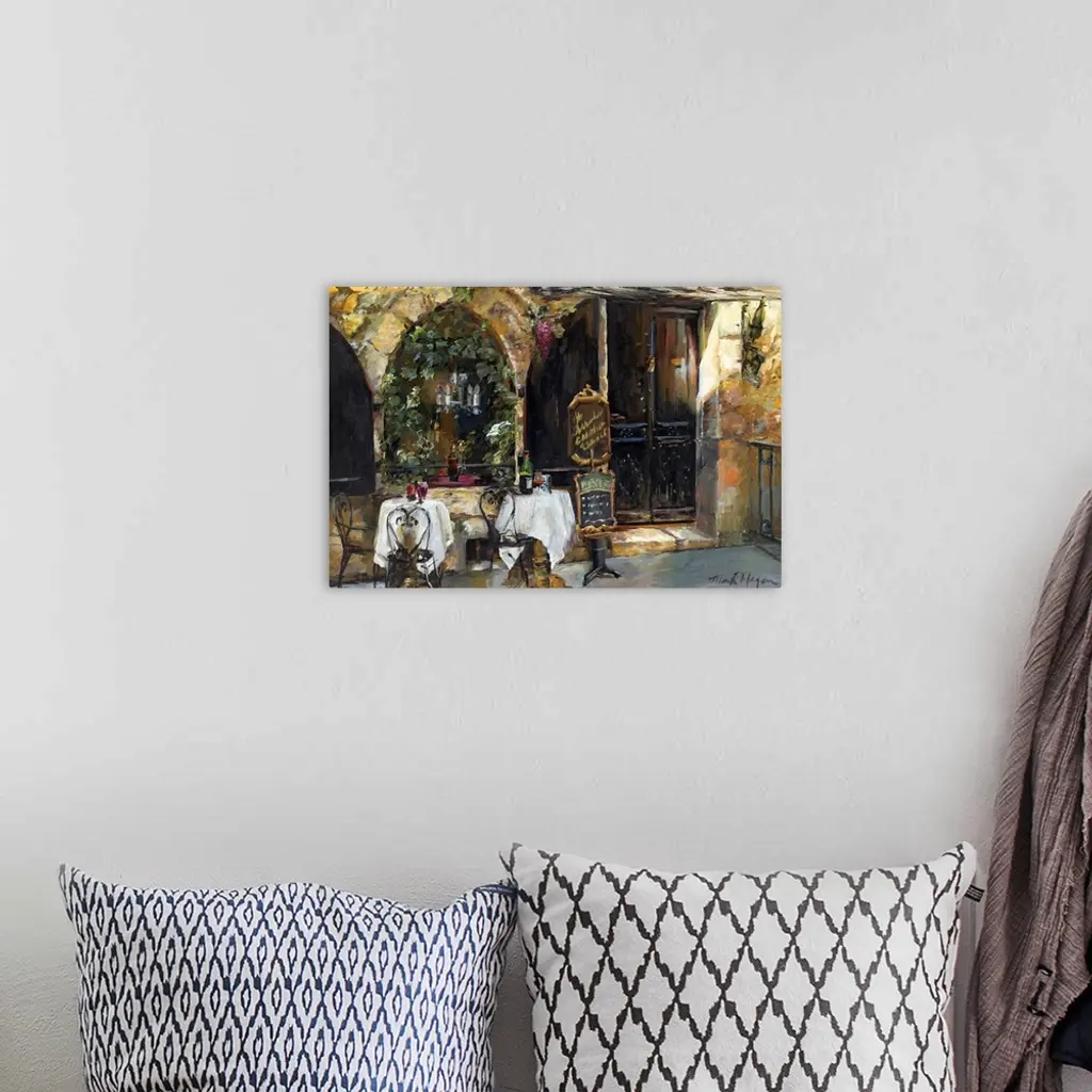 An impressionistic painting of an outdoor cafo in a rustic European city.