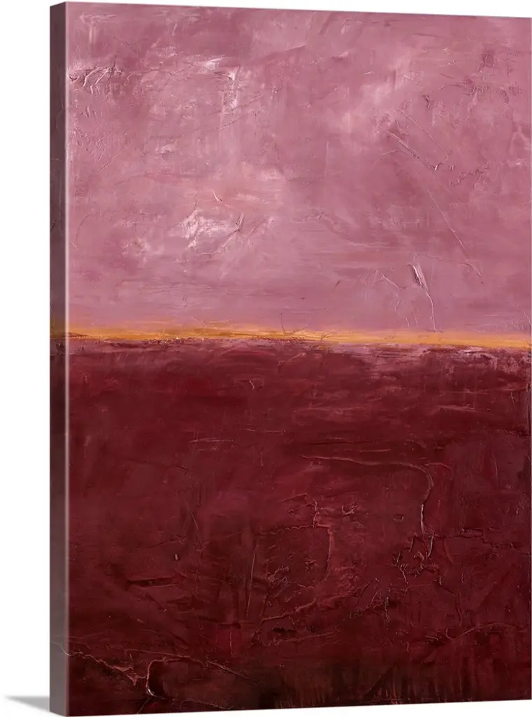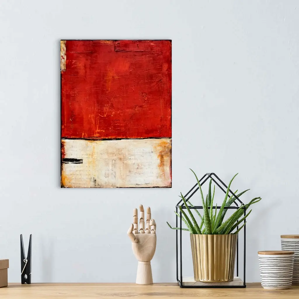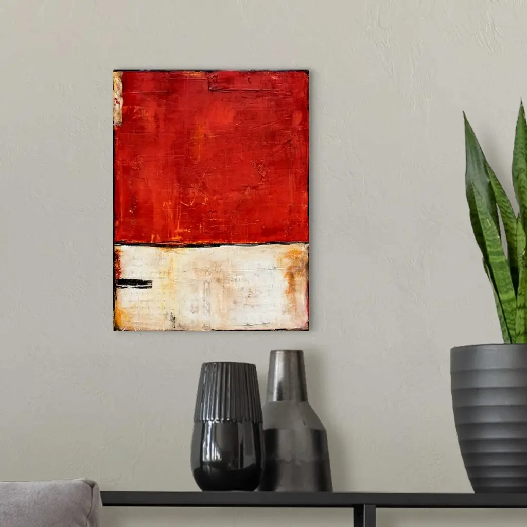 Abstract painting with red and white splitting the painting in half with a thin, black squiggly line running through the center and subtle hints of sheet music showing through the paint from beneath.