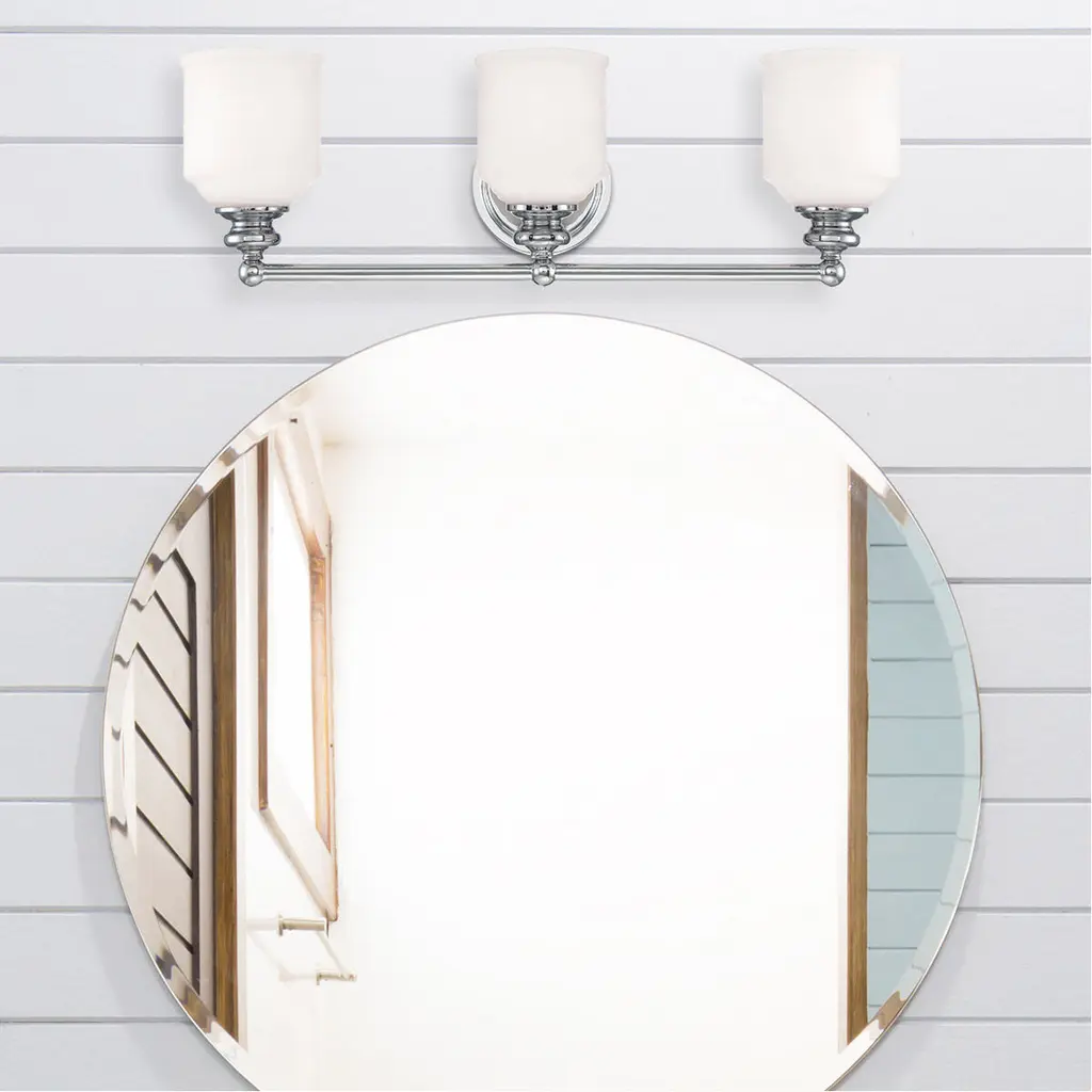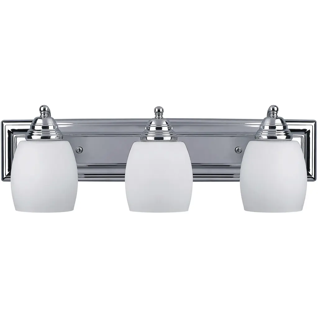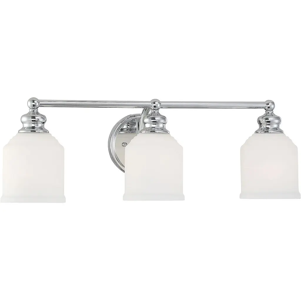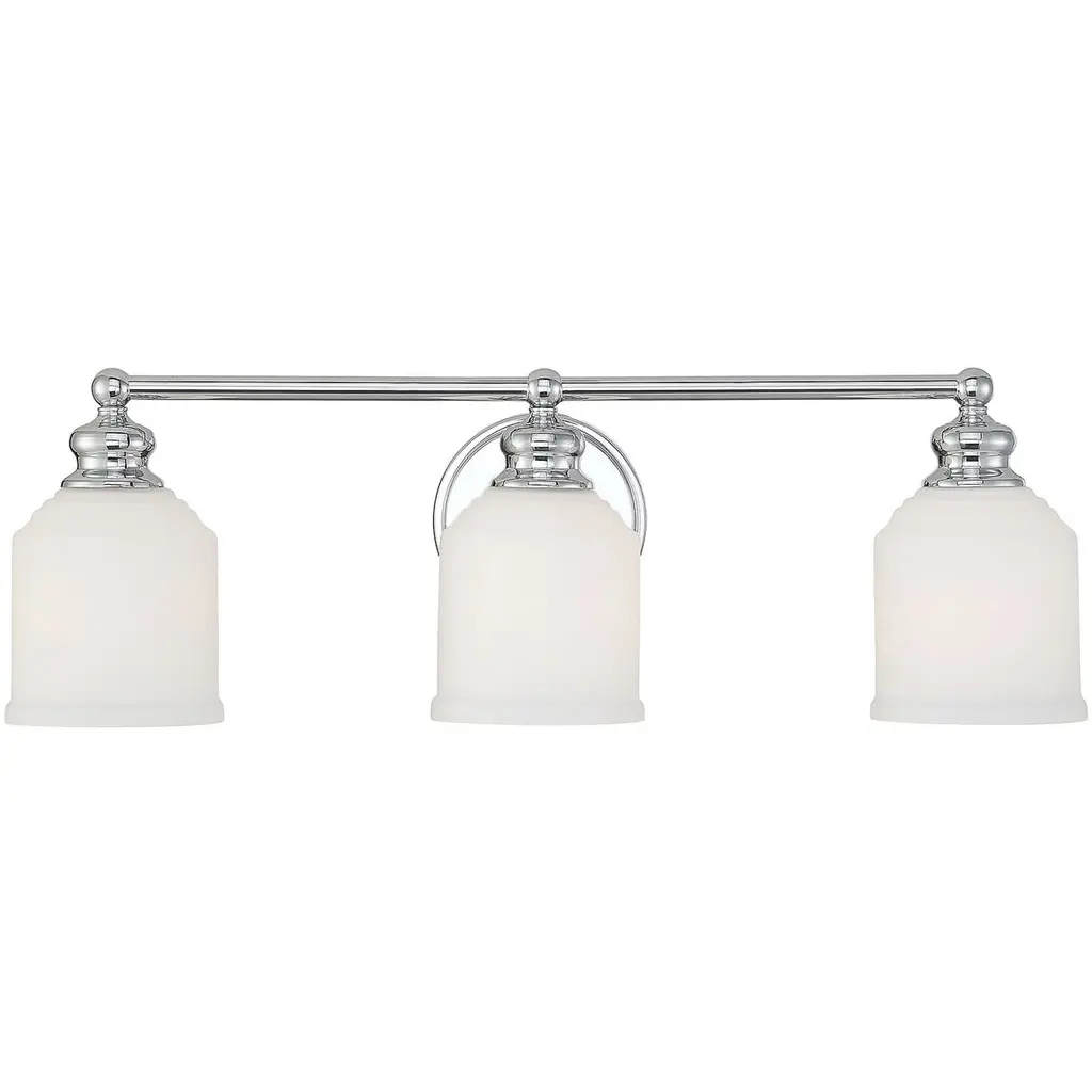 From Savoy House, the Melrose 3-light bath vanity bar stylishly updates classic Americana design for today's interiors. It features modern lines, white opal glass shades and a polished chrome finish. It may be mounted as either uplight or downlight. Bath bar lights are a classic choice for illuminating vanity mirrors in bathrooms big and small. The polished chrome finish can be paired with chrome hardware or mixed with hardware in other finishes. Bring Melrose into bathrooms of traditional, transitional or classic style to improve the look and the lighting. When you choose a Savoy House lighting fixture, you can be certain youve selected a piece that will withstand the test of time.