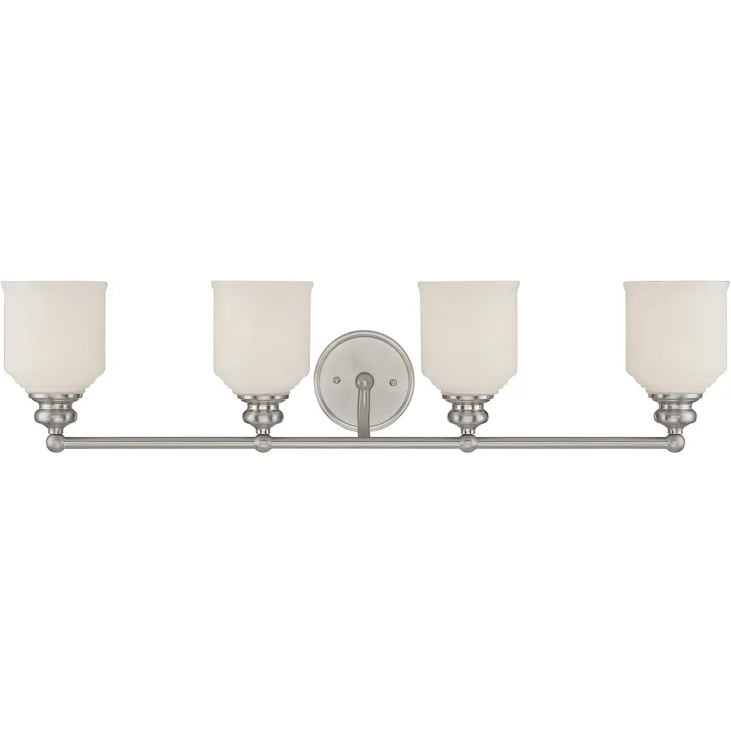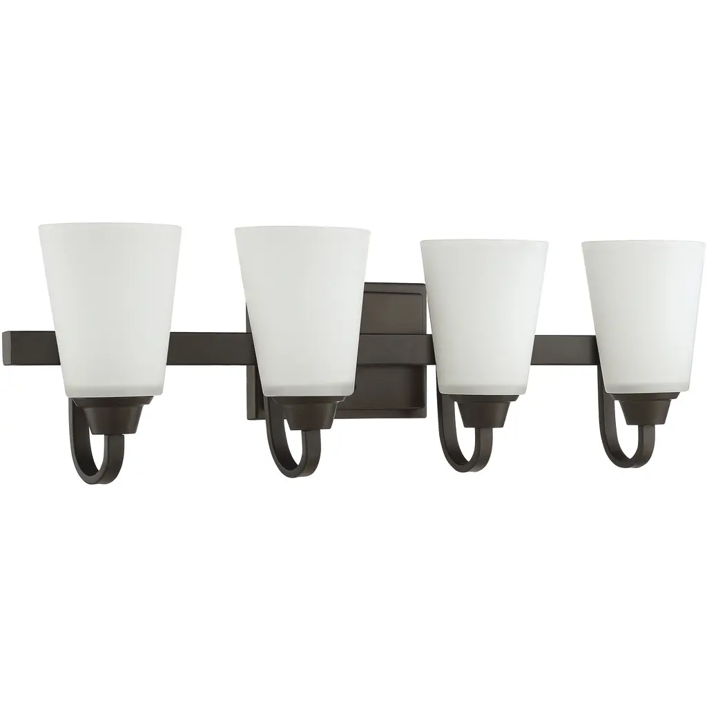 From Savoy House, the Melrose 4-light bath vanity bar stylishly updates classic Americana design for today's interiors. It features modern lines, white opal glass shades and an English bronze finish. It may be mounted as either uplight or downlight. Bath bar lights are a classic choice for illuminating vanity mirrors in bathrooms big and small. The English bronze finish can be paired with bronze hardware or mixed with hardware in other finishes. Bring Melrose into bathrooms of traditional, transitional or classic style to improve the look and the lighting. When you choose a Savoy House lighting fixture, you can be certain youve selected a piece that will withstand the test of time.