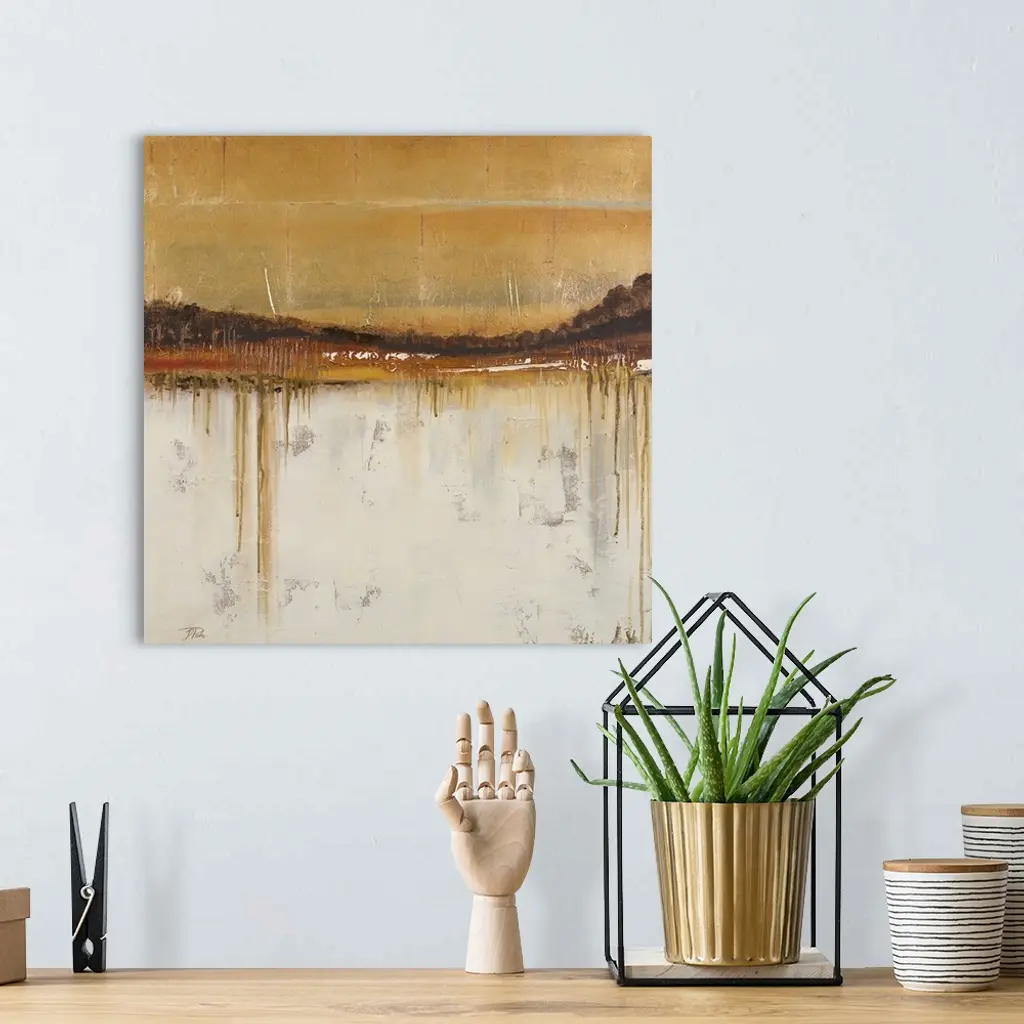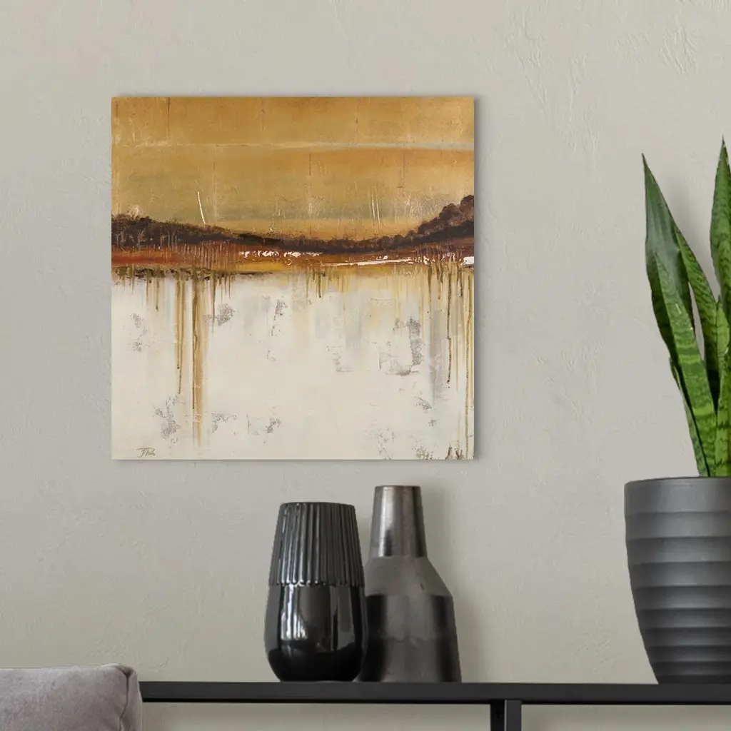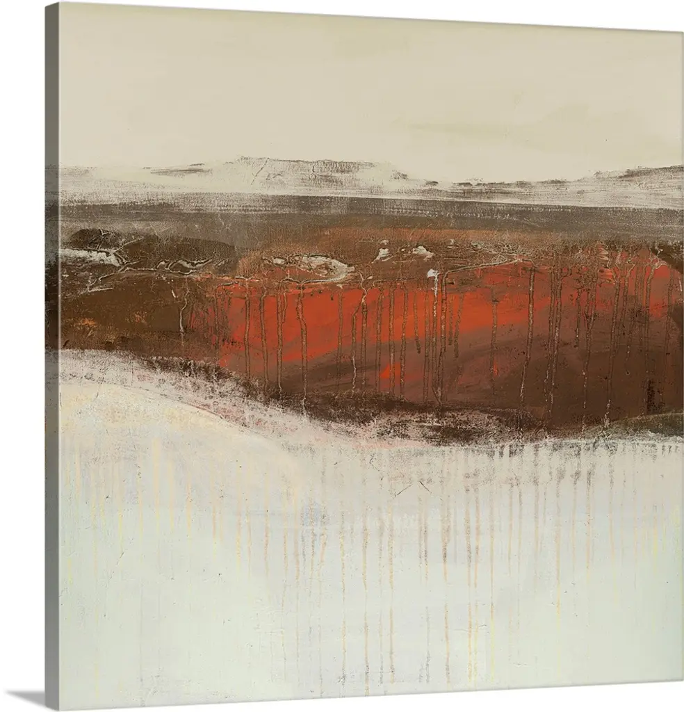 This is an abstract painting that uses earth tones to create layers of color and textures in this square abstract painting.