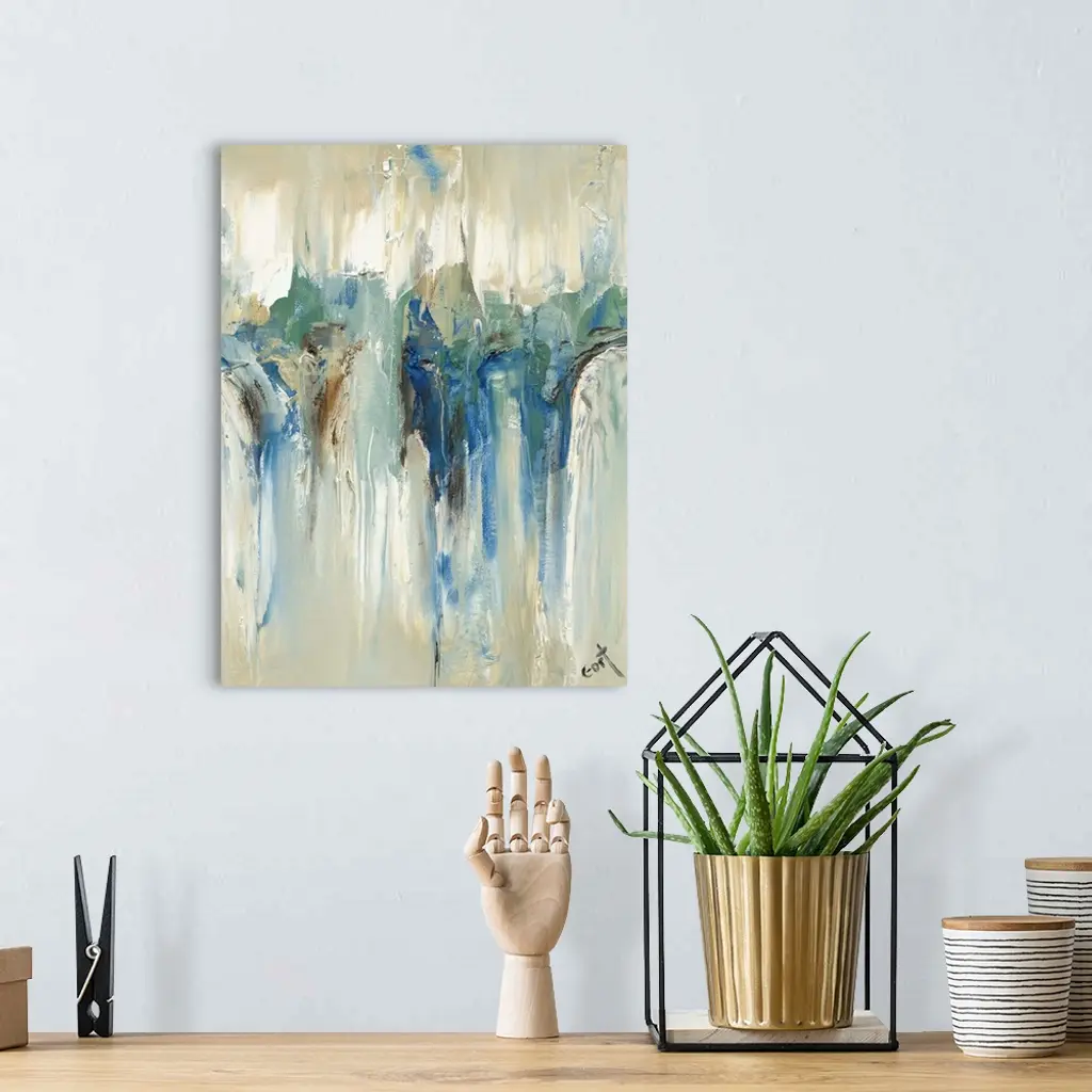 Large contemporary painting with an abstract design in the middle on a beige background with blue, green, and brown tones falling from the middle to the bottom of the canvas.