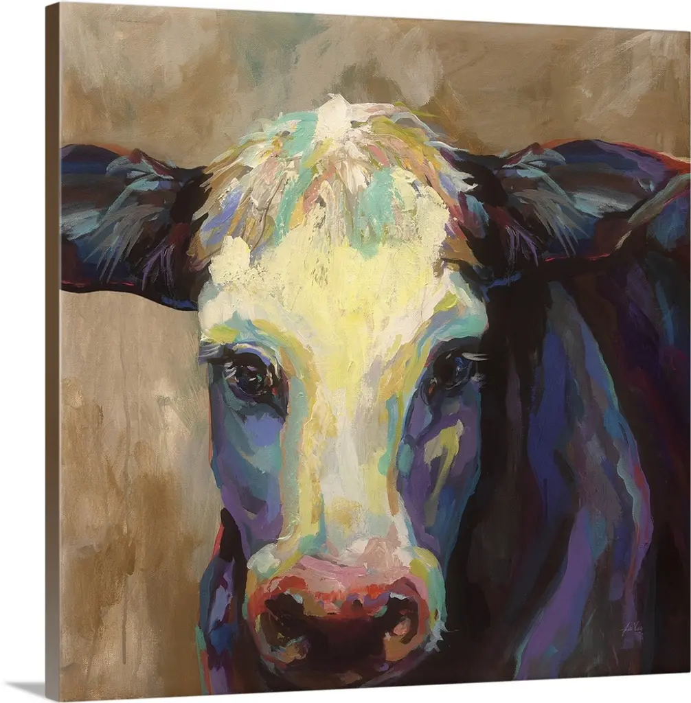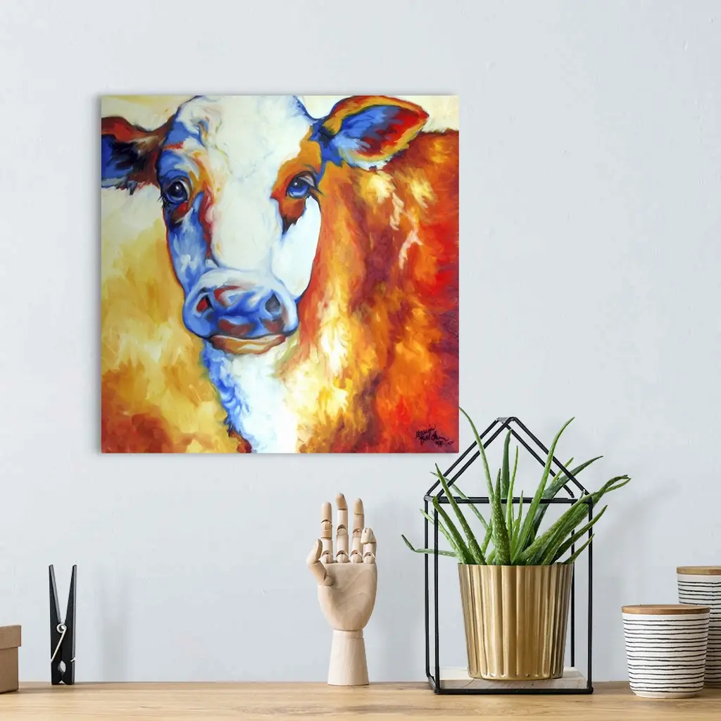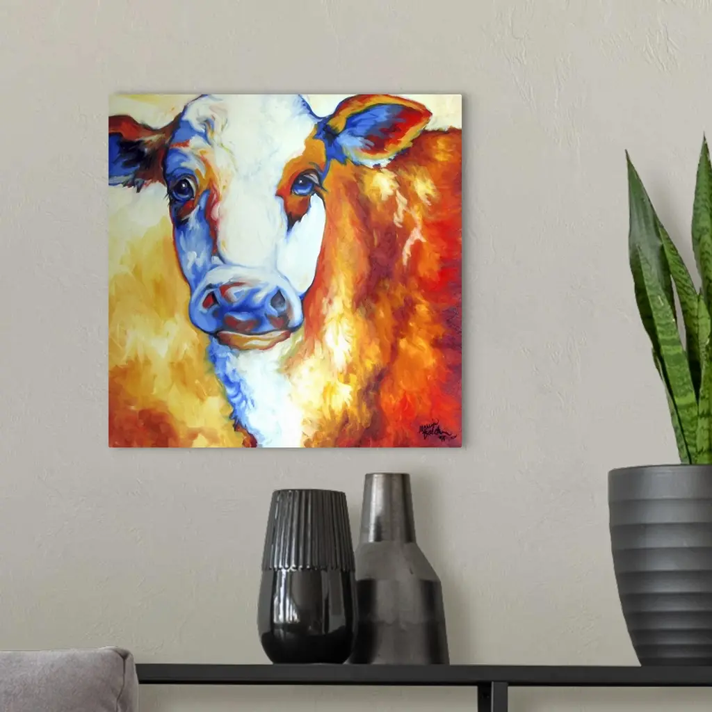Contemporary painting of a cow made with orange, yellow, red, white, and blue hues on a square background.