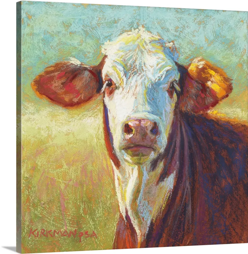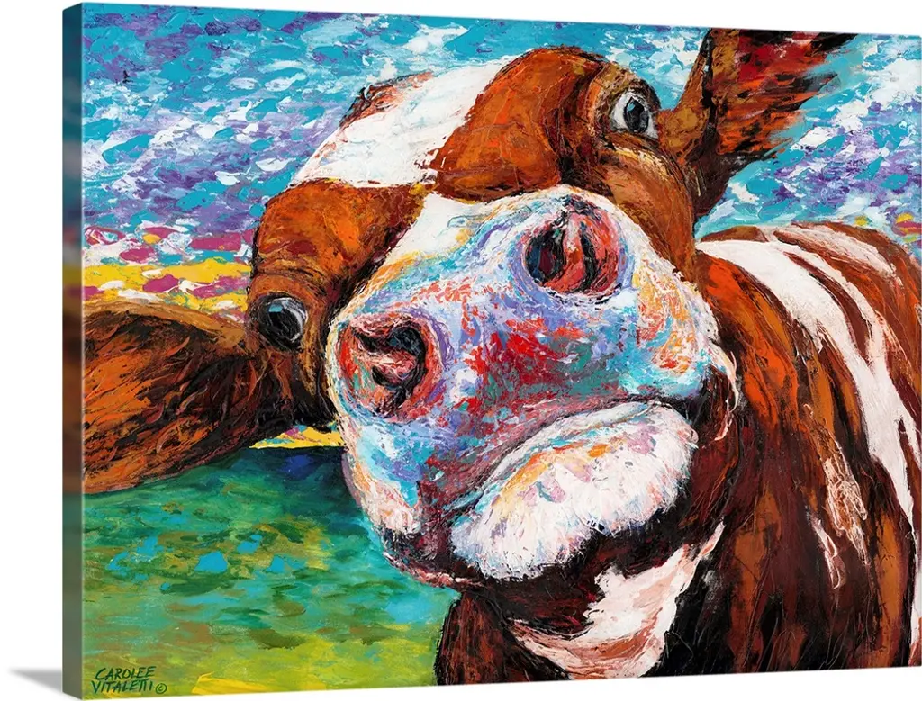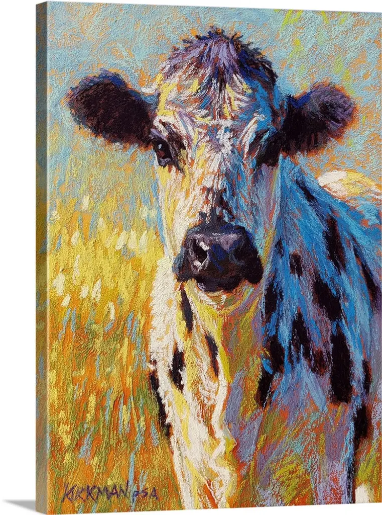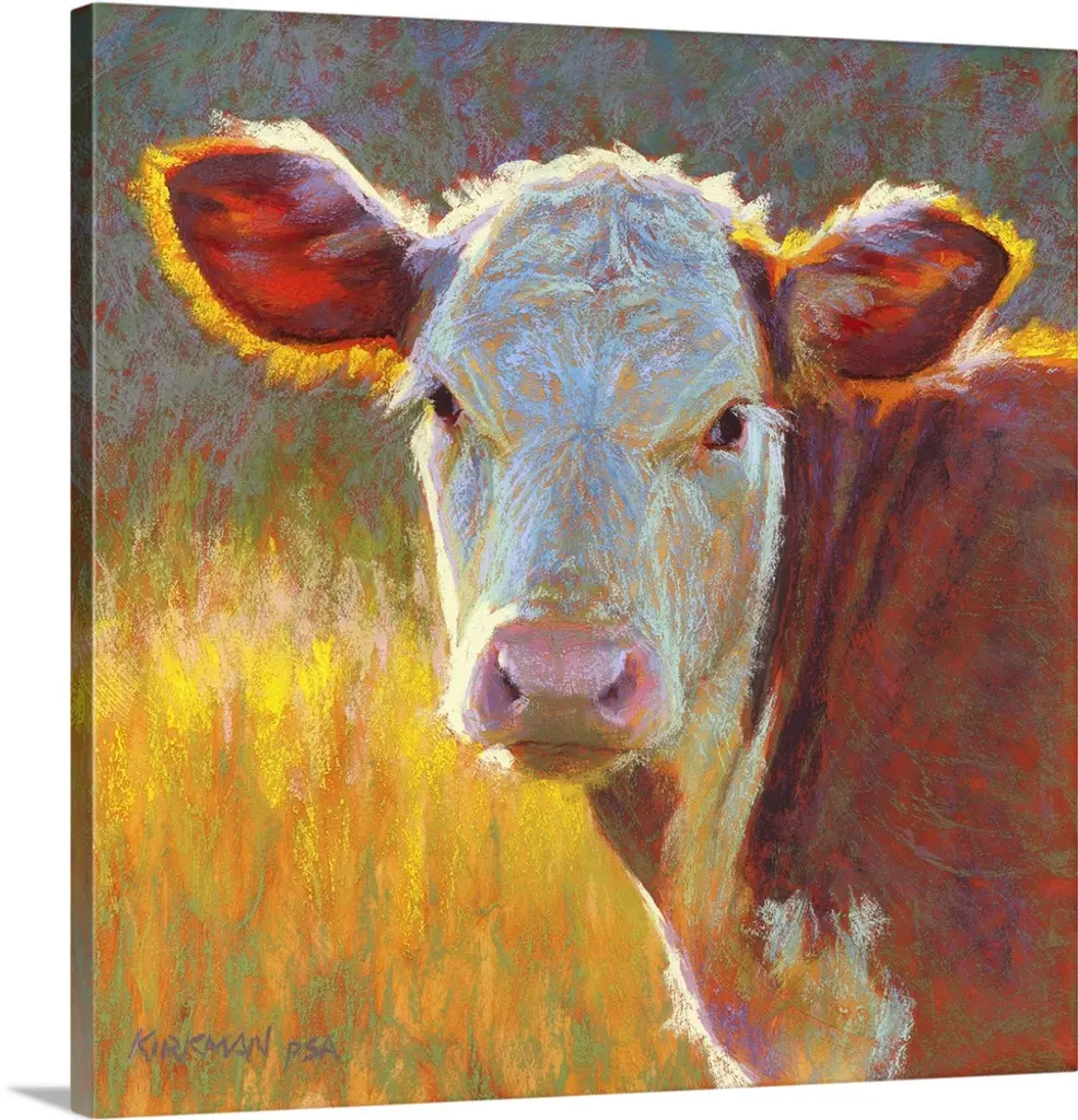Contemporary painting of a cow made with orange, yellow, red, white, and blue hues on a square background.