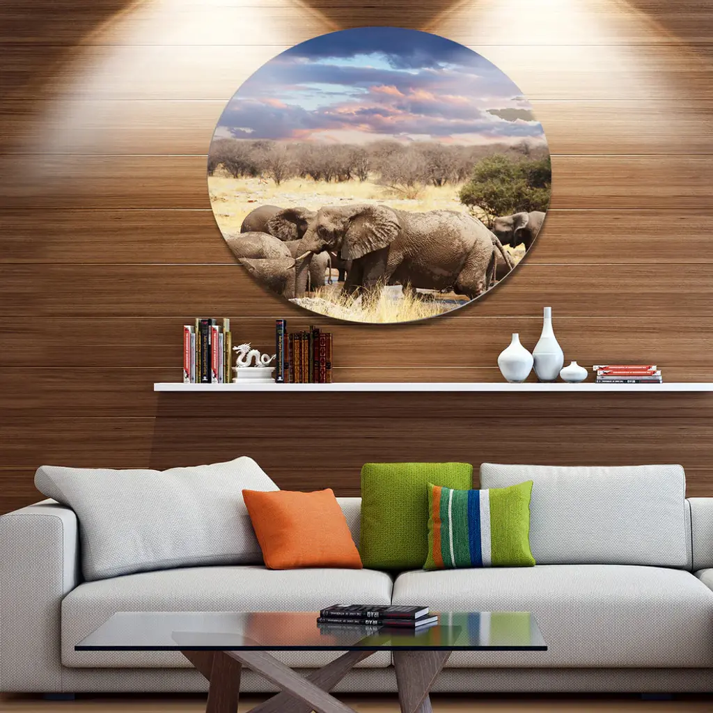 Memory Of Elephants In Bush, Animal Round Metal Wall Art, 23"