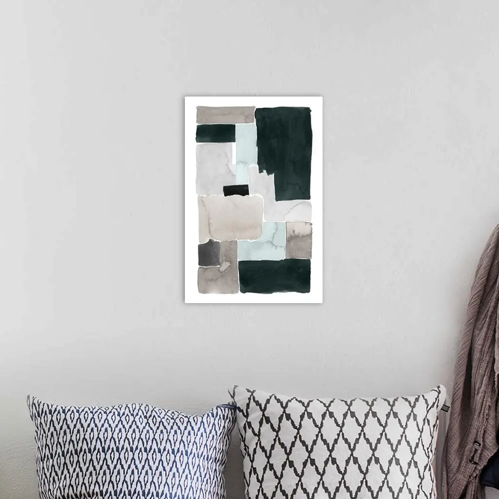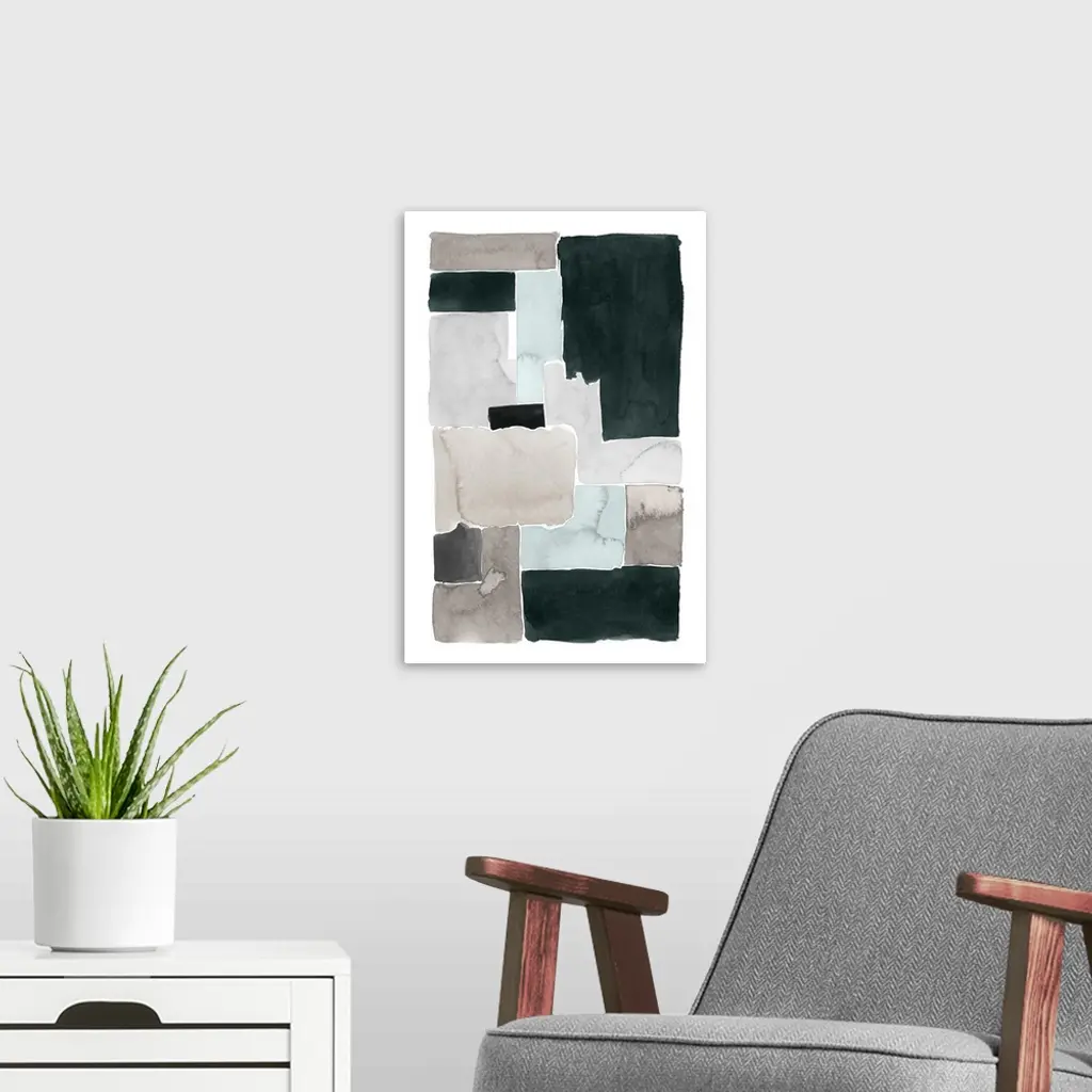 Contemporary abstract painting with blocks of grey and black on a white background.