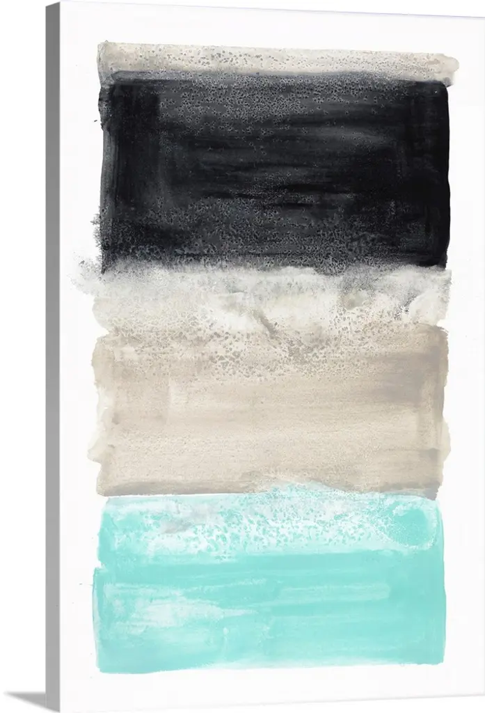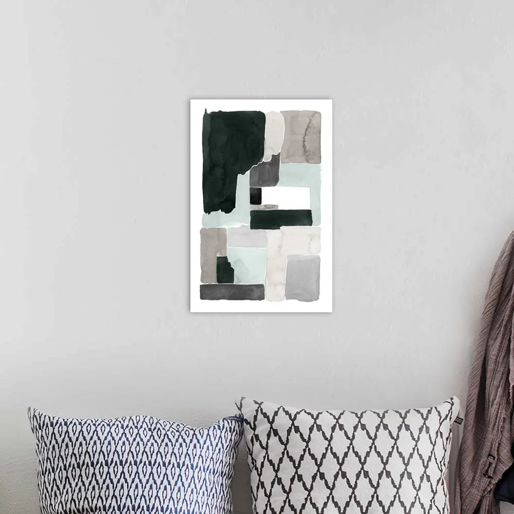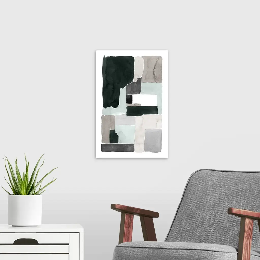 Contemporary abstract painting with blocks of grey and black on a white background.