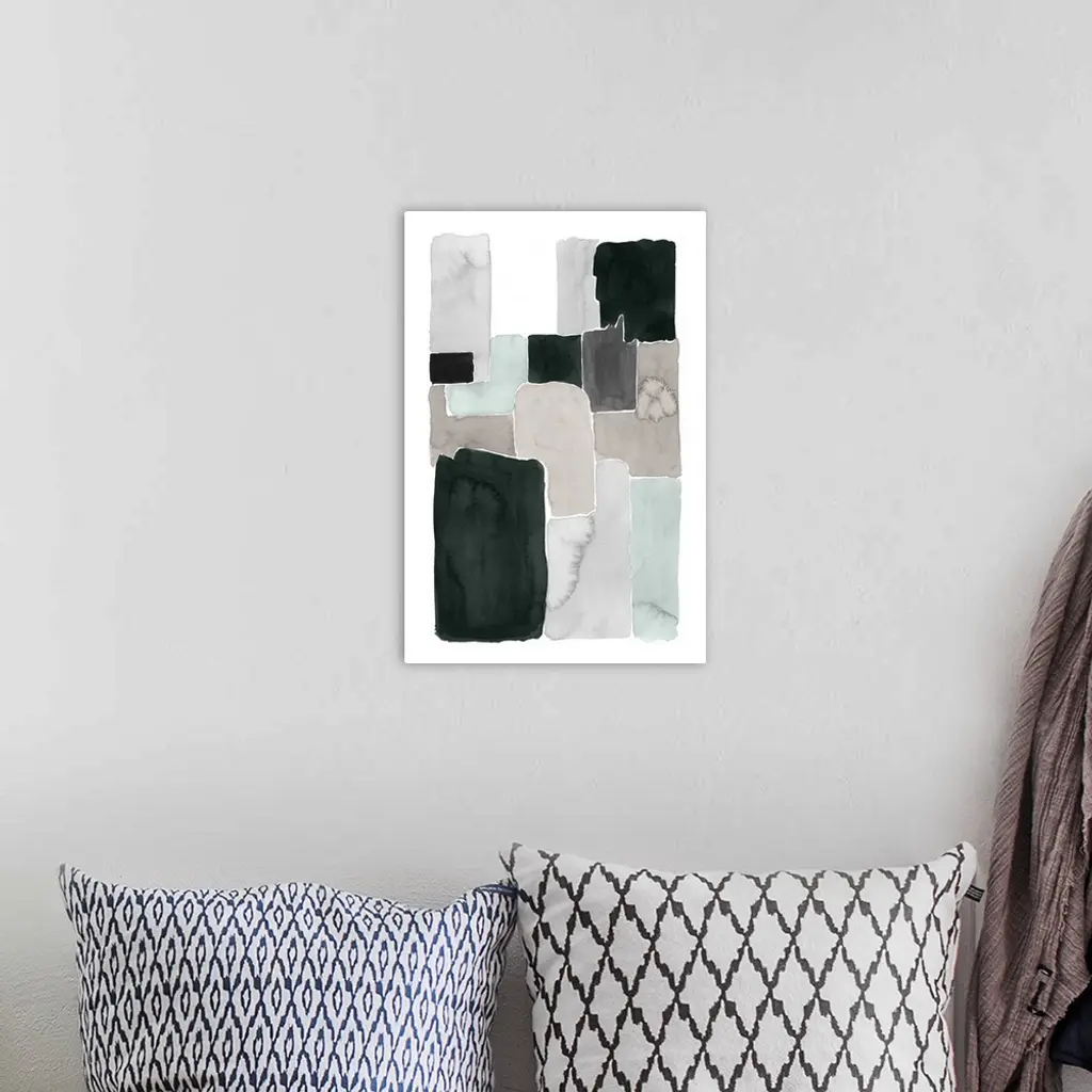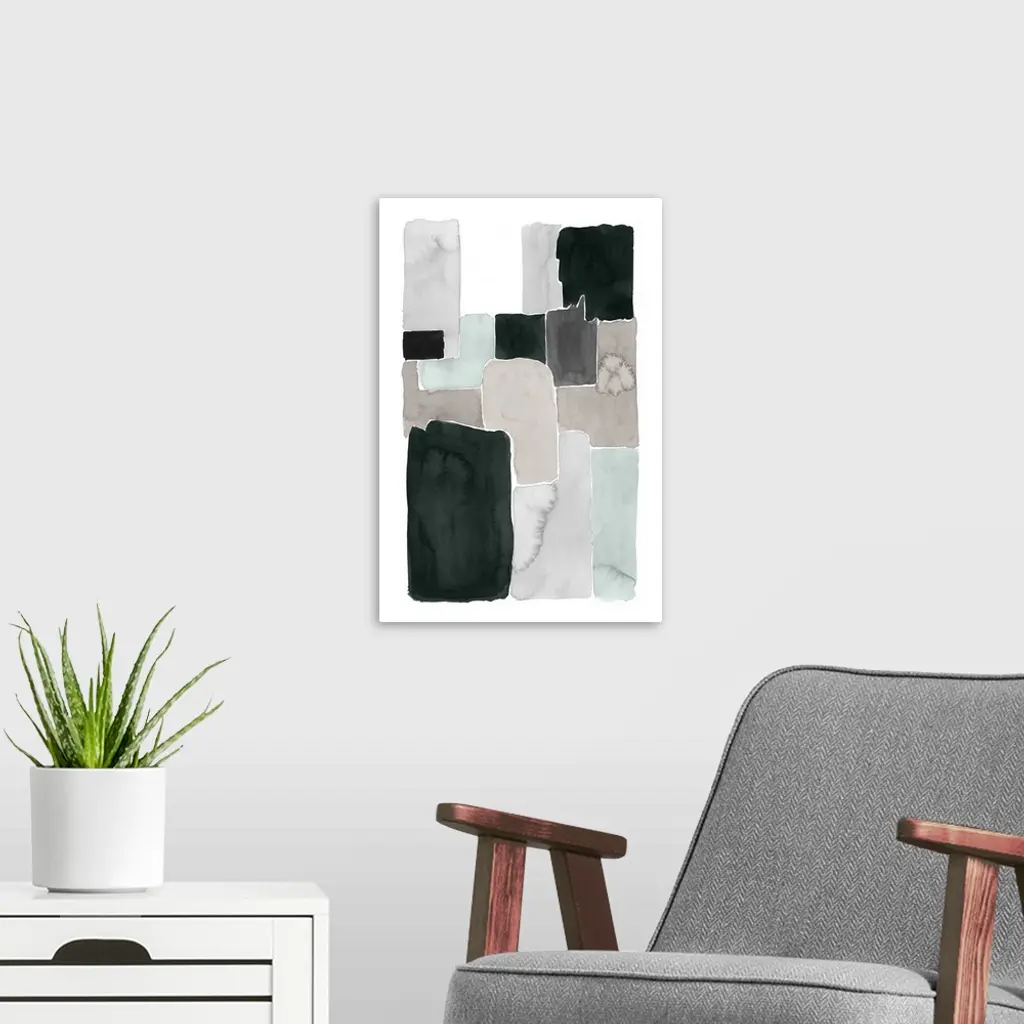 Contemporary abstract painting with blocks of grey and black on a white background.