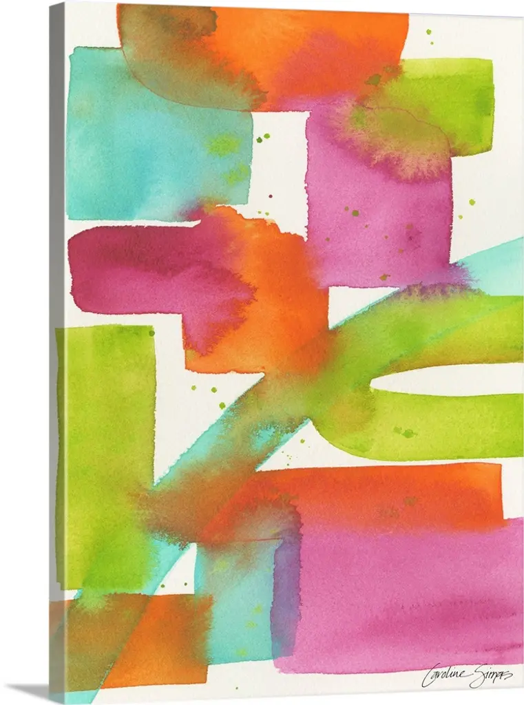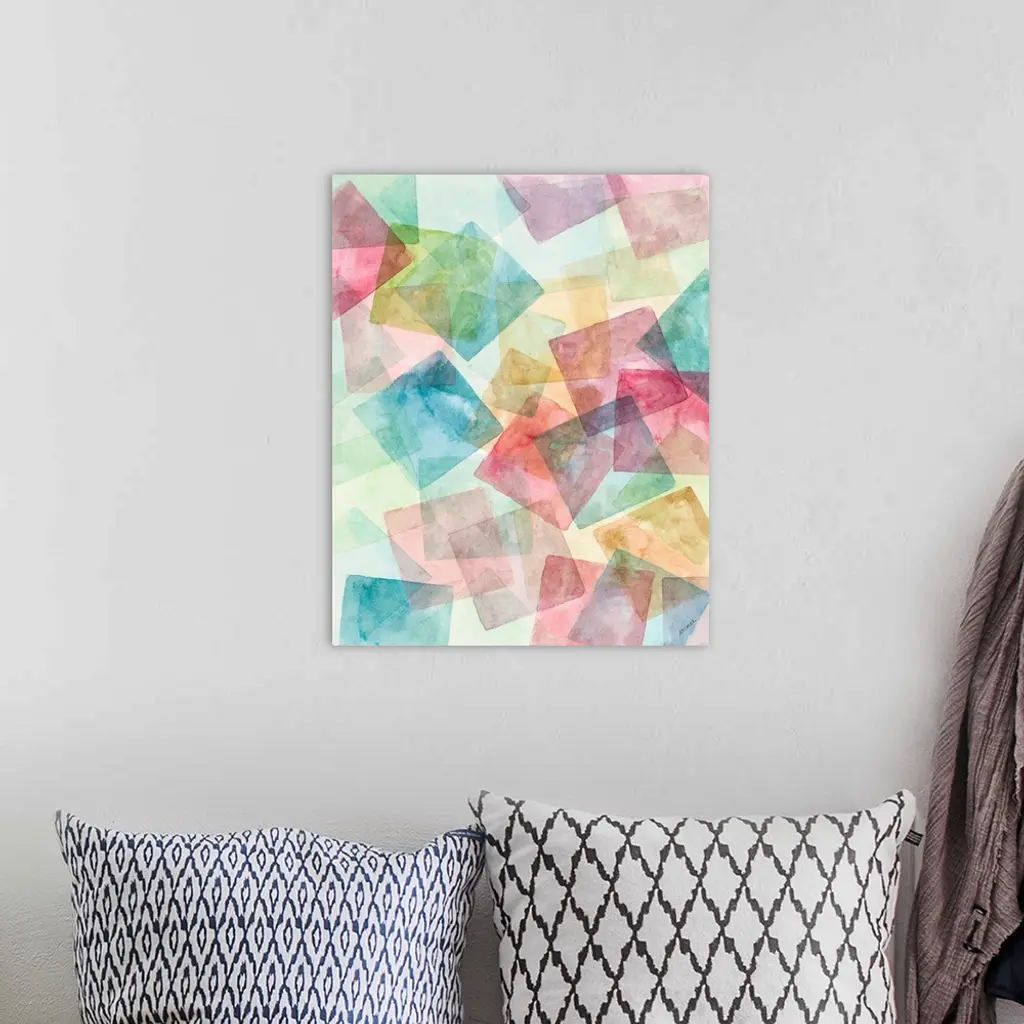 A contemporary watercolor painting of colorful geometric square shapes merging together.