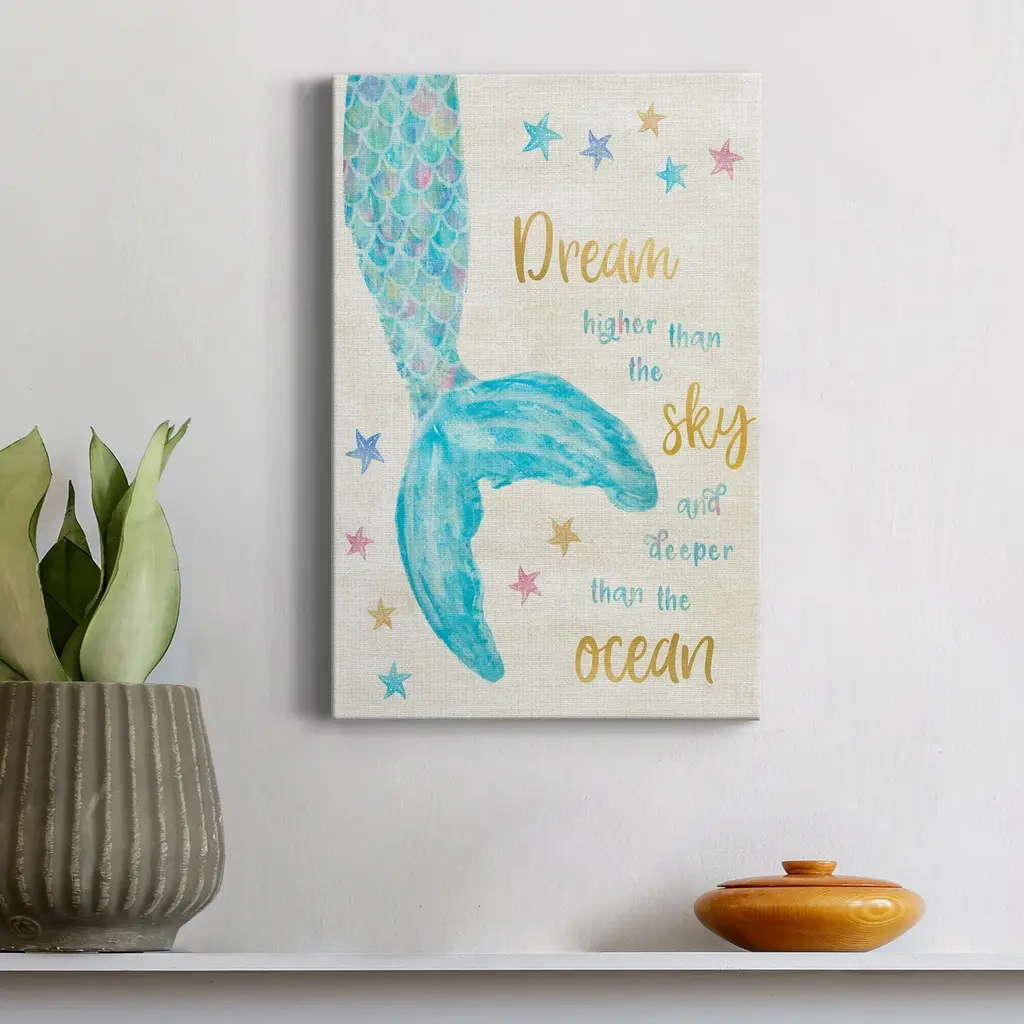 Mermaid Dream Premium Gallery Wrapped Canvas - Ready to Hang A premium hand stretched gallery wrapped canvas print created to last. Featuring a beveled a solid wood stretcher bar, each piece comes ready to hand 5 SIZES AVAILABLE 8''X12'' - Overall Size 16'X20'' - Overall Size 24''x32'' - Overall Size 30''x40'' - Overall Size 36''x48'' - Overall Size Each piece is made to order. Built to Last Each piece comes ready to hang Solid wood stretcher Fade and Water resistant Made domestically