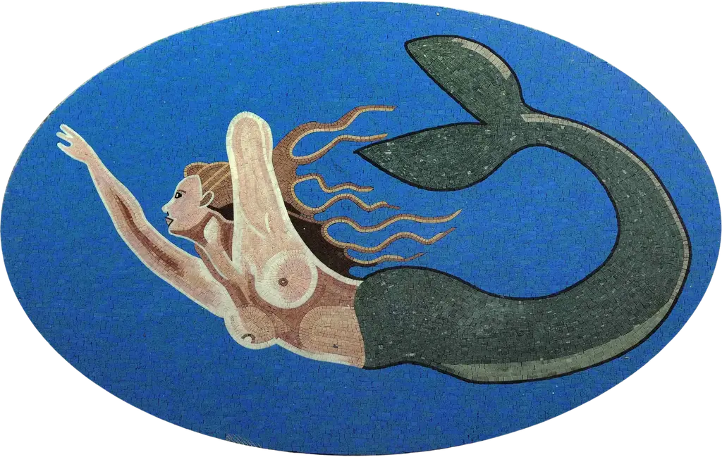 Dive into the enchanting world of oceanic beauty with our stunning "Mermaid Full Portrait Mosaic." This exquisite piece captures the grace and allure of a mermaid in a breathtaking embodiment of artistry and craftsmanship. Portrayed in a poised seated position, the mermaid boasts a regal posture, with her shimmering golden hair cascading elegantly down her back, creating a striking contrast against the vibrant hues of the ocean.Handmade from natural stones, each mosaic piece is meticulously selected and placed to bring this captivating figure to life. The intricate details of the mermaid's form and the vivid blue tones of the surrounding water are designed to transport you to a serene underwater realm, making this artwork a perfect focal point for any room. Whether you're a lover of marine life, a collector of unique home decor, or simply looking to add a touch of whimsy to your space, this mosaic serves as a breathtaking addition to your collection.The "Mermaid Full Portrait Mosaic" not only adorns your walls but also tells a story of mythical beauty and wonder. Its effortless blue touches echo the depths of the sea, evoking a sense of tranquility and inspiration. Ideal for living rooms, bedrooms, or creative spaces, this mosaic harmonizes with various decor styles, from coastal and bohemian to contemporary chic.Elevate your decor with a piece that combines artistic skill with natural elements. This enchanting mermaid mosaic will surely catch the eyes of all who enter your home, inviting them to admire its beauty and revel in the magic of the sea. Embrace the spirit of the ocean and bring a touch of fantasy into your living space with this remarkable piece of art.