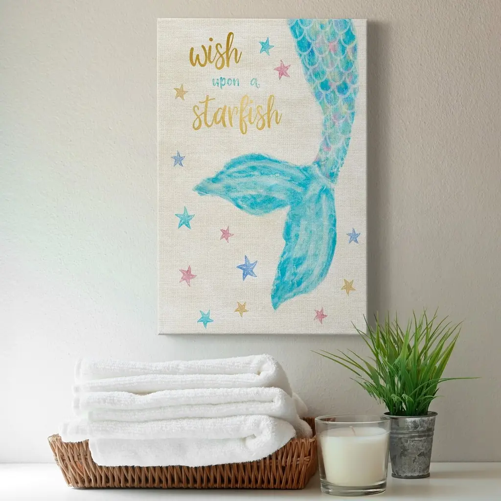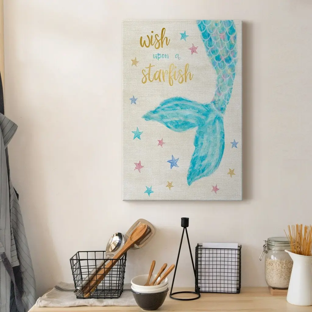 Mermaid Wish Premium Gallery Wrapped Canvas - Ready to Hang A premium hand stretched gallery wrapped canvas print created to last. Featuring a beveled a solid wood stretcher bar, each piece comes ready to hand 5 SIZES AVAILABLE 8''X12'' - Overall Size 16'X20'' - Overall Size 24''x32'' - Overall Size 30''x40'' - Overall Size 36''x48'' - Overall Size Each piece is made to order. Built to Last Each piece comes ready to hang Solid wood stretcher Fade and Water resistant Made domestically