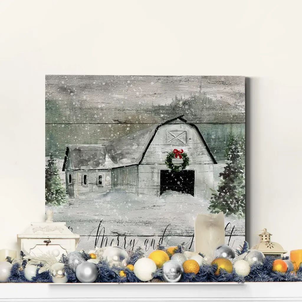 Bring the Christmas spirit to your home with the Merry and Bright Barn-Premium Gallery Wrapped Canvas. This premium hand-stretched canvas print is built to last and features a beveled solid wood stretcher bar. It is fade and water-resistant and comes in 5 different sizes. Each piece is made to order and is ready to hang, making it a perfect addition to your holiday decor.Features: