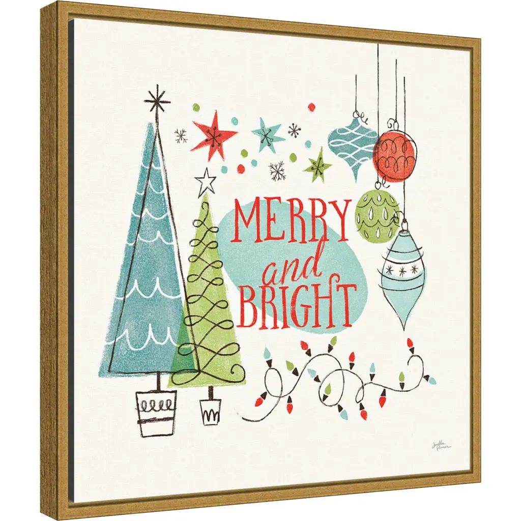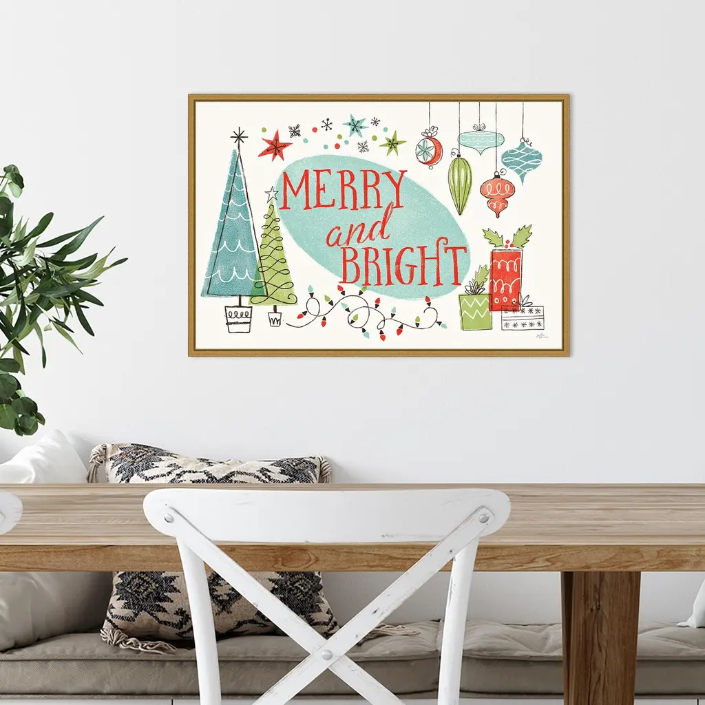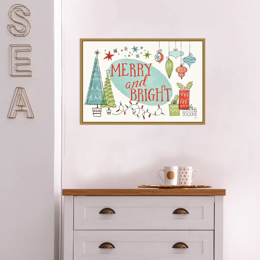 This vintage stylized painting offers mid-century, jazzy charm. Black line art of trees, gifts, stars, ornaments and lights are presented in a funky style with color blocking set on a light brown background. In the center, a turquoise oval features "MERRY AND BRIGHT" in red, stylish lettering for a Yuletide that is both merry and funky.Features:FLOAT FRAMED CANVAS ART: Canvas is framed in a floated style that showcases a narrow gap between the edge of the gallery wrapped canvas and the frame. The wrapped canvas appears as if it's "floating" on the frame. The overall look is clean, modern and upscale.QUALITY: Canvas is printed with high quality, fade-resistant inks and stretched to hide corner folds. Canvas is stretched across a solid surface to resist sagging.AUTHENTICITY: Canvas is printed and professionally framed in Madison, Wisconsin USA with authentically licensed artwork.EFFORTLESS HANGING: Ready to hangfor easy installation. The metal sawtooth hangers come attached on the inset back for easy wall display.CUSTOM PACKAGED: Canvas is custom packaged for protection in shipment to arrive without damage.Details:Artist: Janelle PennerTitle: Merry and Bright Christmas TreeProduct type: Framed Canvas BoxStyle: Modern ContemporaryFormat: landscapeSize: SmallSubject: VintageFrame: Sylvie Gold .5"